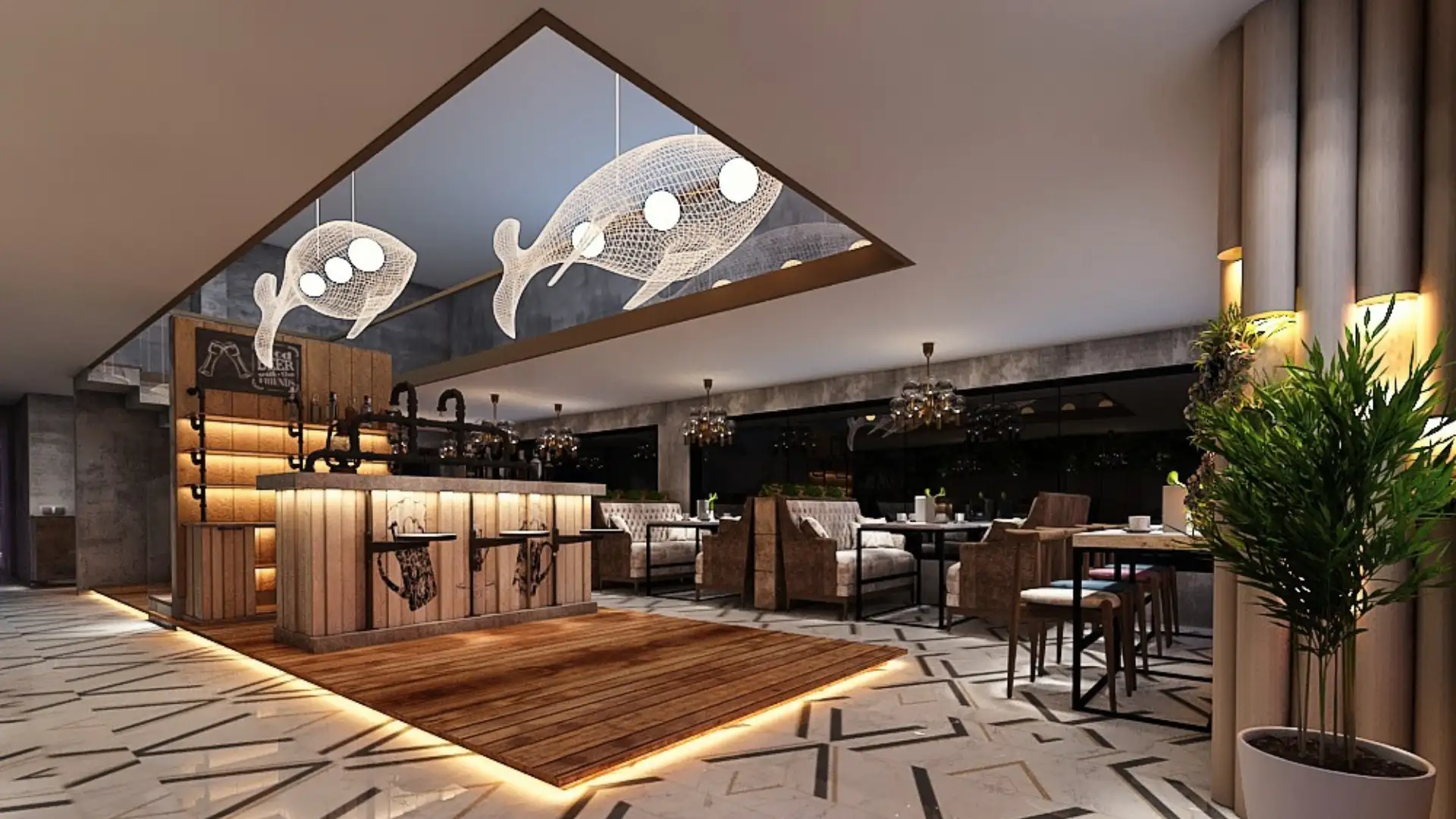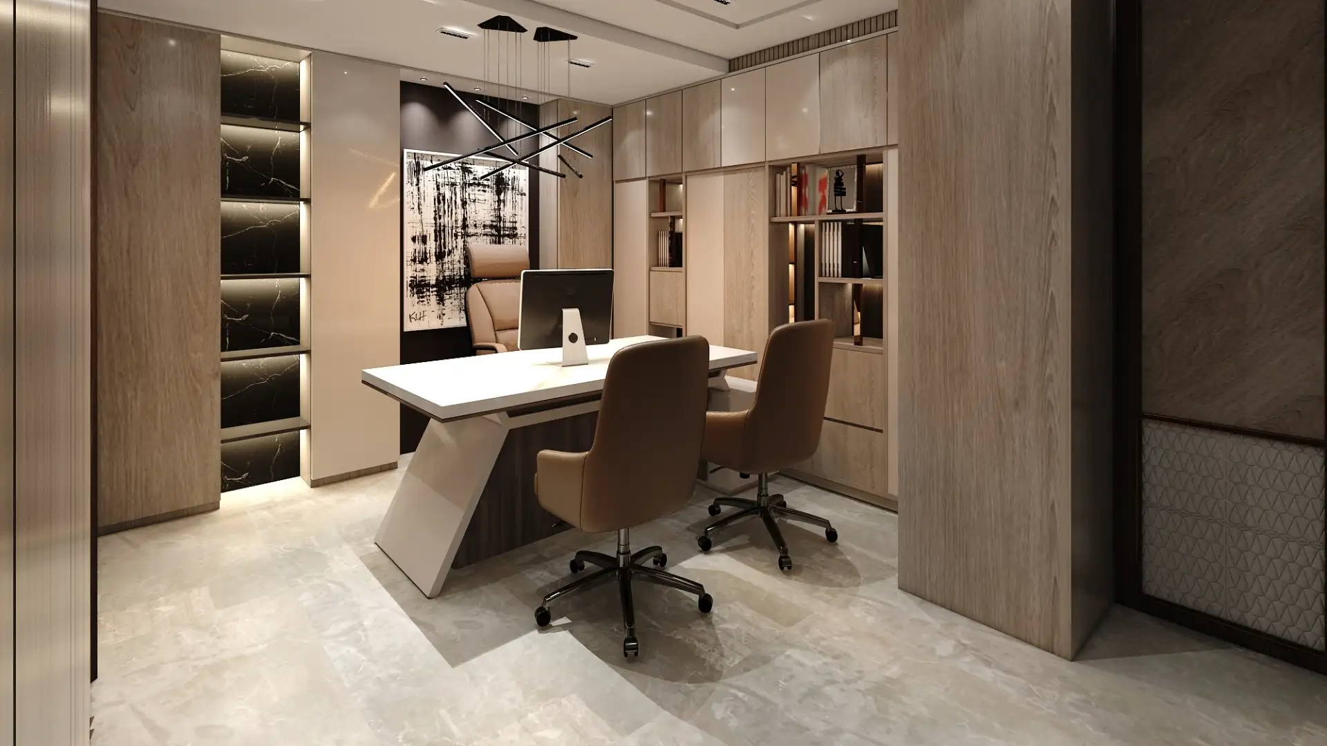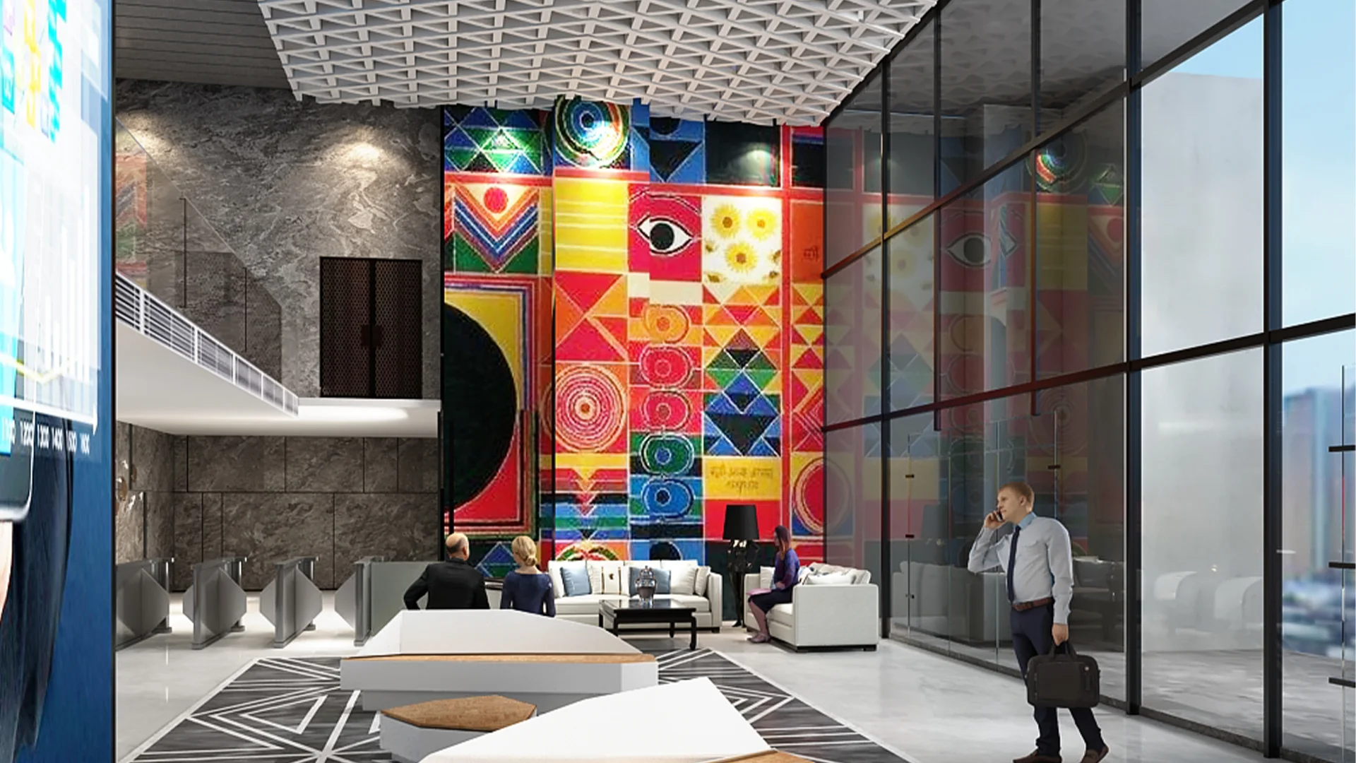 This modern workspace features a sophisticated lounge area with sleek furniture and artistic decor. Adjacent glass-walled meeting rooms add a professional vibe, enhanced by contemporary lighting fixtures. The design emphasizes openness and functionality, with luxurious finishes, geometric patterns, and neutral tones that exude elegance and comfort, ideal for collaborative and private workspaces.