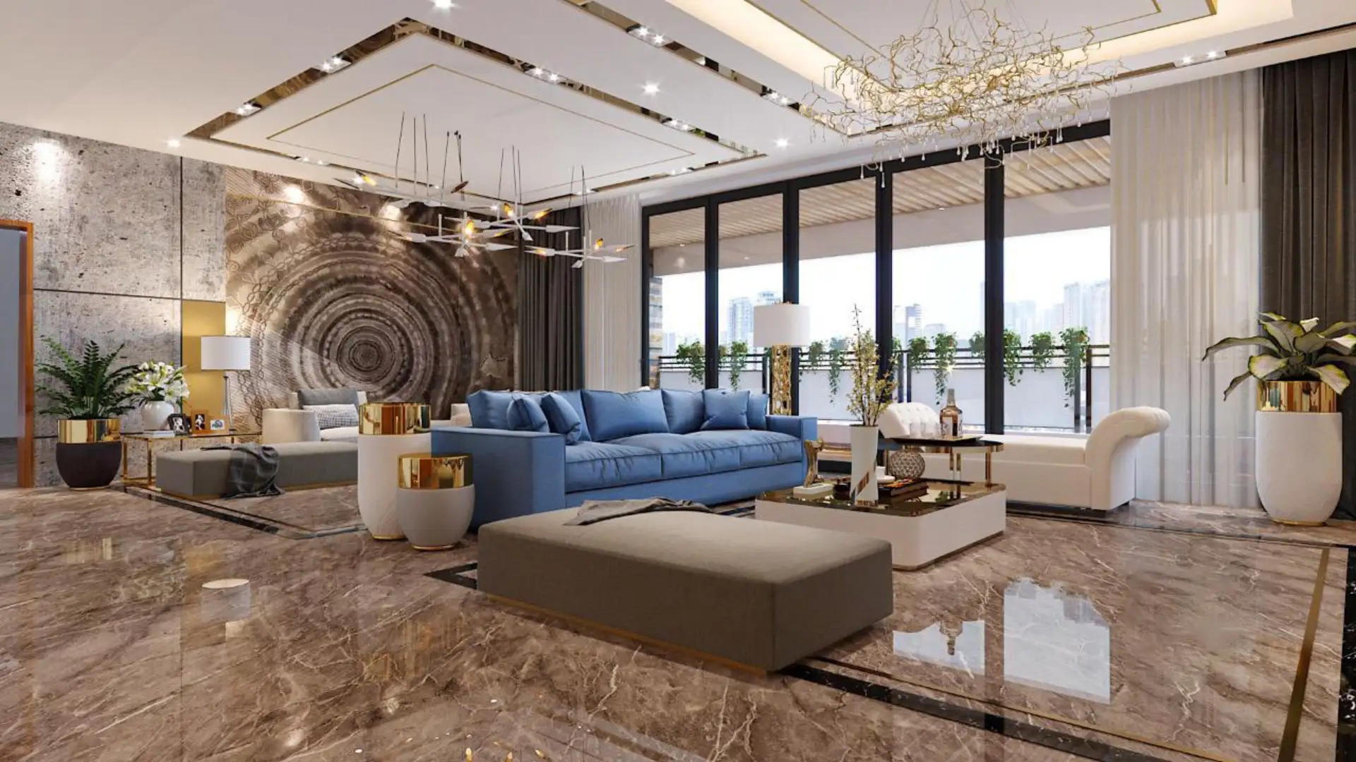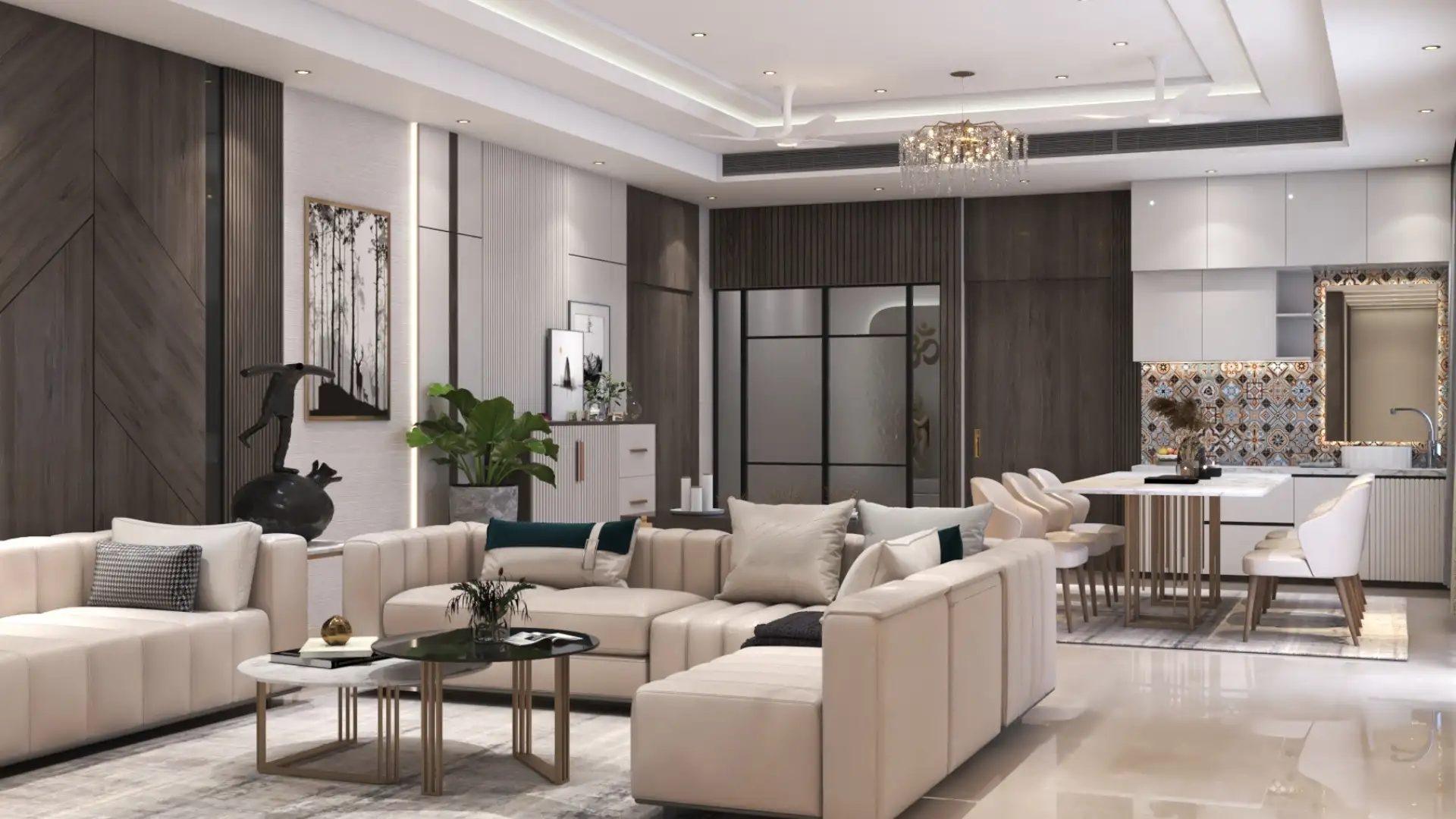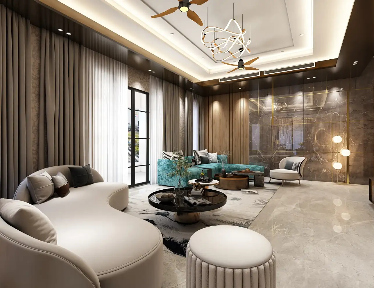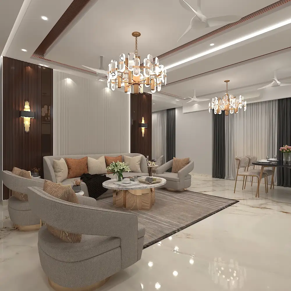 This sophisticated living room showcases a harmonious blend of neutral tones and modern aesthetics. Designed for comfort and elegance, it features plush modular seating, textured curtains, and warm ambient lighting. The ceiling design, natural stone center table, and accent wall with wood-cut art elements add a luxurious touch, creating a serene yet contemporary space ideal for both relaxation and entertaining.