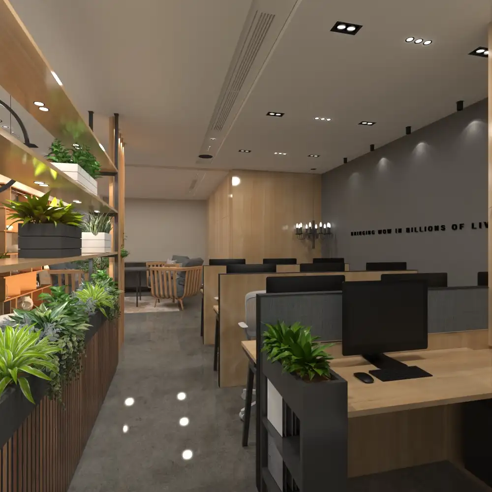 This neo-classic office space combines elegance with functionality. It features sleek wooden furniture, modular workstations, and warm tones balanced by modern design elements like geometric ceiling patterns and contemporary lighting. Glass partitions and natural accents like greenery enhance the space’s sophistication while maintaining openness. The design fosters a professional yet welcoming environment, ideal for a productive workplace.