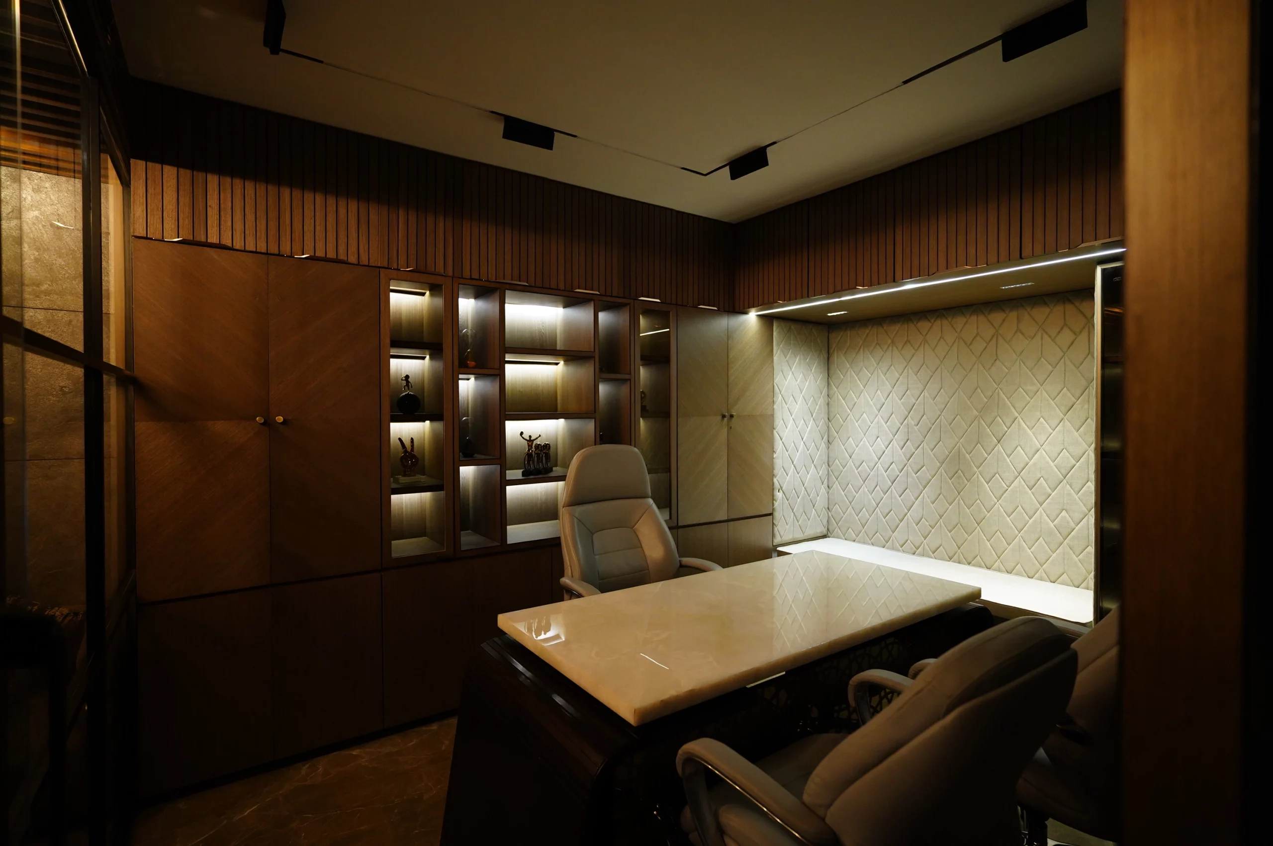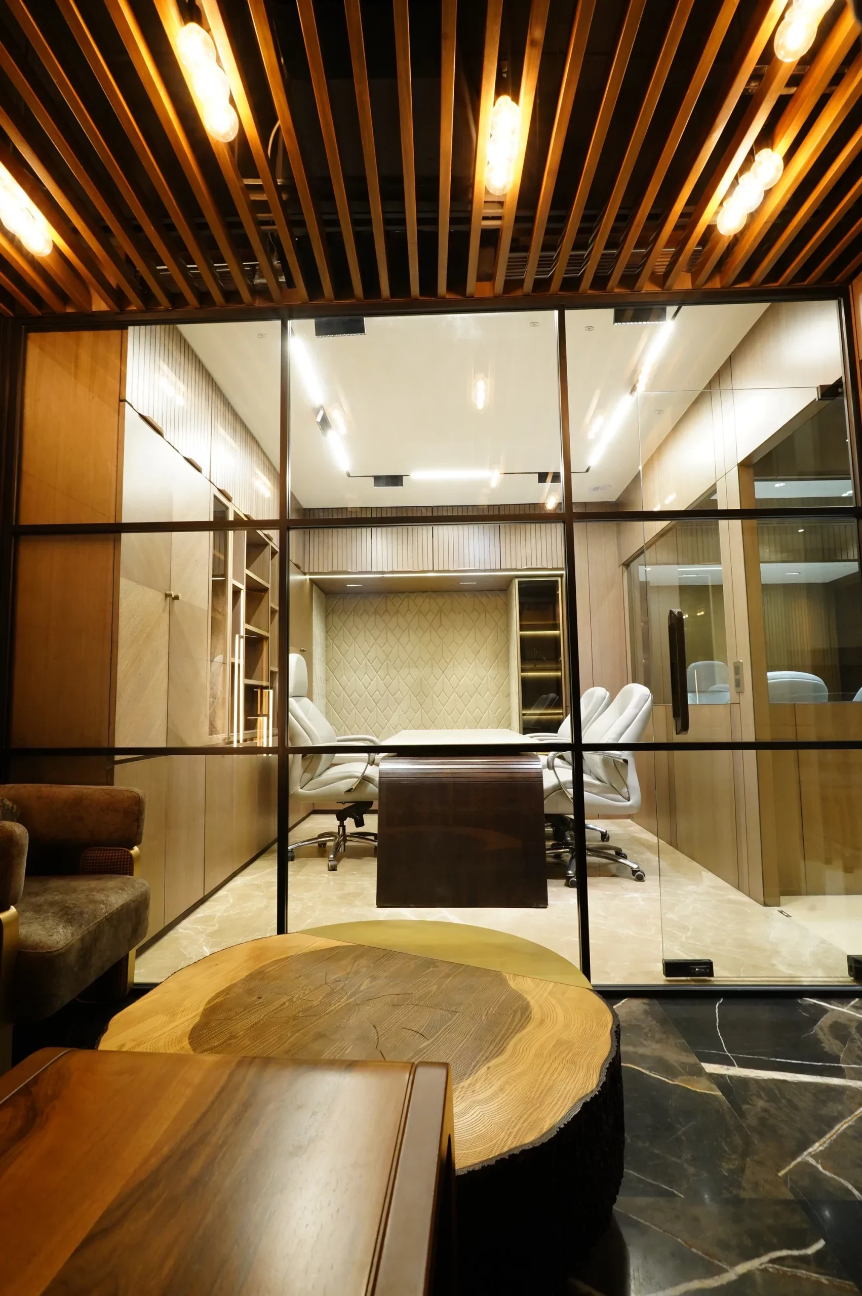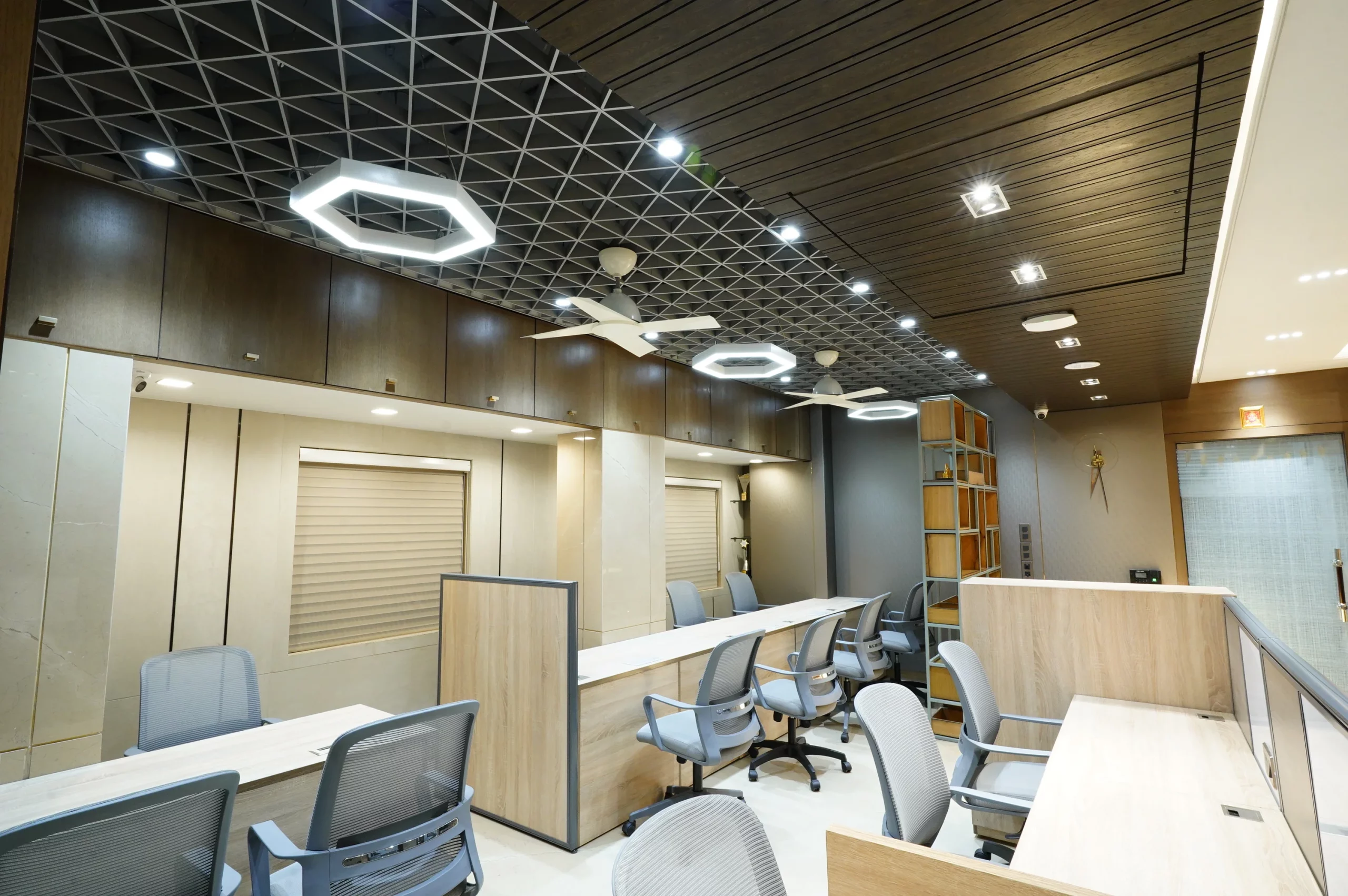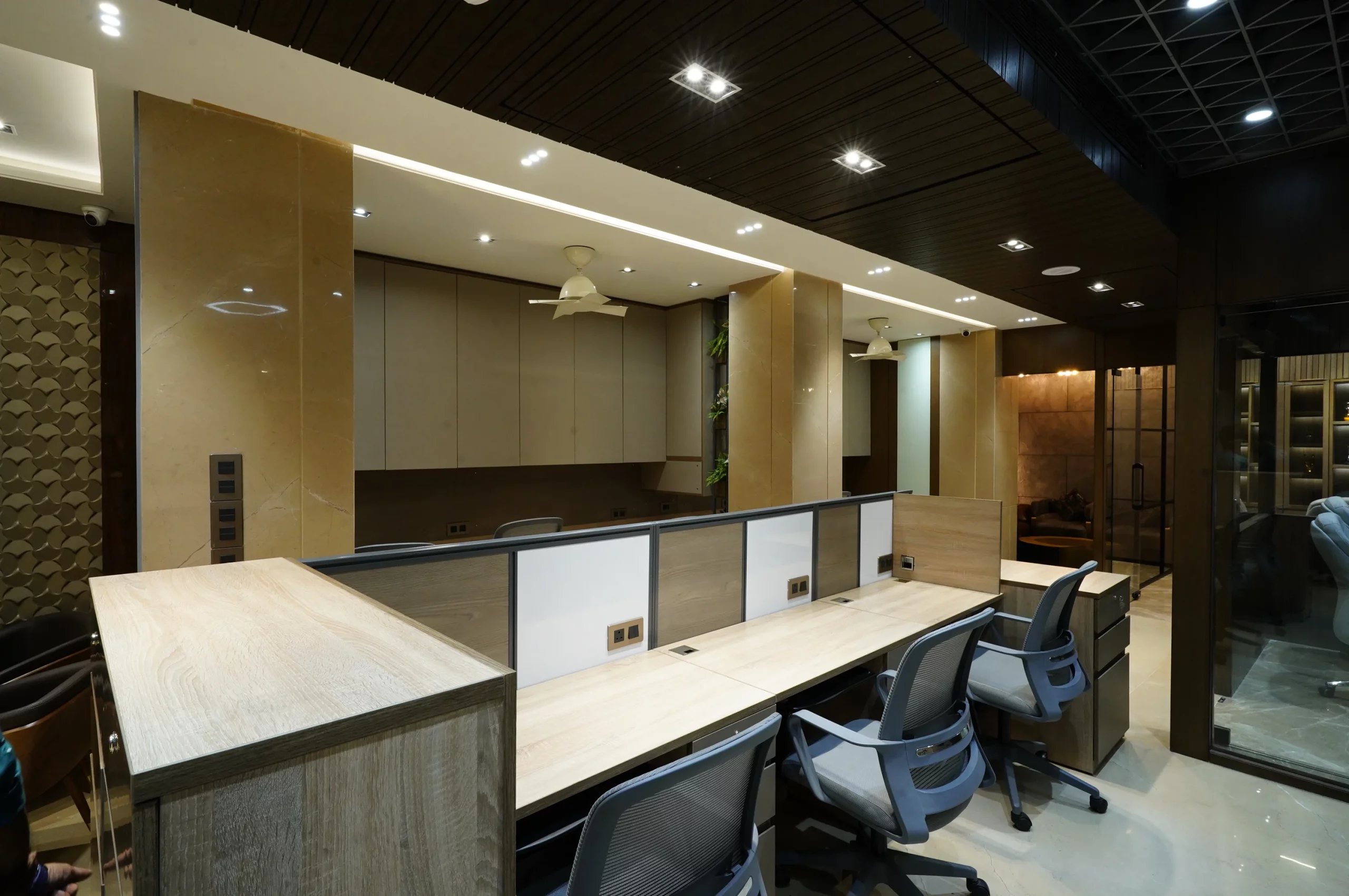 This neo-classic office space combines elegance with functionality. It features sleek wooden furniture, modular workstations, and warm tones balanced by modern design elements like geometric ceiling patterns and contemporary lighting. Glass partitions and natural accents like greenery enhance the space’s sophistication while maintaining openness. The design fosters a professional yet welcoming environment, ideal for a productive workplace.