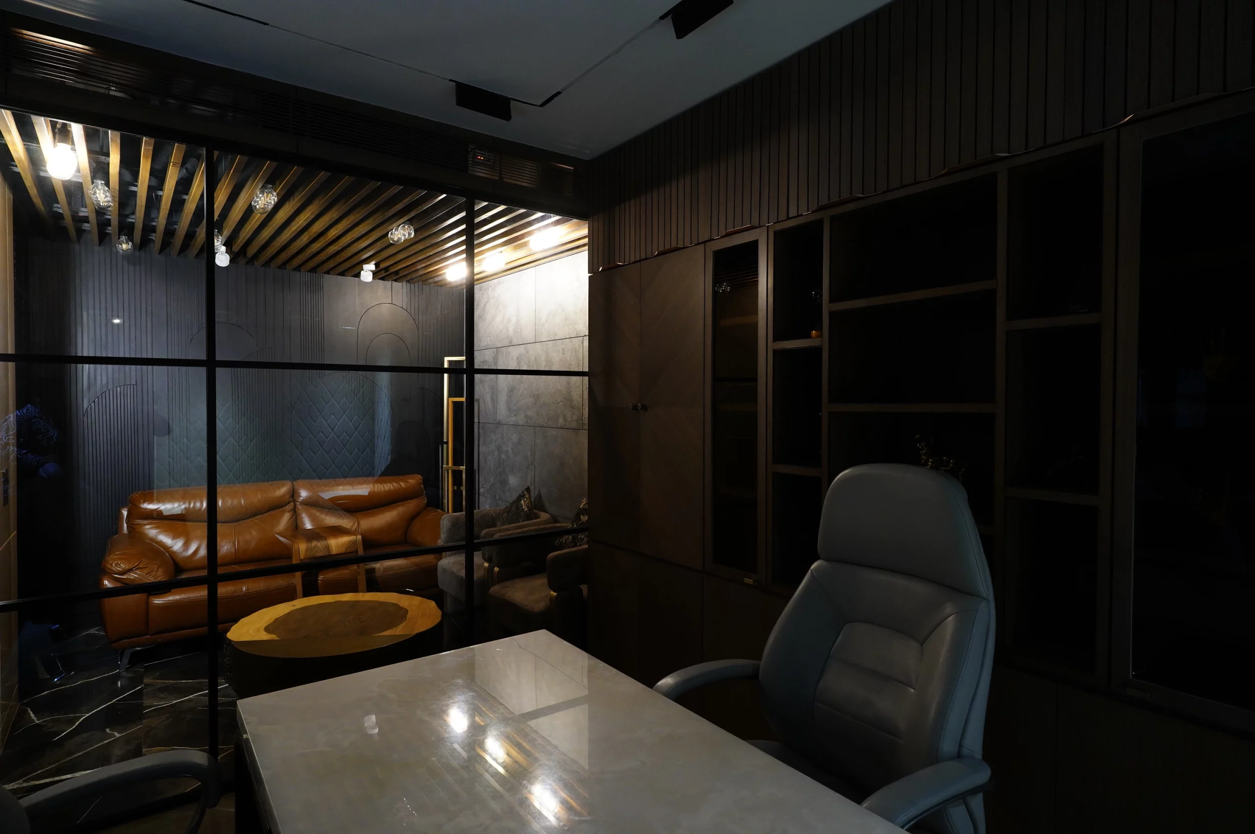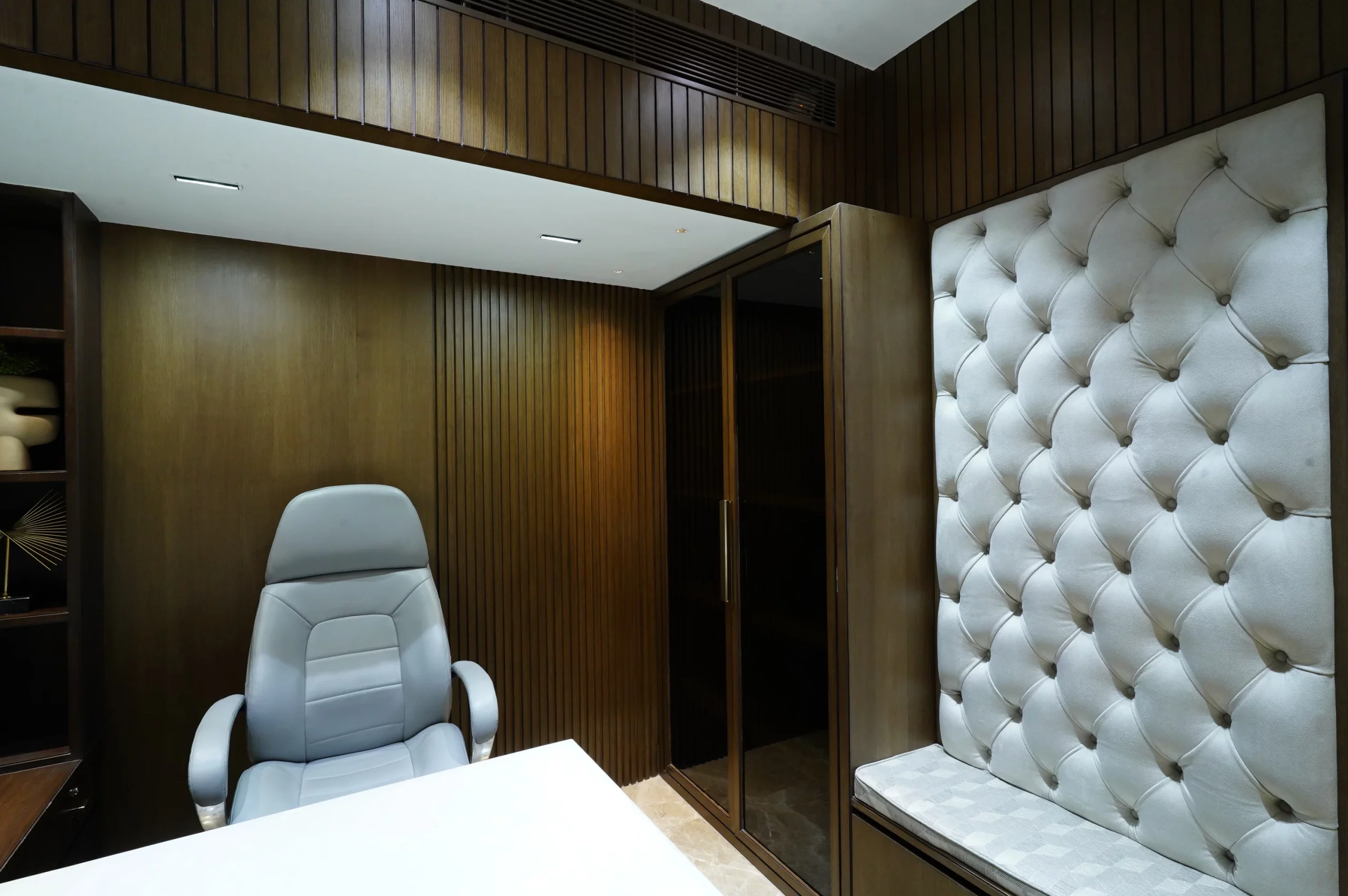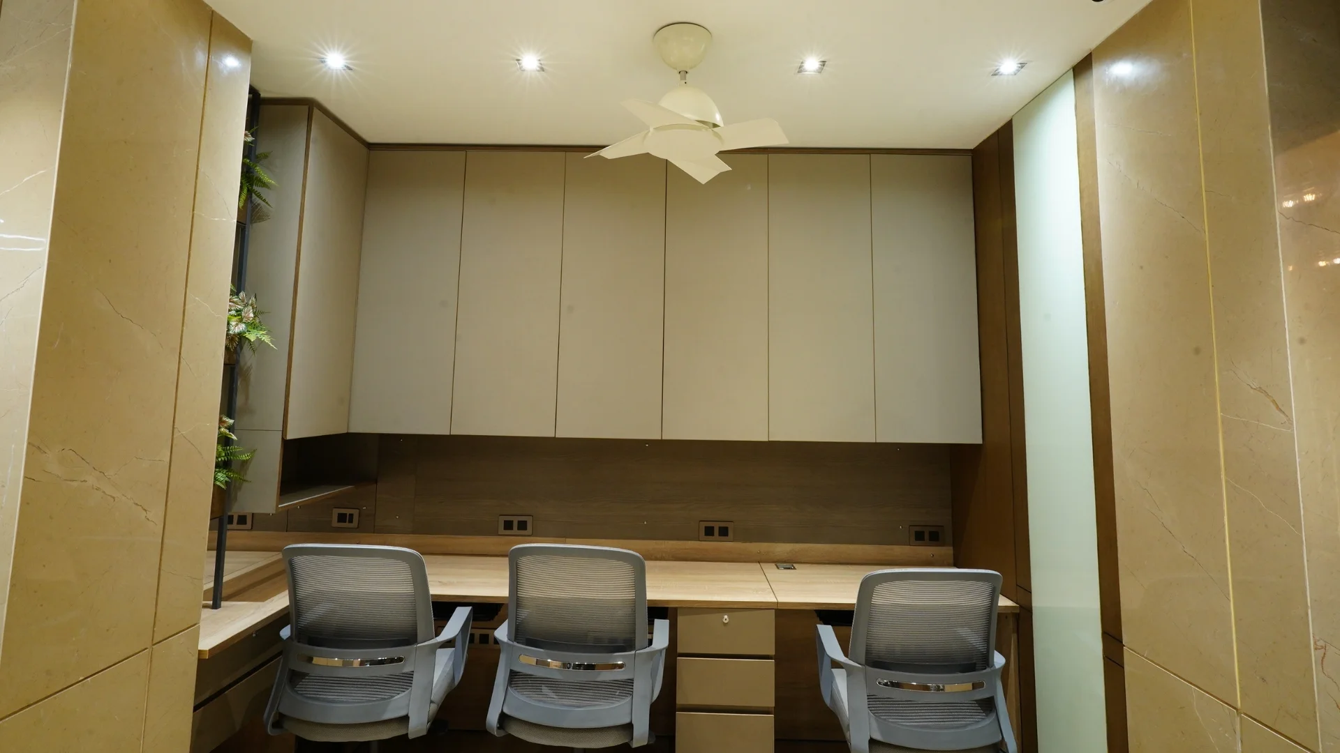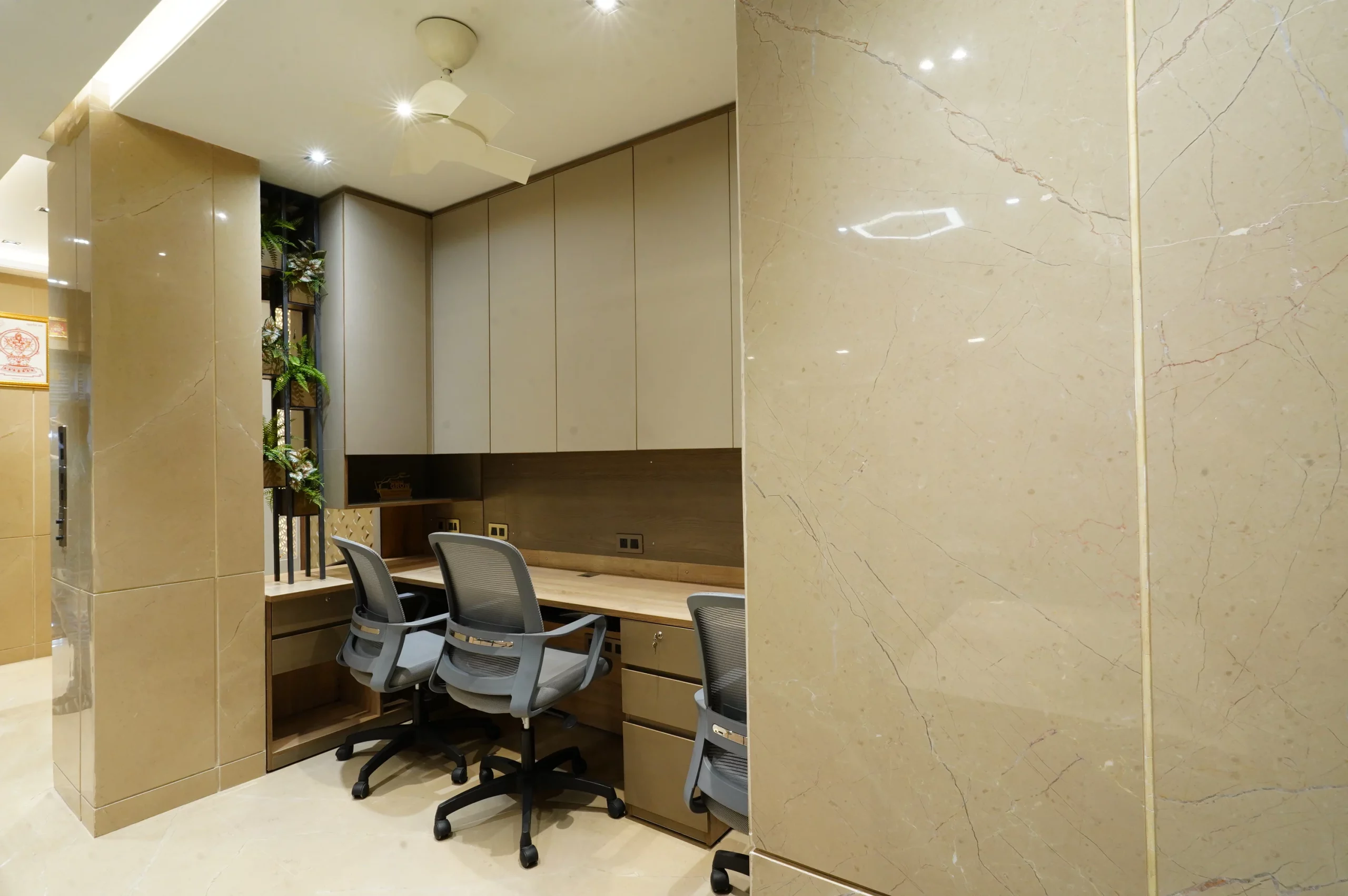 This neo-classic office space combines elegance with functionality. It features sleek wooden furniture, modular workstations, and warm tones balanced by modern design elements like geometric ceiling patterns and contemporary lighting. Glass partitions and natural accents like greenery enhance the space’s sophistication while maintaining openness. The design fosters a professional yet welcoming environment, ideal for a productive workplace.