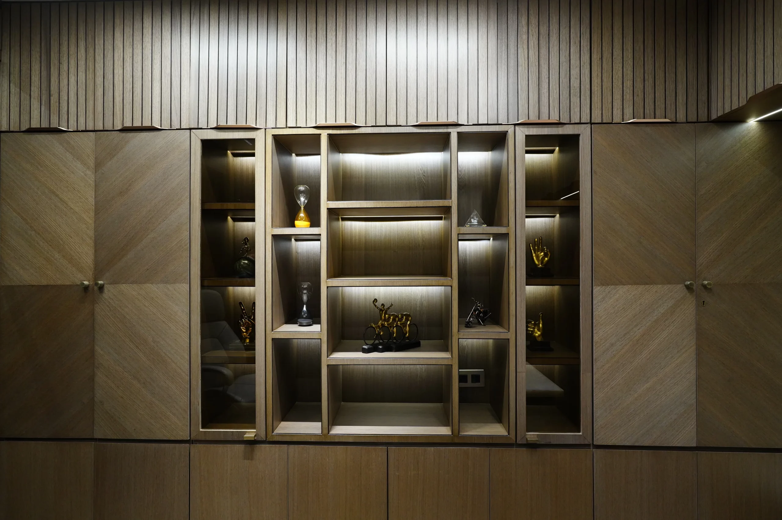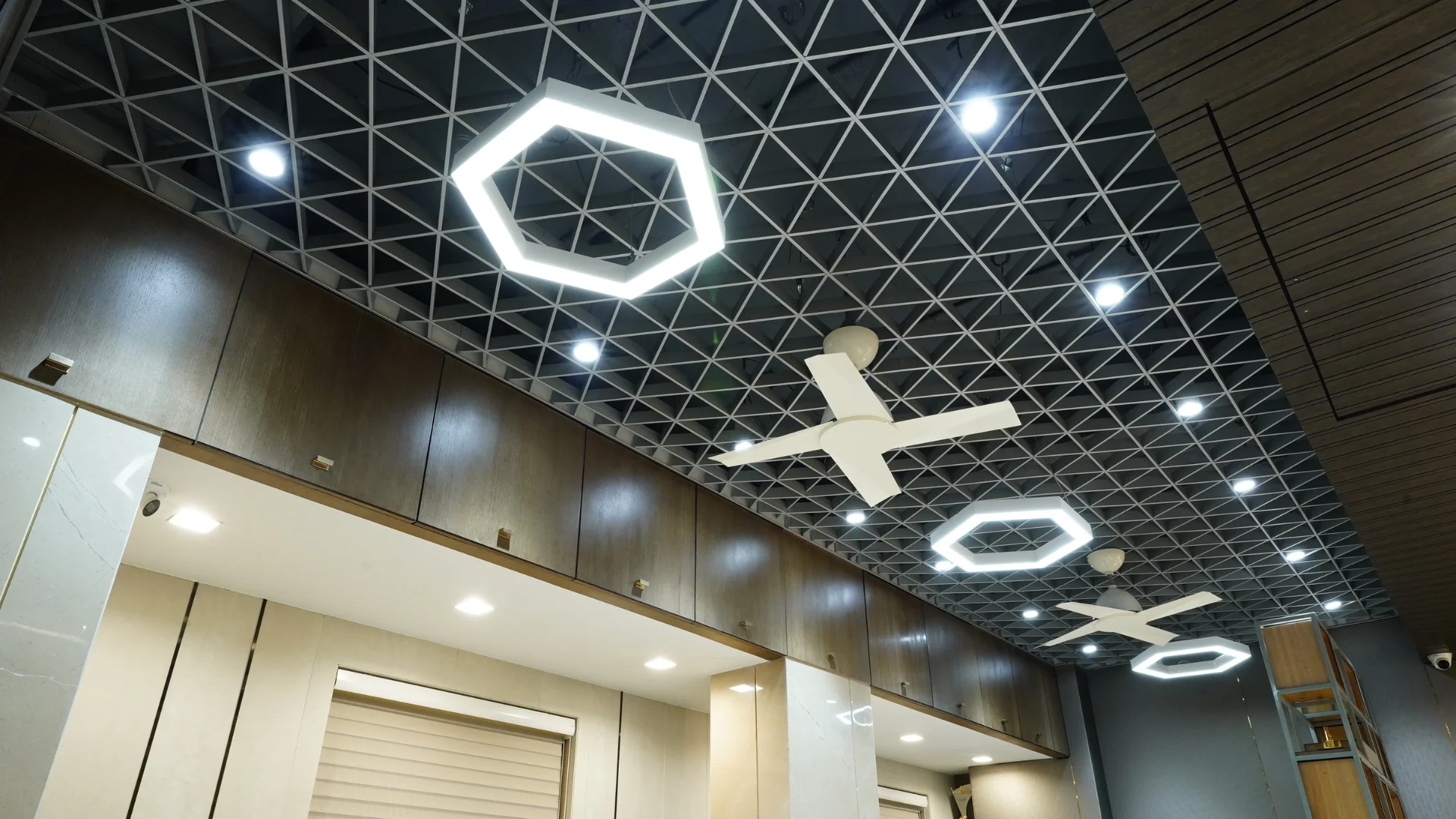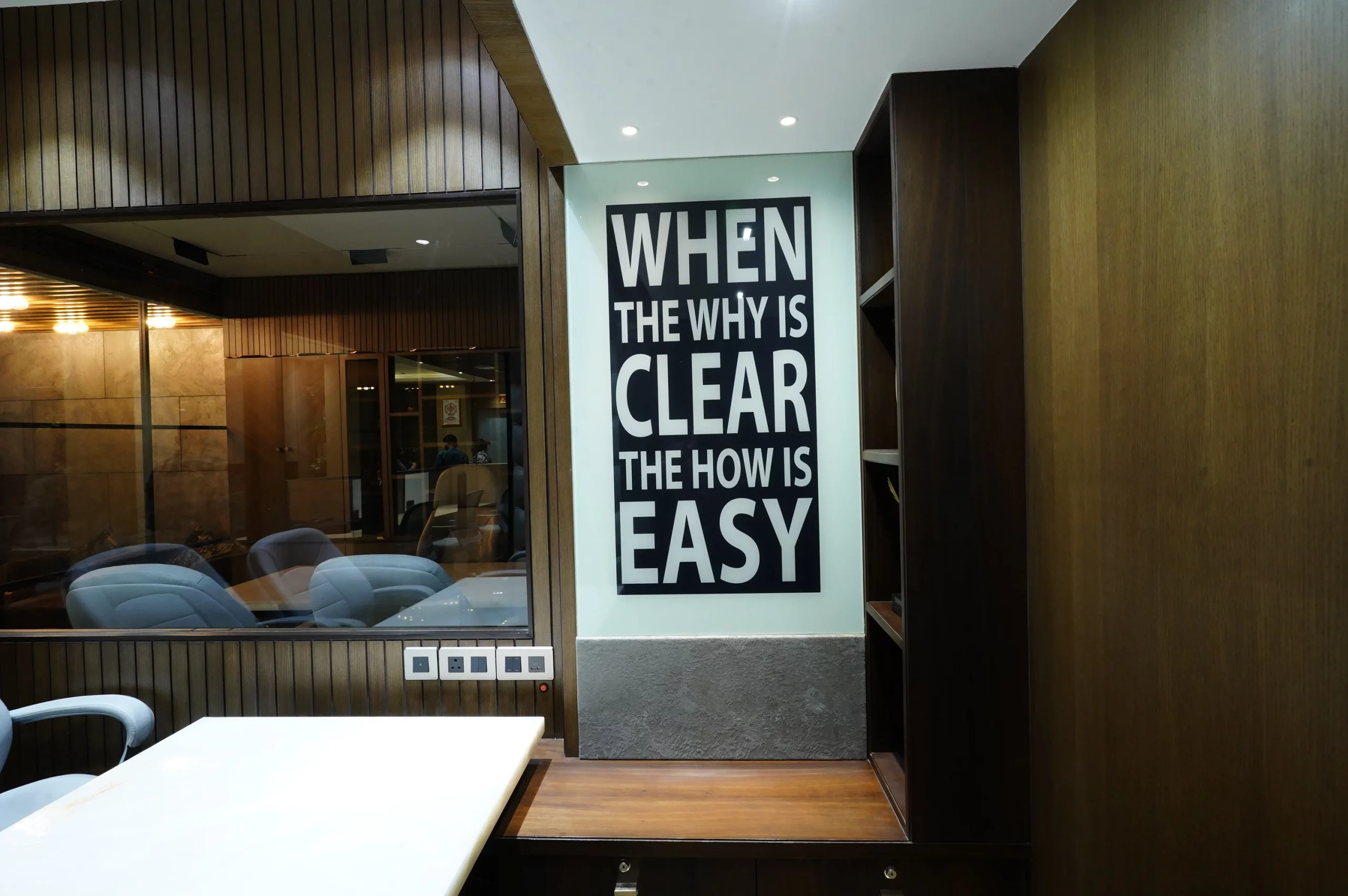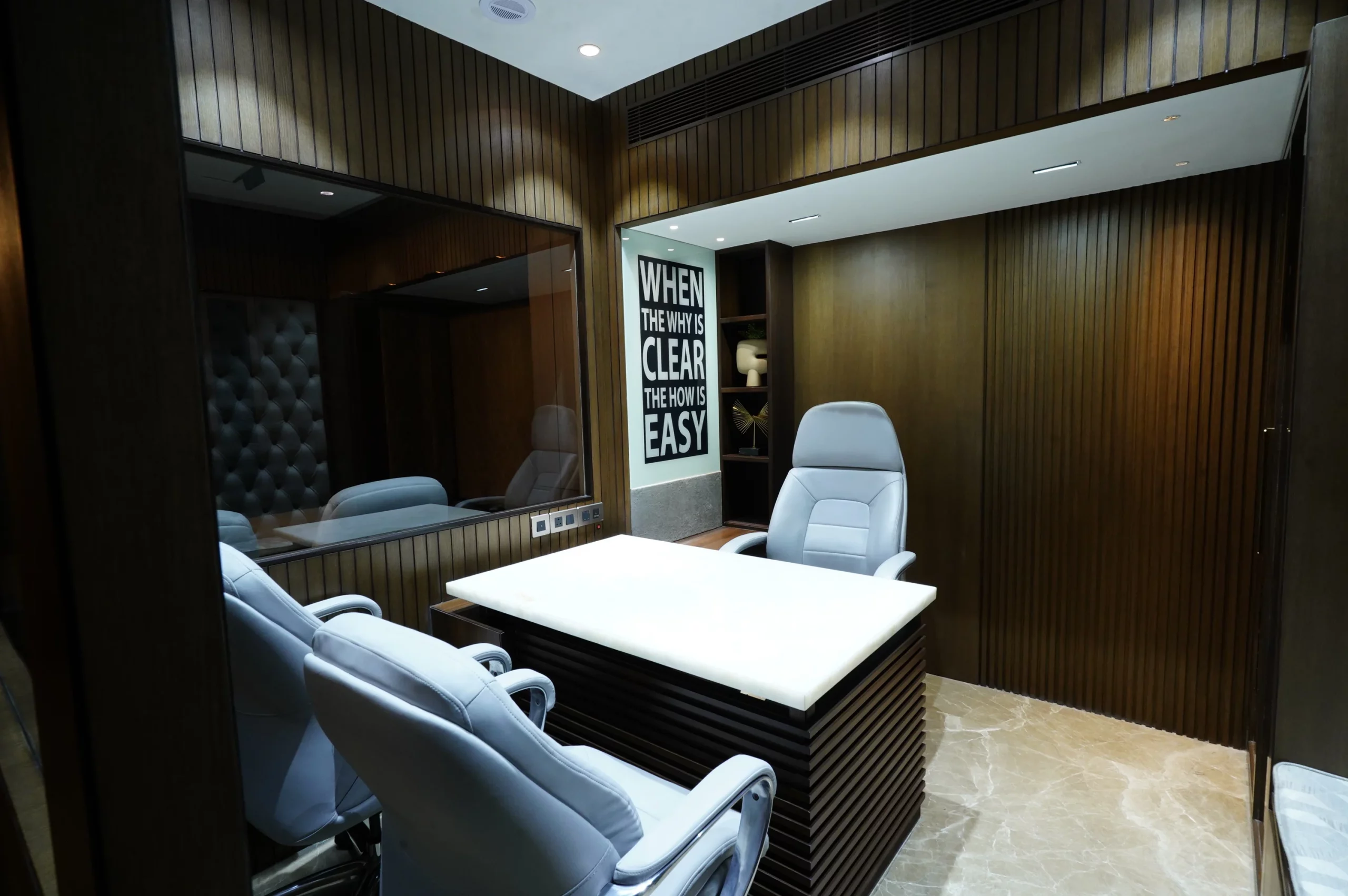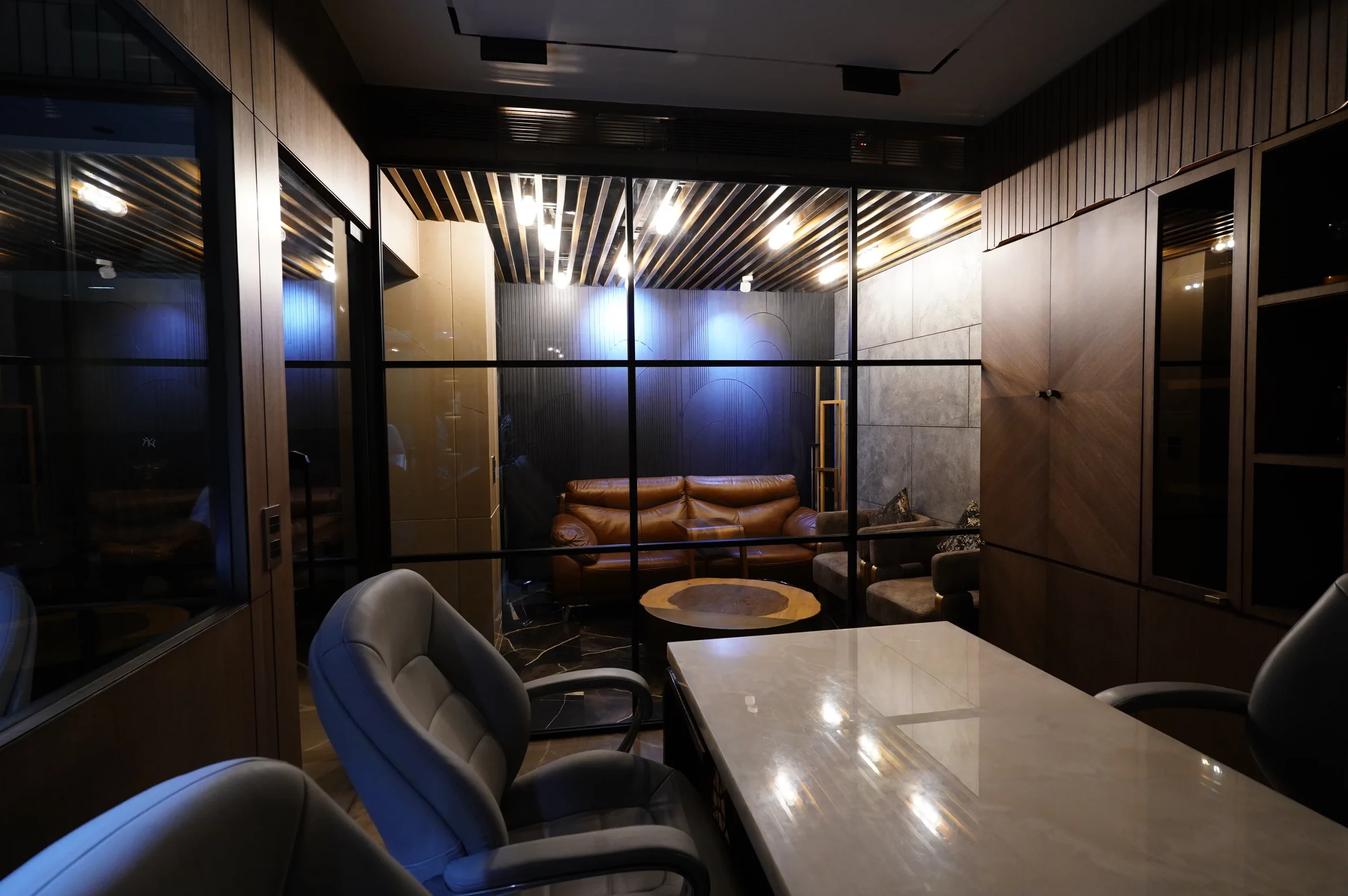 This neo-classic office space combines elegance with functionality. It features sleek wooden furniture, modular workstations, and warm tones balanced by modern design elements like geometric ceiling patterns and contemporary lighting. Glass partitions and natural accents like greenery enhance the space’s sophistication while maintaining openness. The design fosters a professional yet welcoming environment, ideal for a productive workplace.