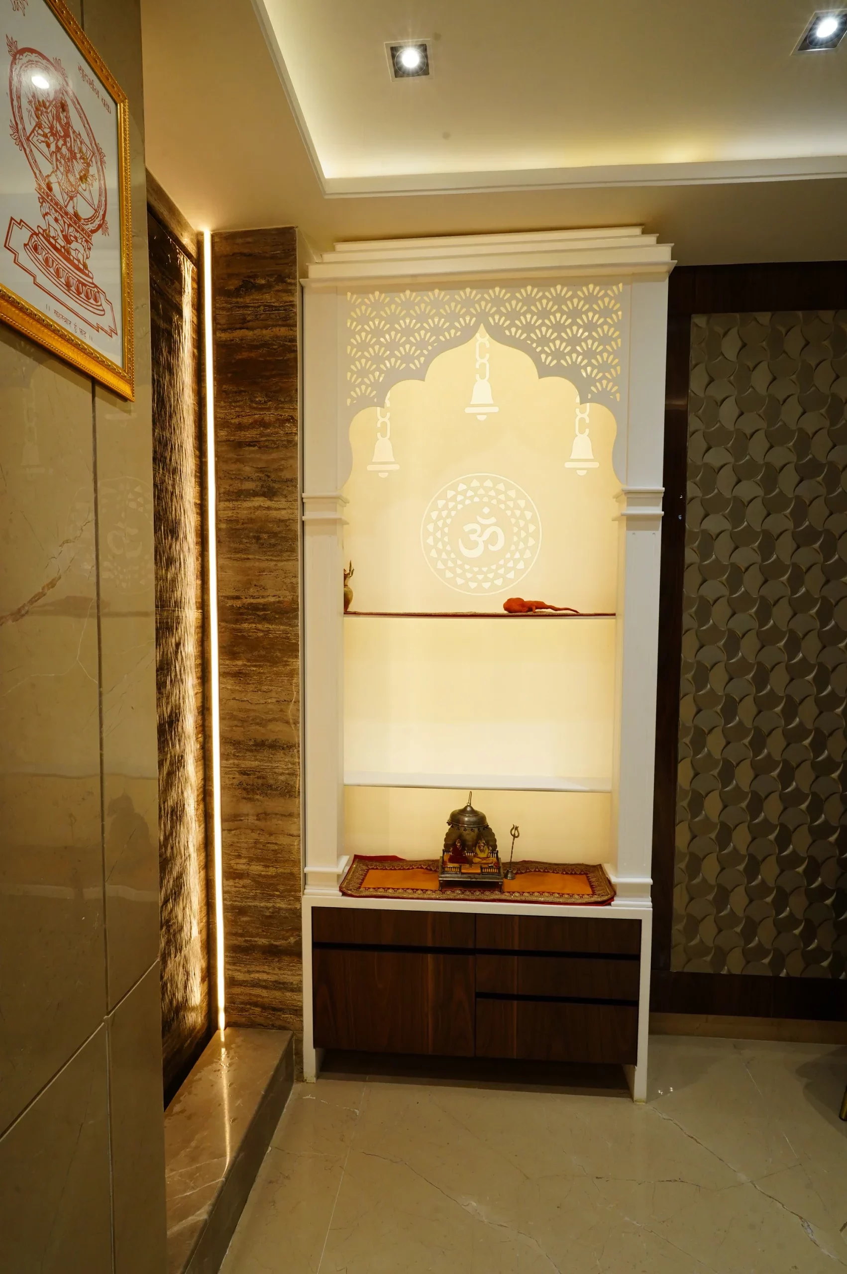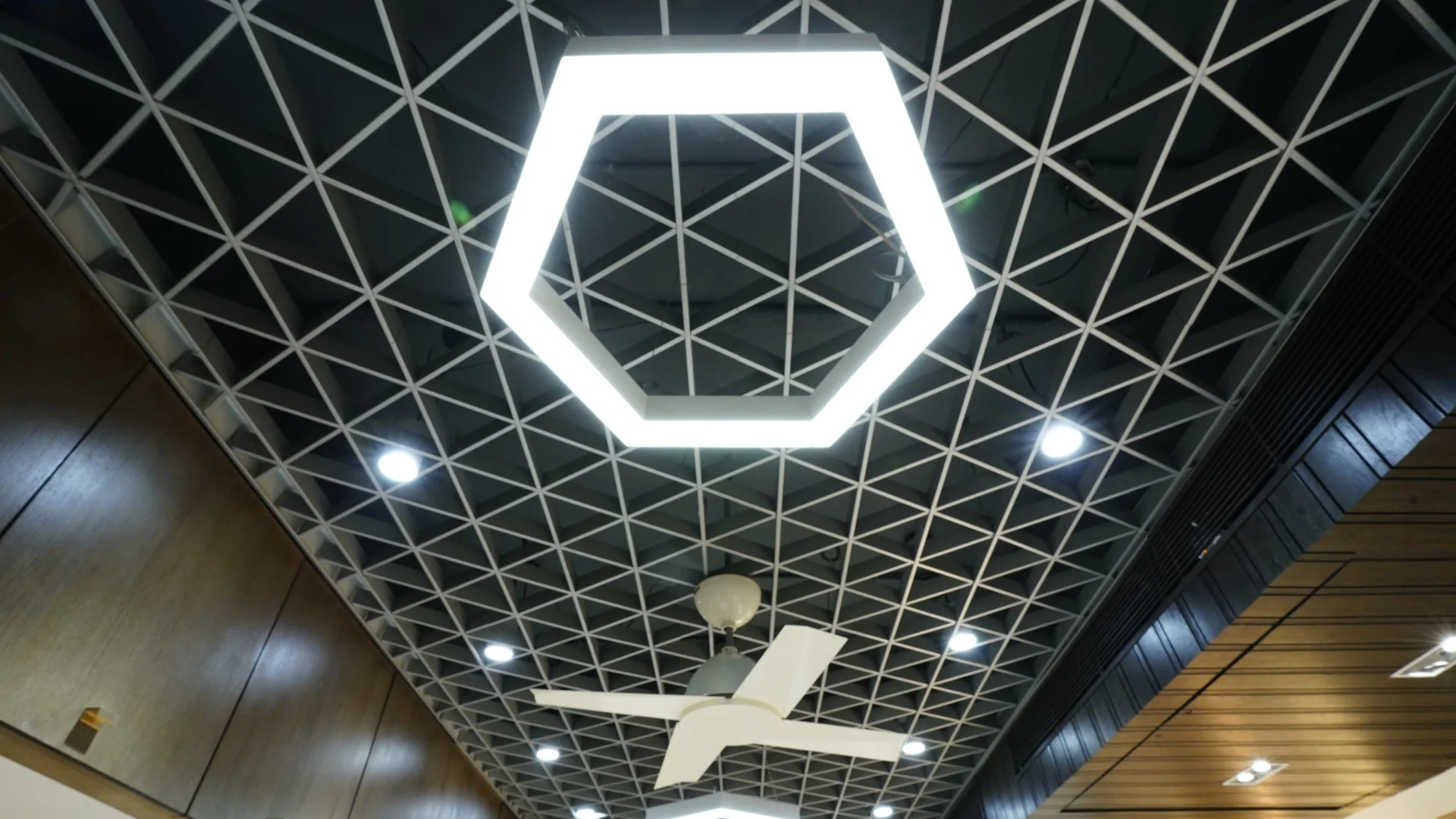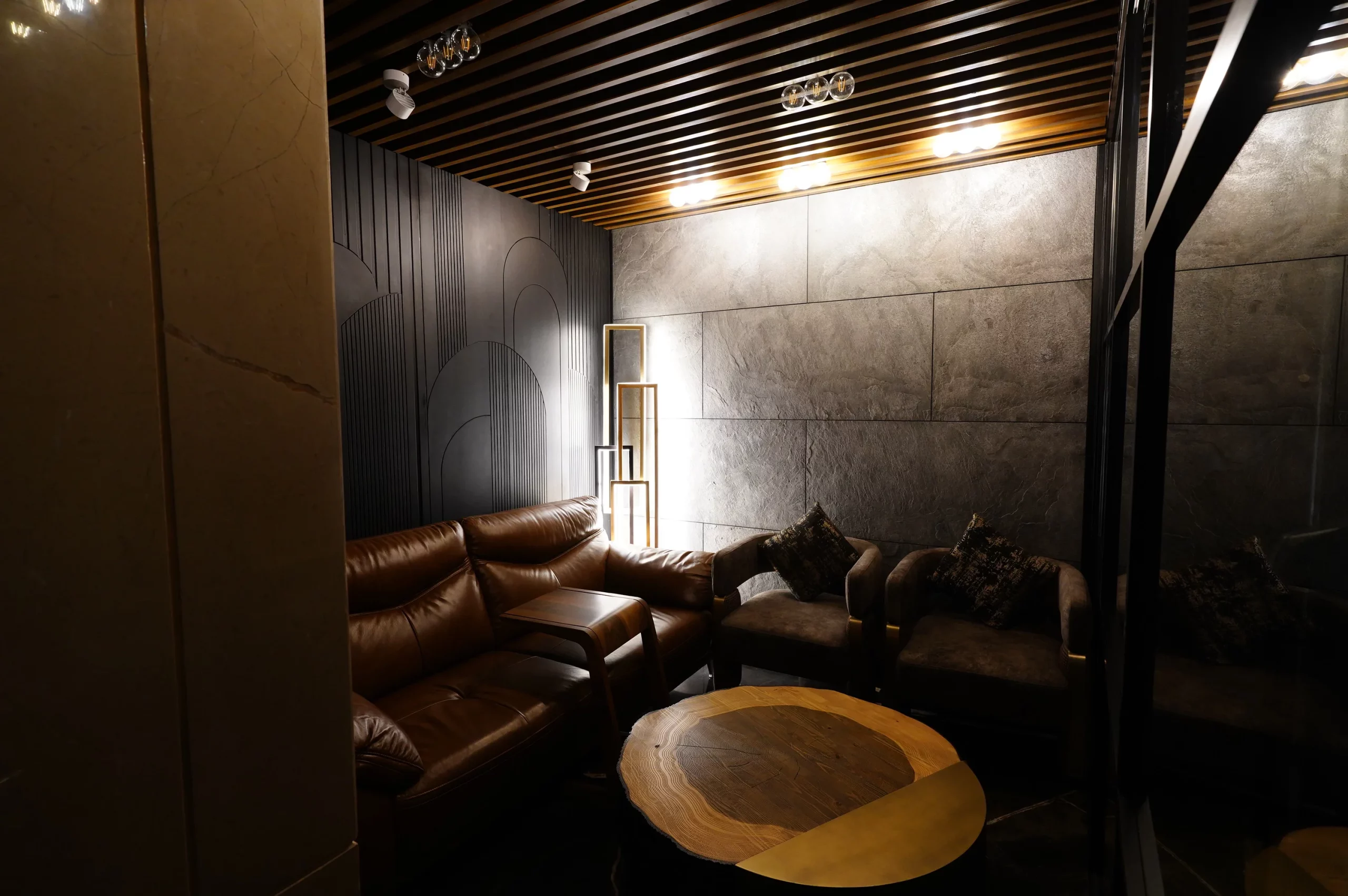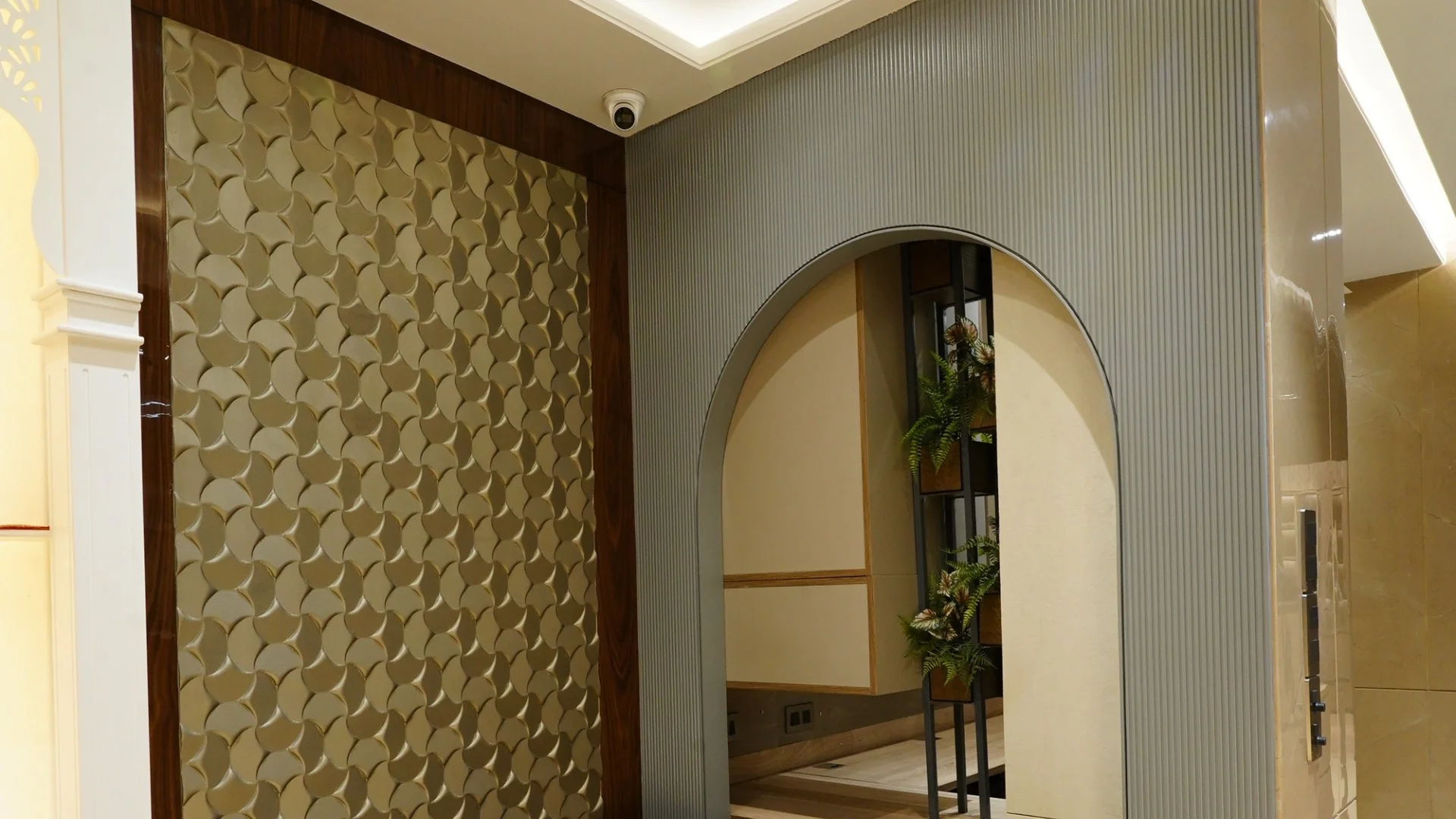 This neo-classic office space combines elegance with functionality. It features sleek wooden furniture, modular workstations, and warm tones balanced by modern design elements like geometric ceiling patterns and contemporary lighting. Glass partitions and natural accents like greenery enhance the space’s sophistication while maintaining openness. The design fosters a professional yet welcoming environment, ideal for a productive workplace.