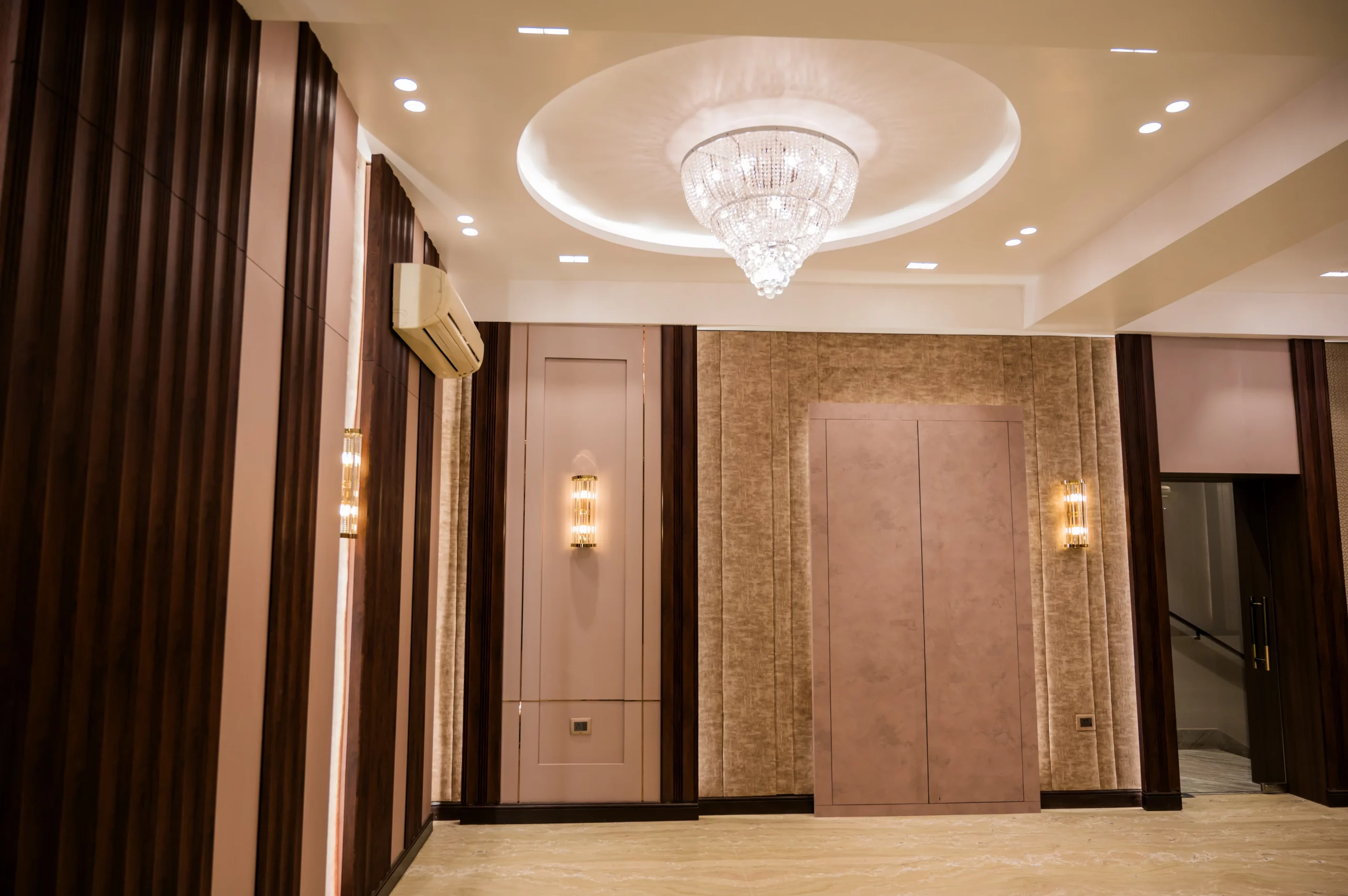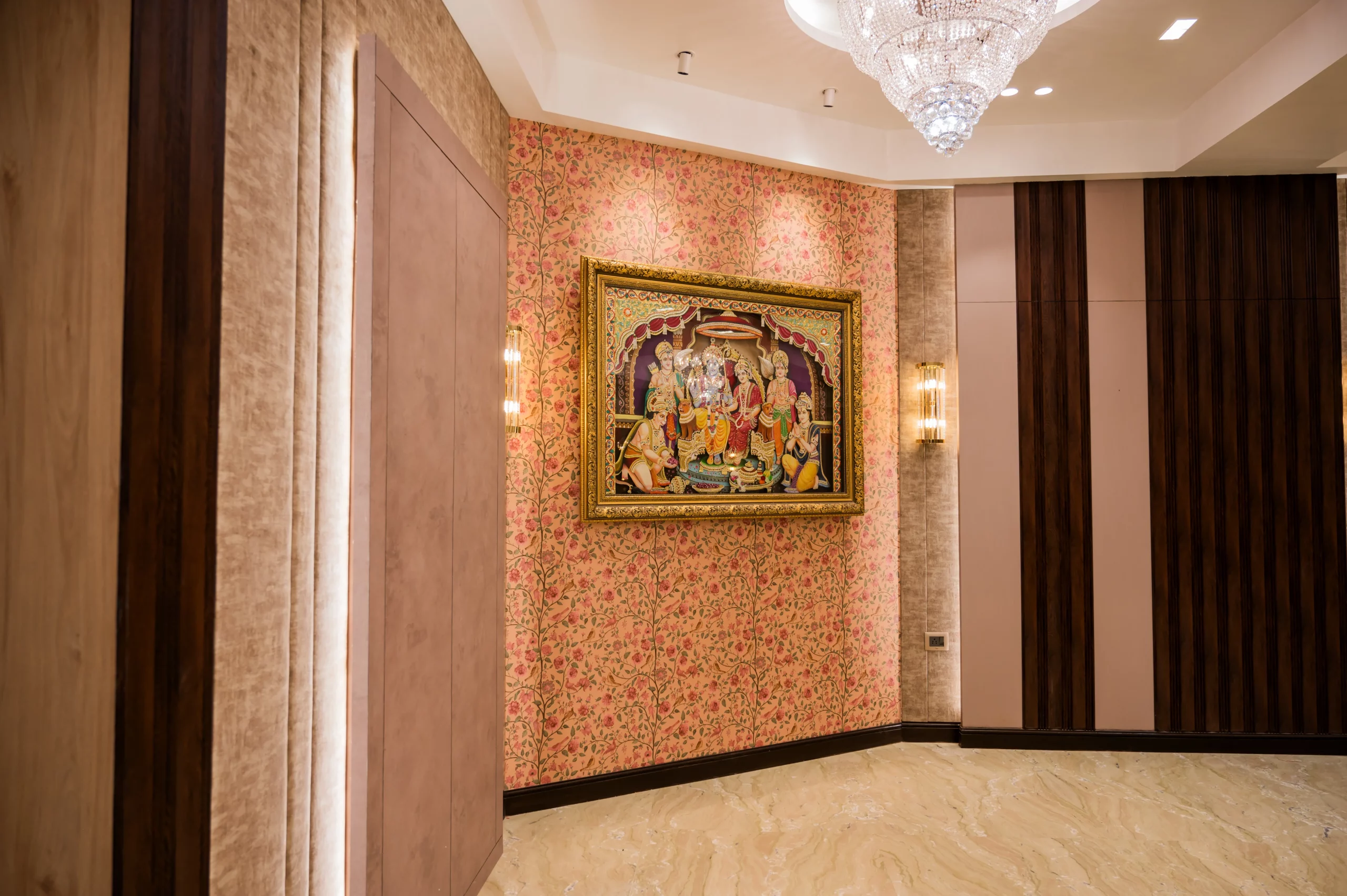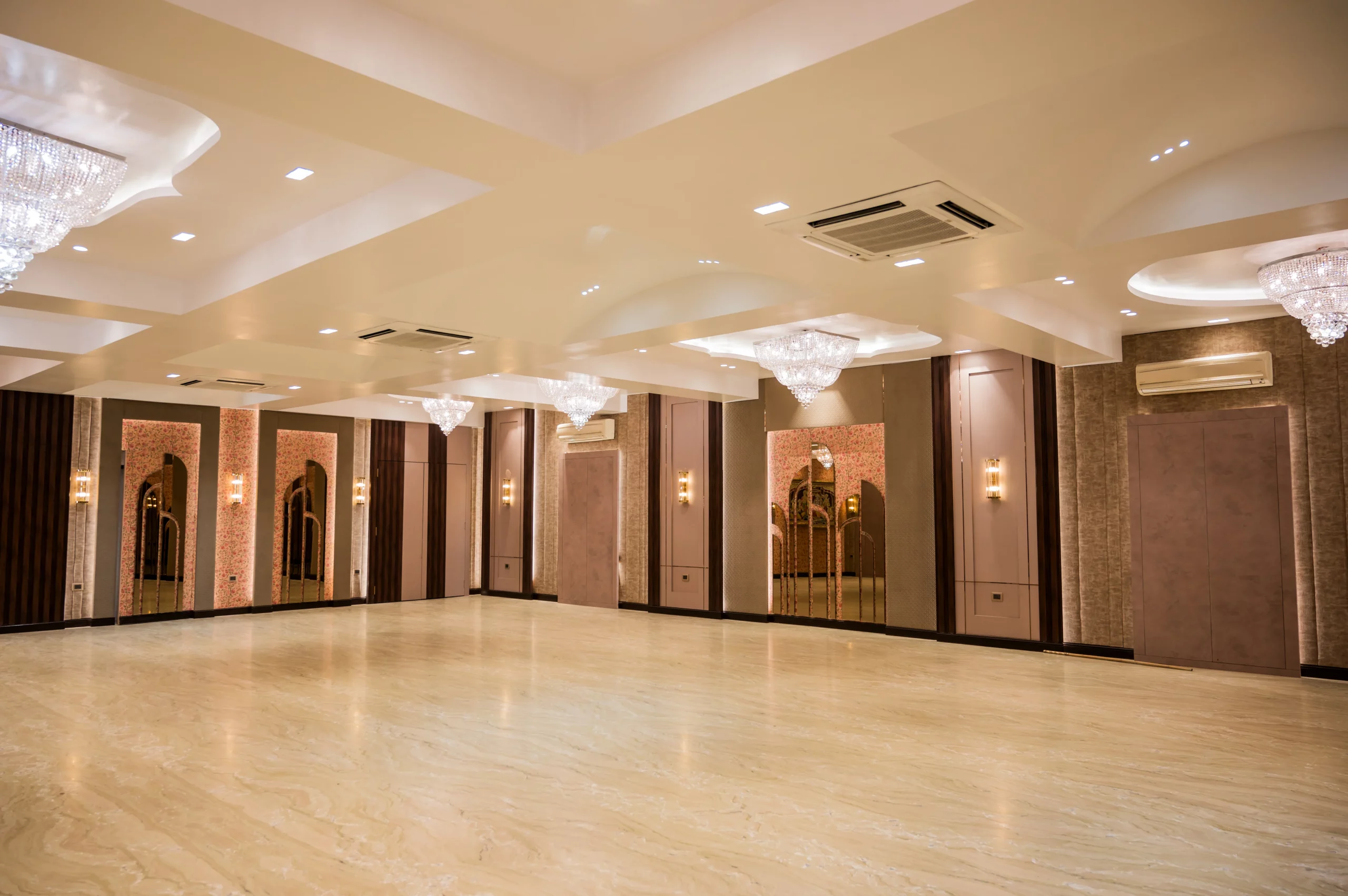 Krishna Vatika Banquet offers a luxurious venue with grand interiors, including polished marble flooring, sparkling chandeliers, and ornate wall designs. The space blends modern elegance with traditional accents, featuring ample room for gatherings, celebrations, and events. Its sophisticated ambiance ensures a premium experience for weddings, receptions, and corporate functions.
