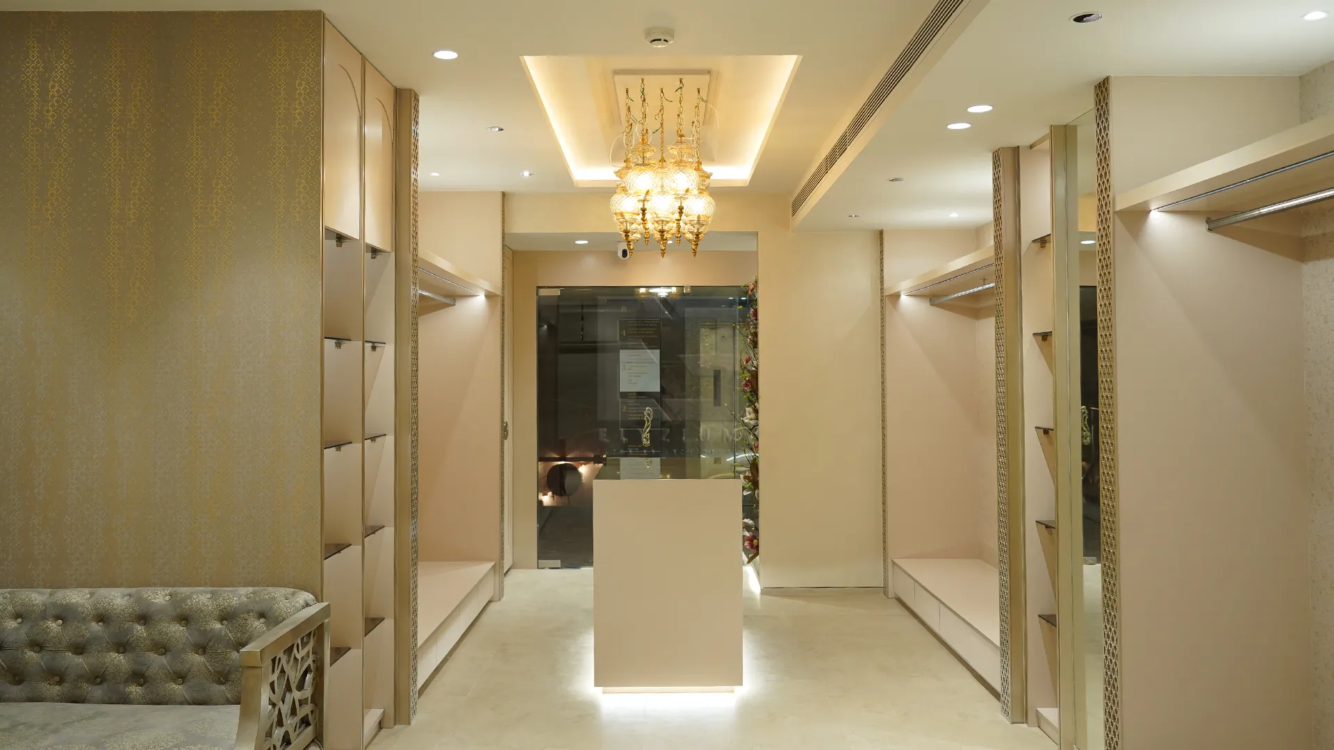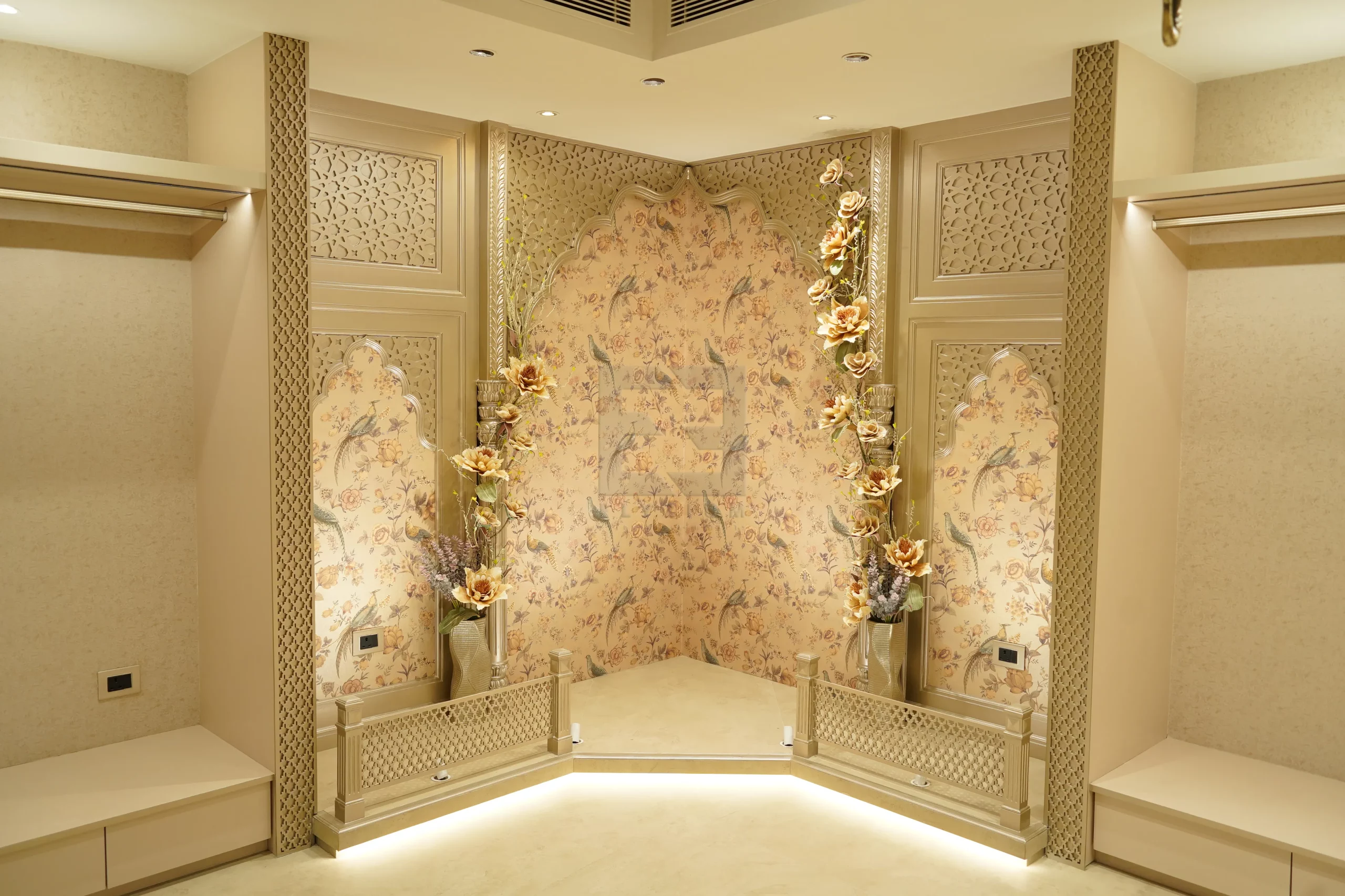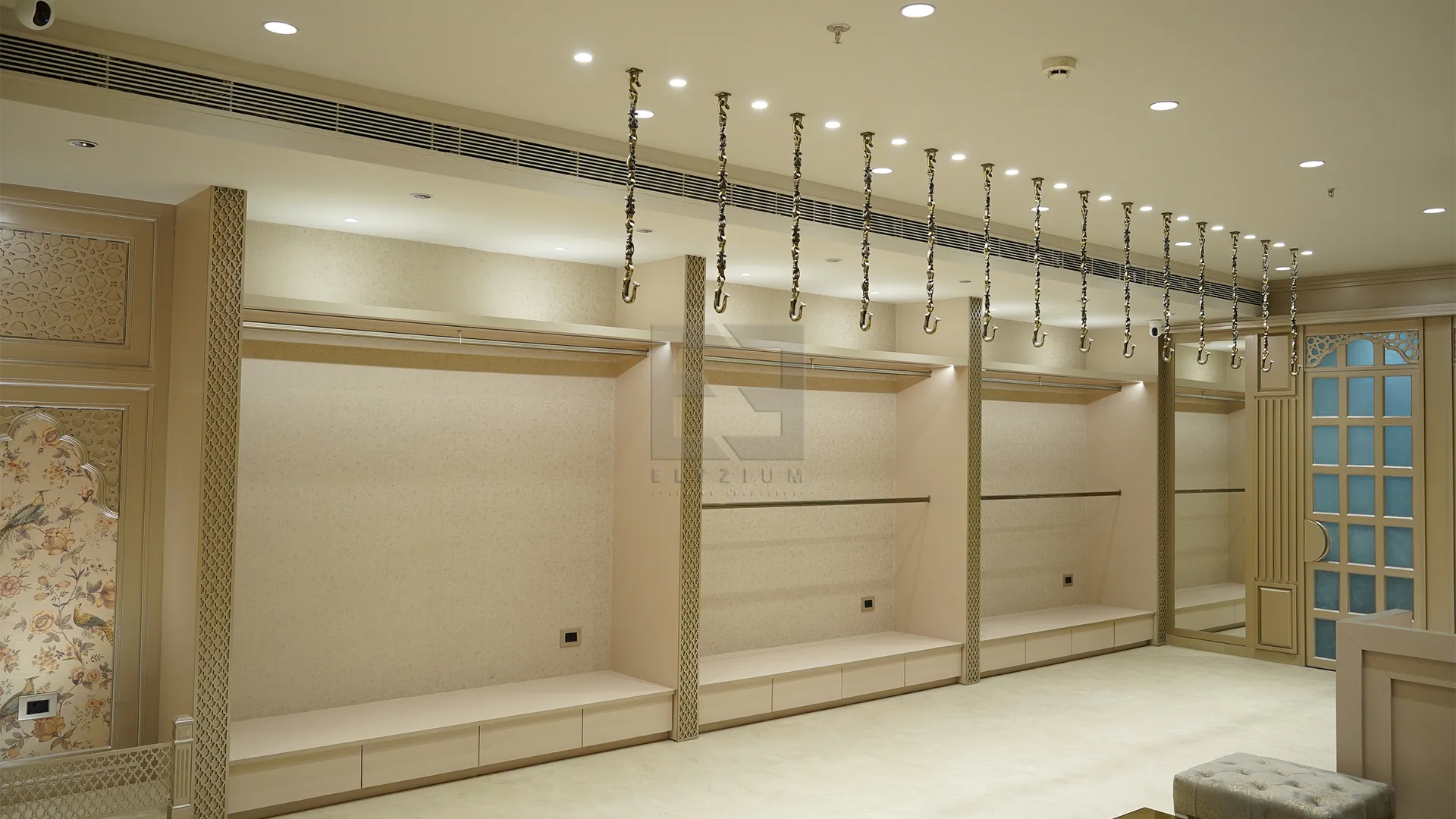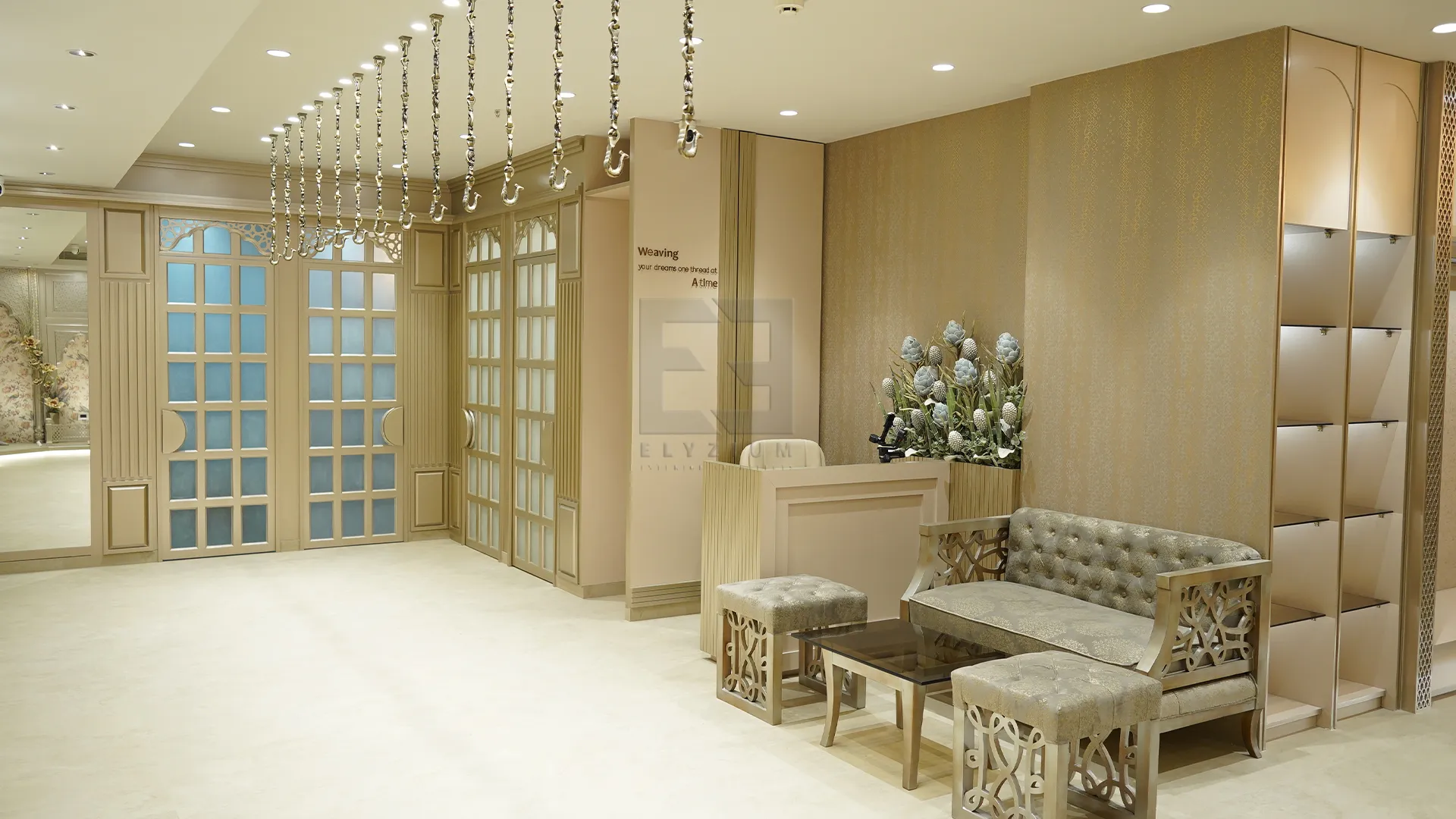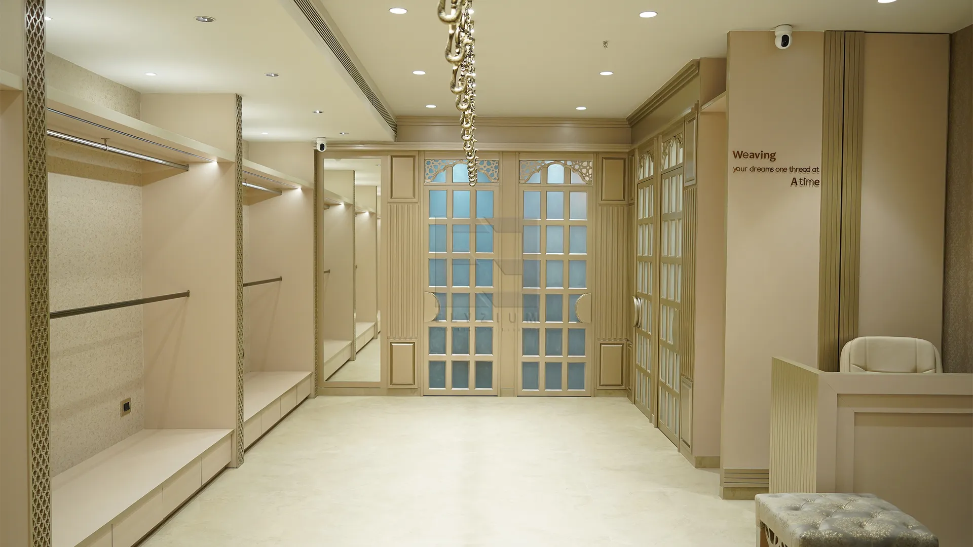 This boutique interior is thoughtfully designed to reflect timeless elegance with a touch of traditional Indian charm. The space features custom-crafted display zones on either side, perfect for showcasing lehengas, sarees, and bridal wear. At the center, a floral wallpaper framed with intricate arch motifs and mirrors creates a luxurious backdrop for trials or photos. The soft beige palette, detailed jali work, and warm ambient lighting together create a calming yet regal atmosphere. Ideal for a premium fashion studio, this design blends aesthetics and functionality to enhance the client experience at every step.