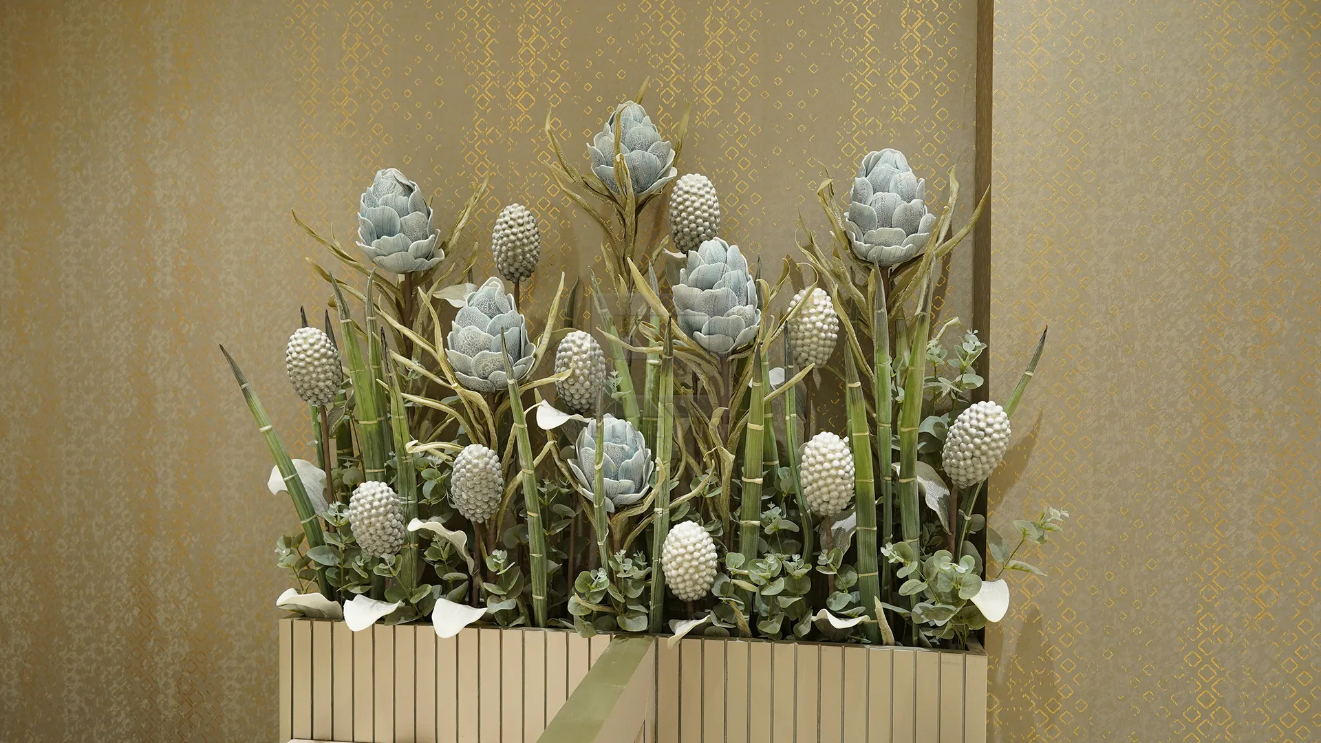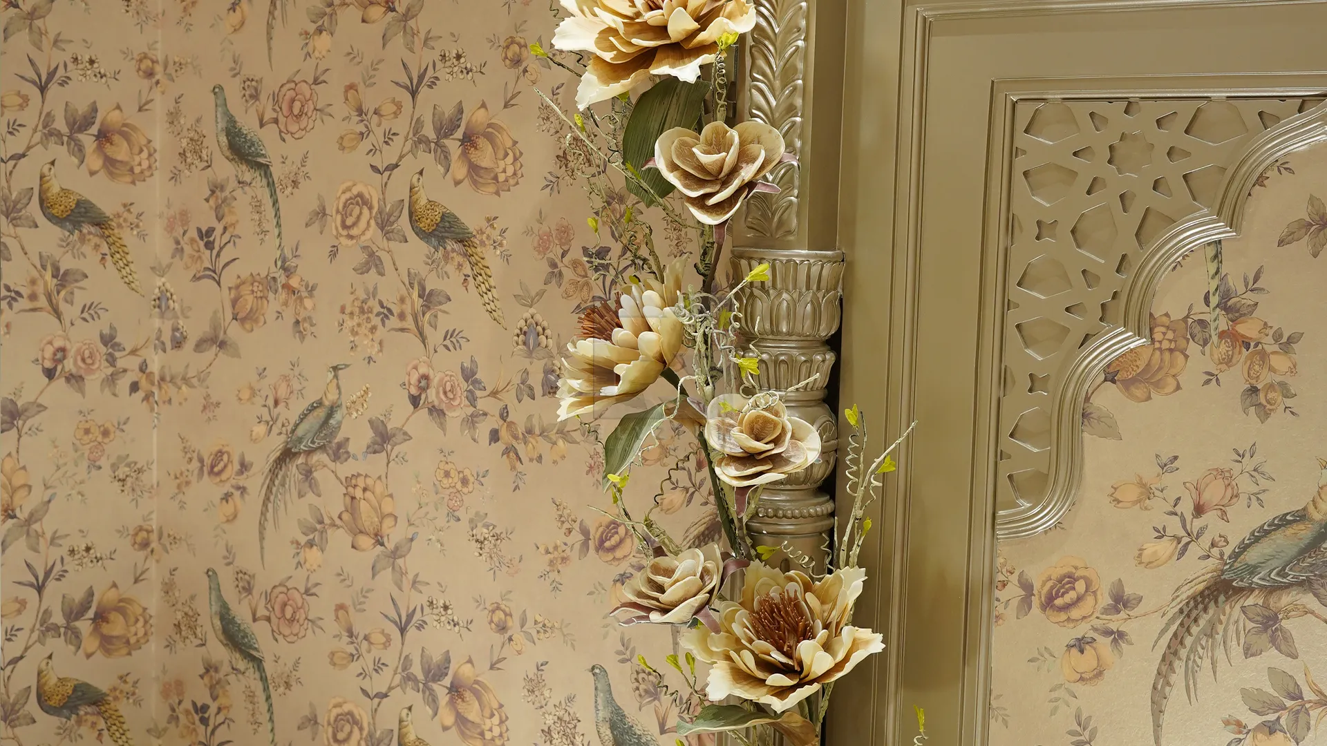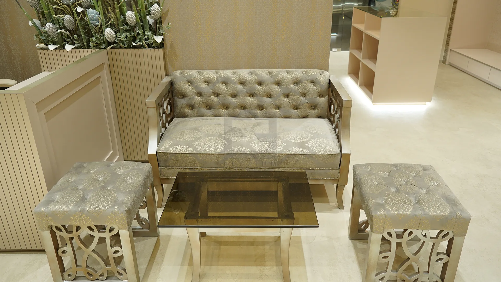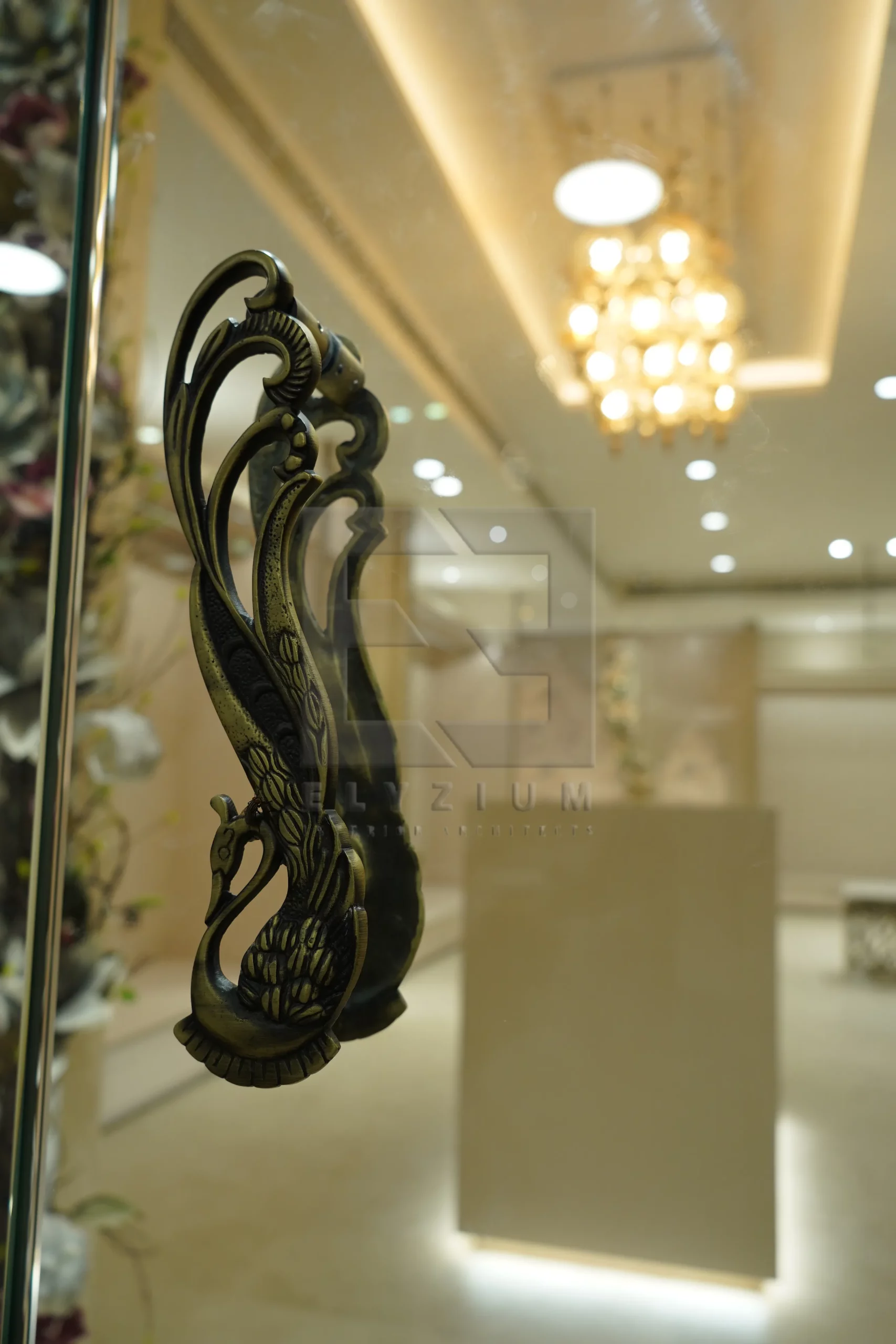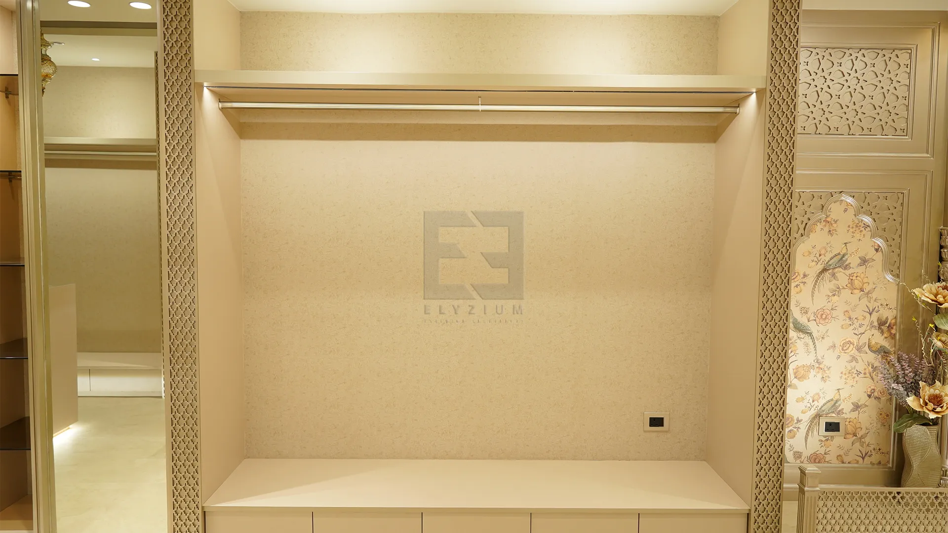 This boutique interior is thoughtfully designed to reflect timeless elegance with a touch of traditional Indian charm. The space features custom-crafted display zones on either side, perfect for showcasing lehengas, sarees, and bridal wear. At the center, a floral wallpaper framed with intricate arch motifs and mirrors creates a luxurious backdrop for trials or photos. The soft beige palette, detailed jali work, and warm ambient lighting together create a calming yet regal atmosphere. Ideal for a premium fashion studio, this design blends aesthetics and functionality to enhance the client experience at every step.