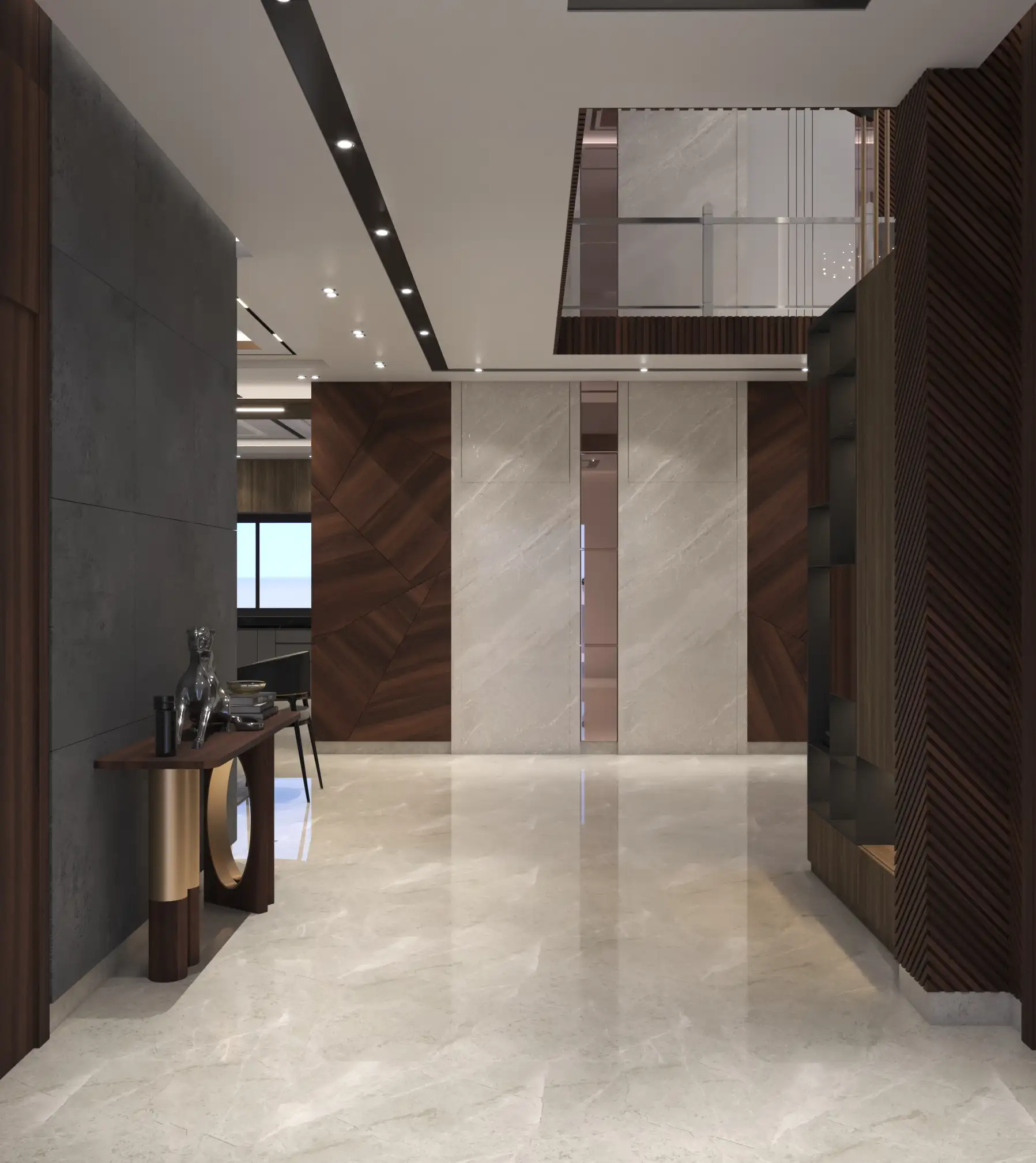 This mid-century-inspired design blends modern aesthetics with timeless elegance. The reception area features polished marble flooring with intricate inlay work, warm wall lighting, and geometric paneling. A high ceiling with recessed lighting and wooden accents adds grandeur, while clean lines and metallic highlights on the desk and walls reflect sophistication. This style suits corporate offices or civic spaces emphasizing professionalism and luxury.