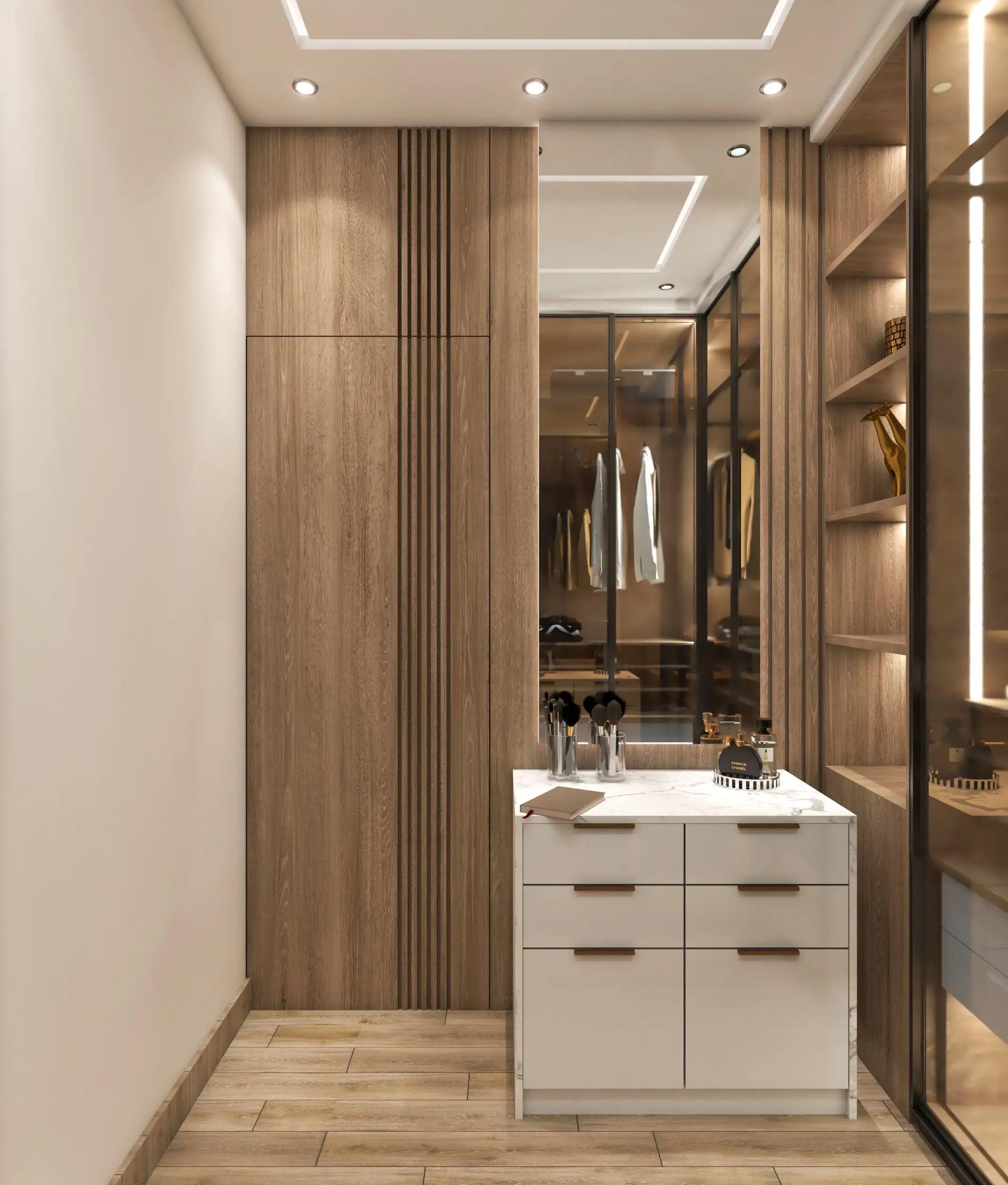 This boutique interior is thoughtfully designed to reflect timeless elegance with a touch of traditional Indian charm. The space features custom-crafted display zones on either side, perfect for showcasing lehengas, sarees, and bridal wear. At the center, a floral wallpaper framed with intricate arch motifs and mirrors creates a luxurious backdrop for trials or photos. The soft beige palette, detailed jali work, and warm ambient lighting together create a calming yet regal atmosphere. Ideal for a premium fashion studio, this design blends aesthetics and functionality to enhance the client experience at every step.