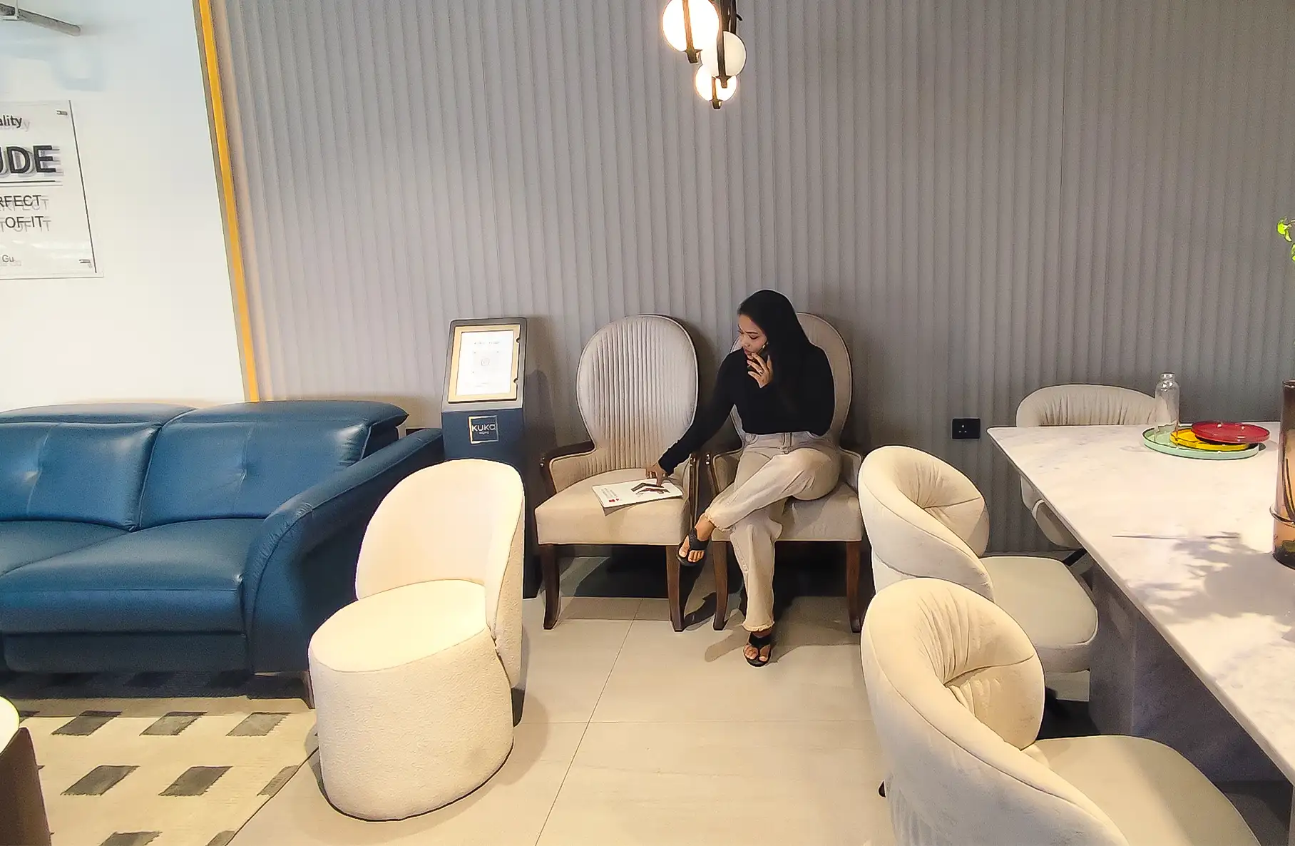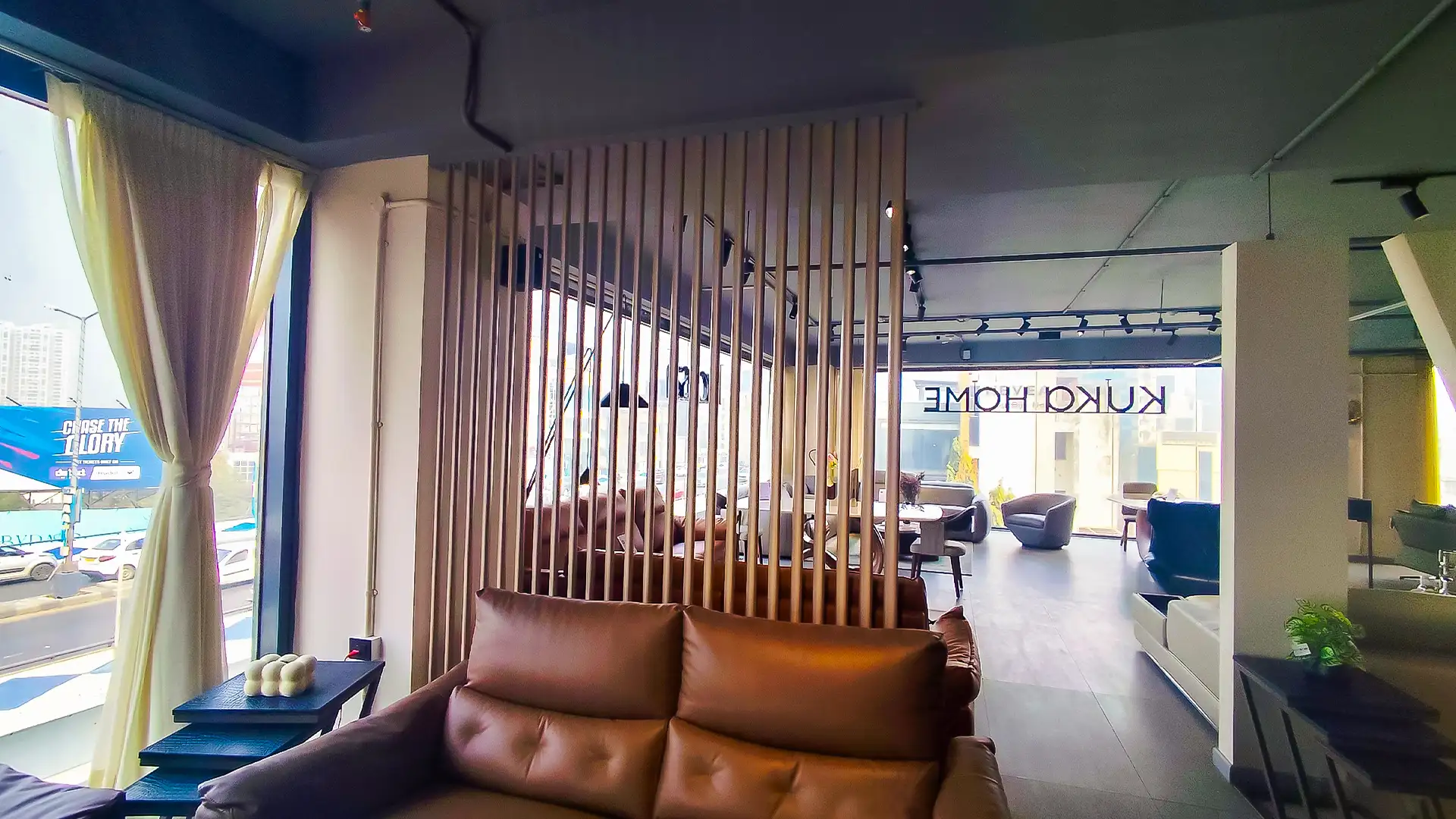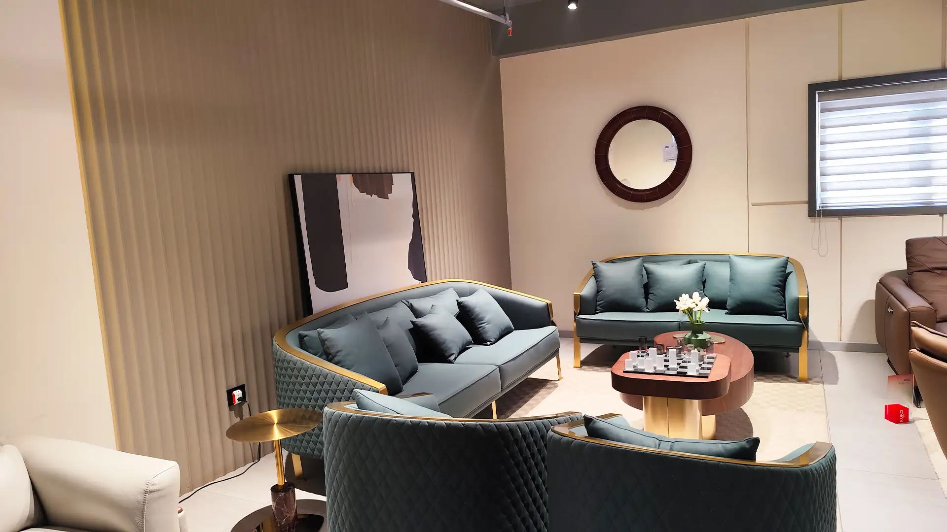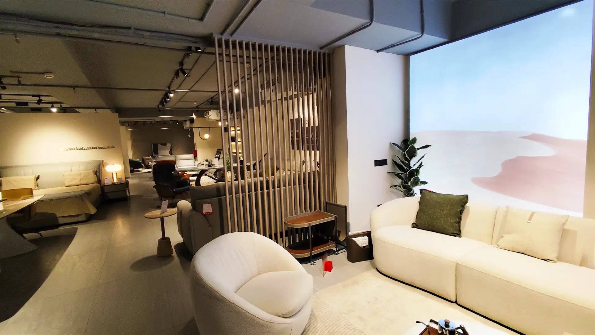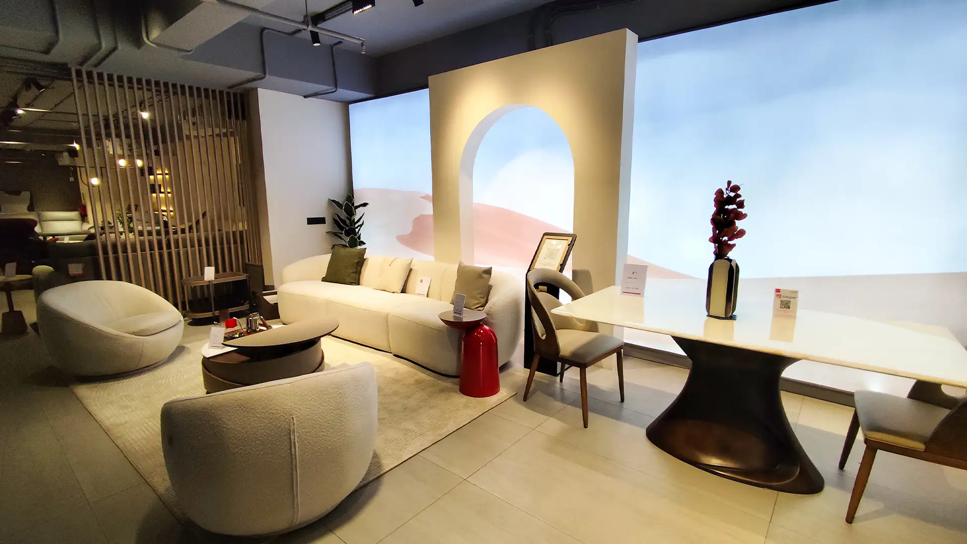 This showroom reimagines luxury living with an artful interplay of comfort and design. Curved, plush furniture pieces exude sophistication, while sleek wooden partitions add depth and intrigue. A serene desert-inspired backdrop enhances the calming ambiance, complemented by soft lighting and thoughtfully placed decor. Every element harmonizes to create an immersive experience that celebrates timeless elegance and innovative craftsmanship.