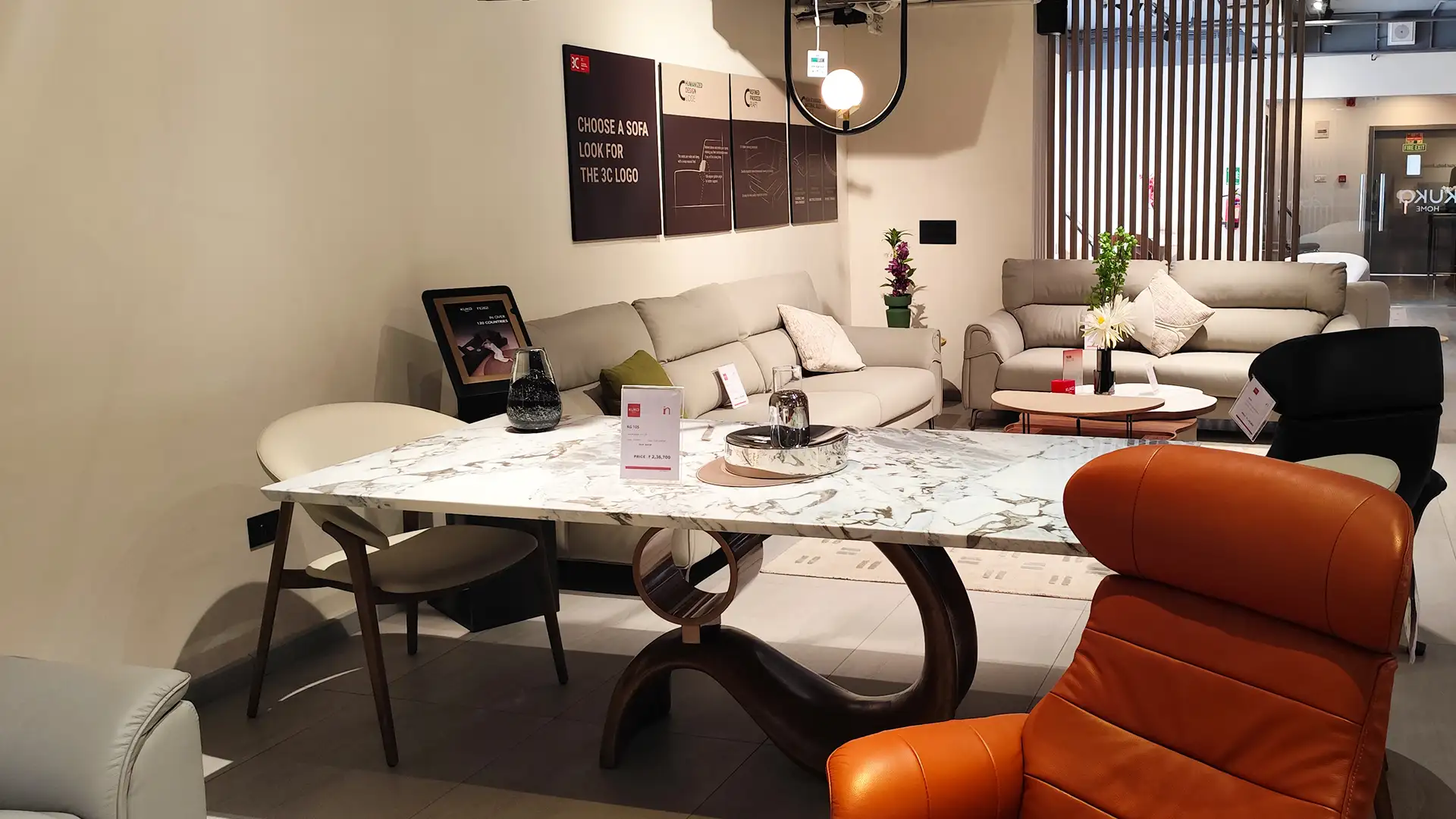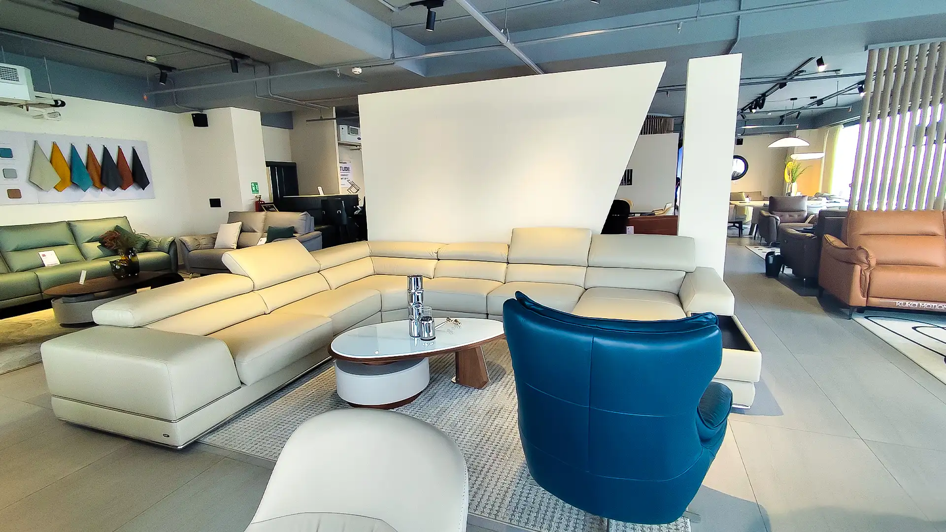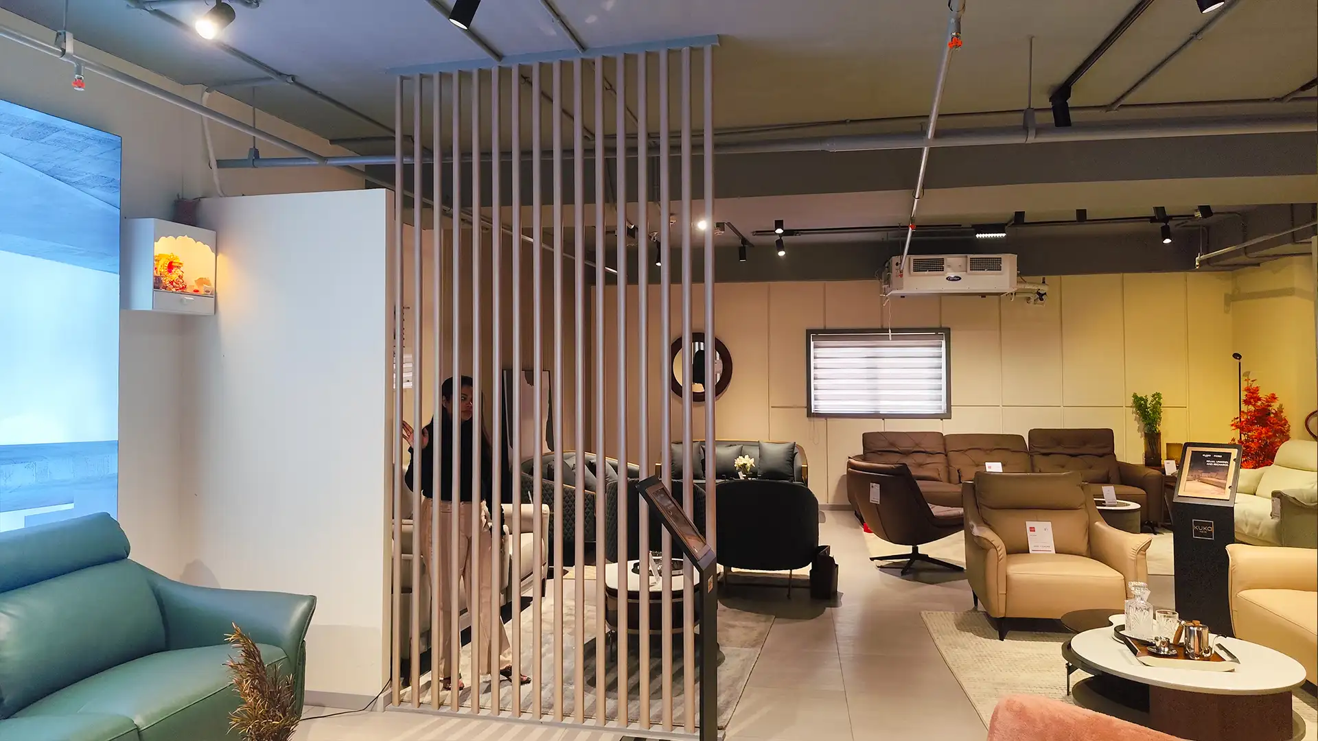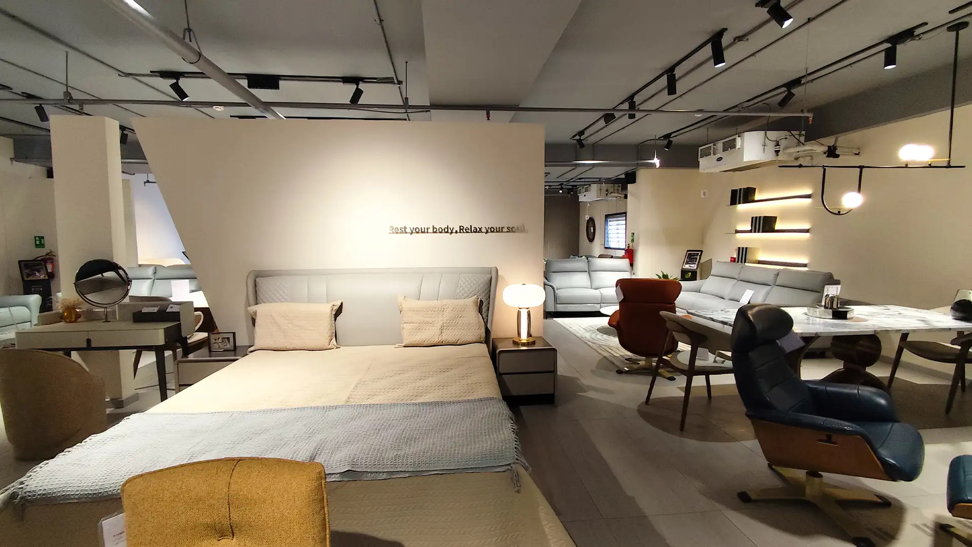 This showroom reimagines luxury living with an artful interplay of comfort and design. Curved, plush furniture pieces exude sophistication, while sleek wooden partitions add depth and intrigue. A serene desert-inspired backdrop enhances the calming ambiance, complemented by soft lighting and thoughtfully placed decor. Every element harmonizes to create an immersive experience that celebrates timeless elegance and innovative craftsmanship.