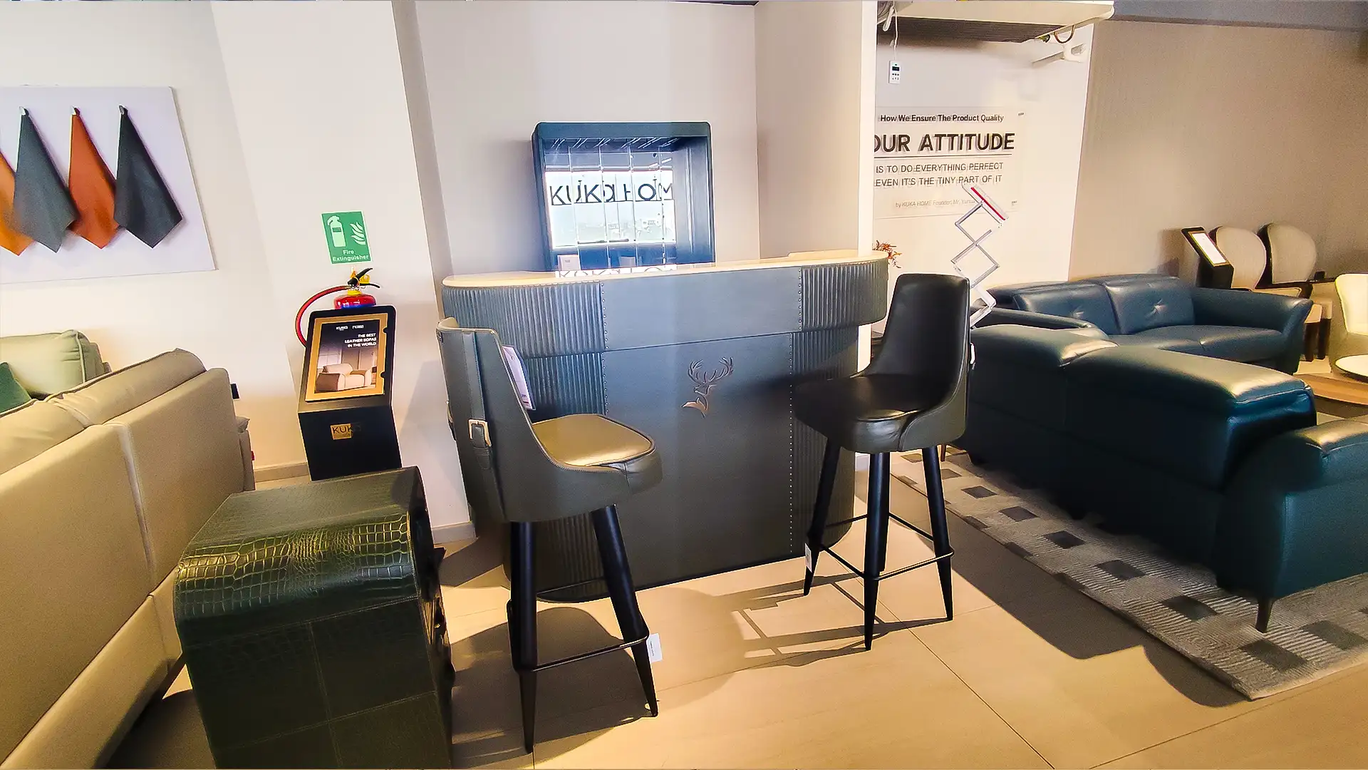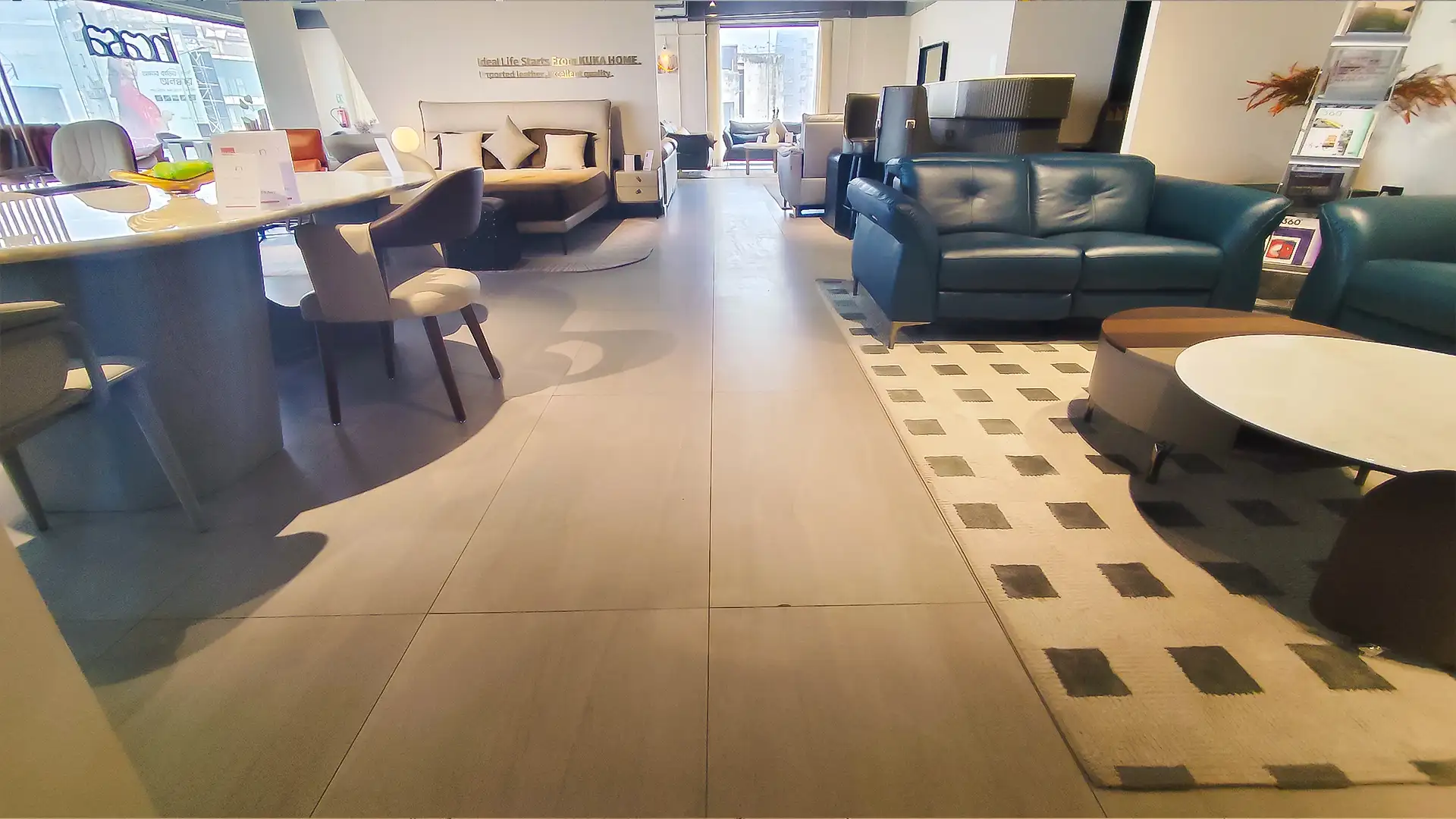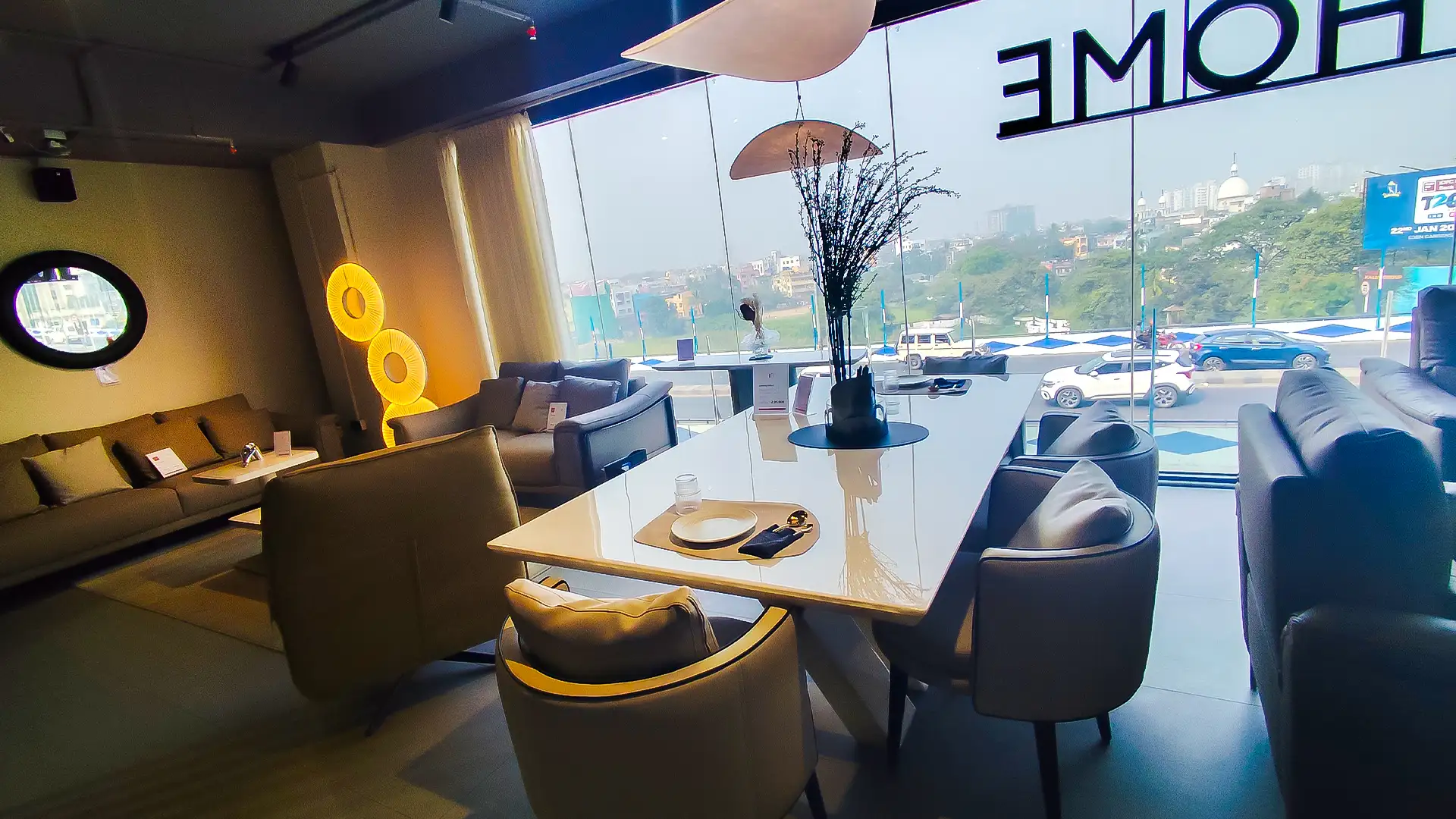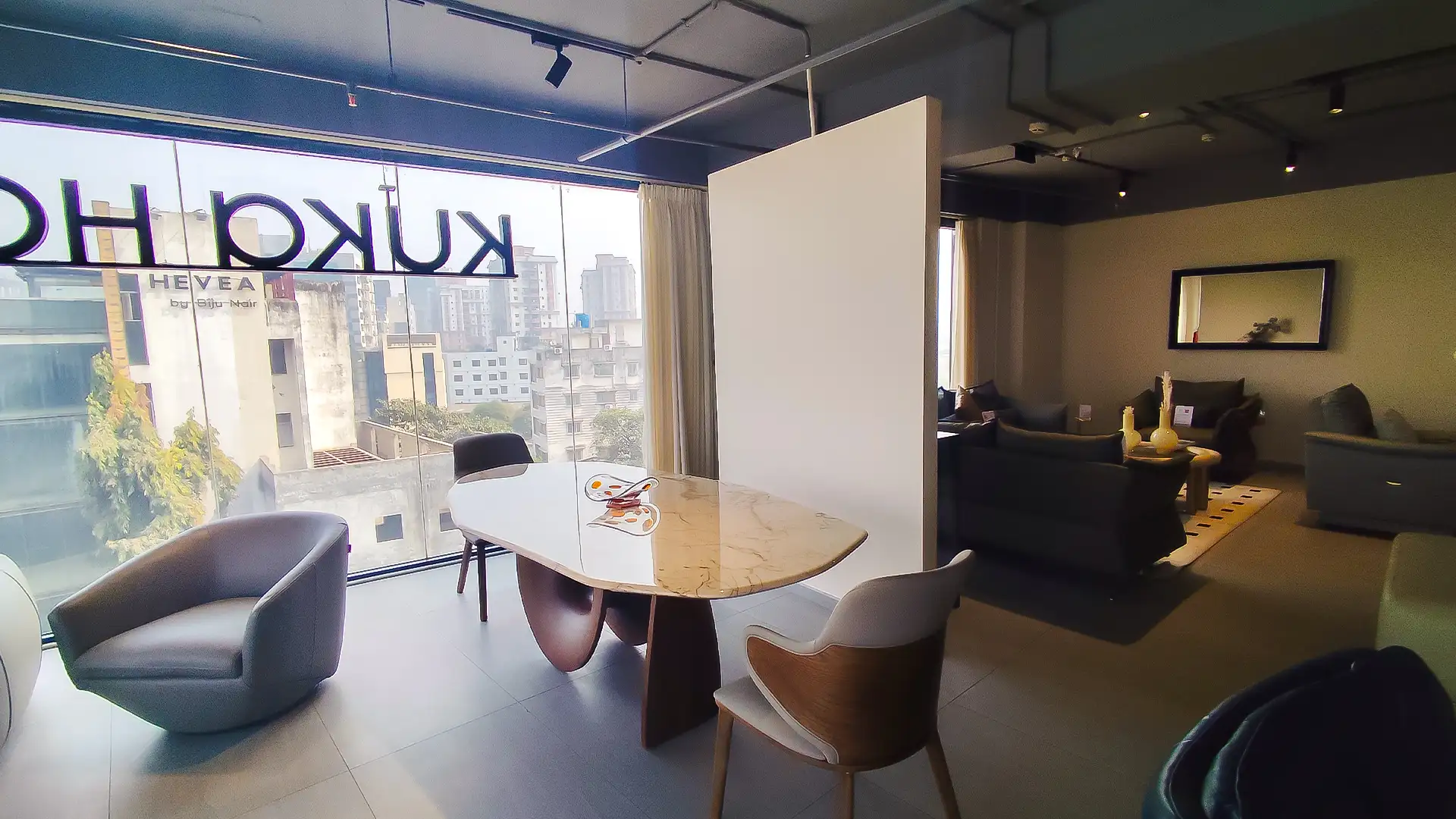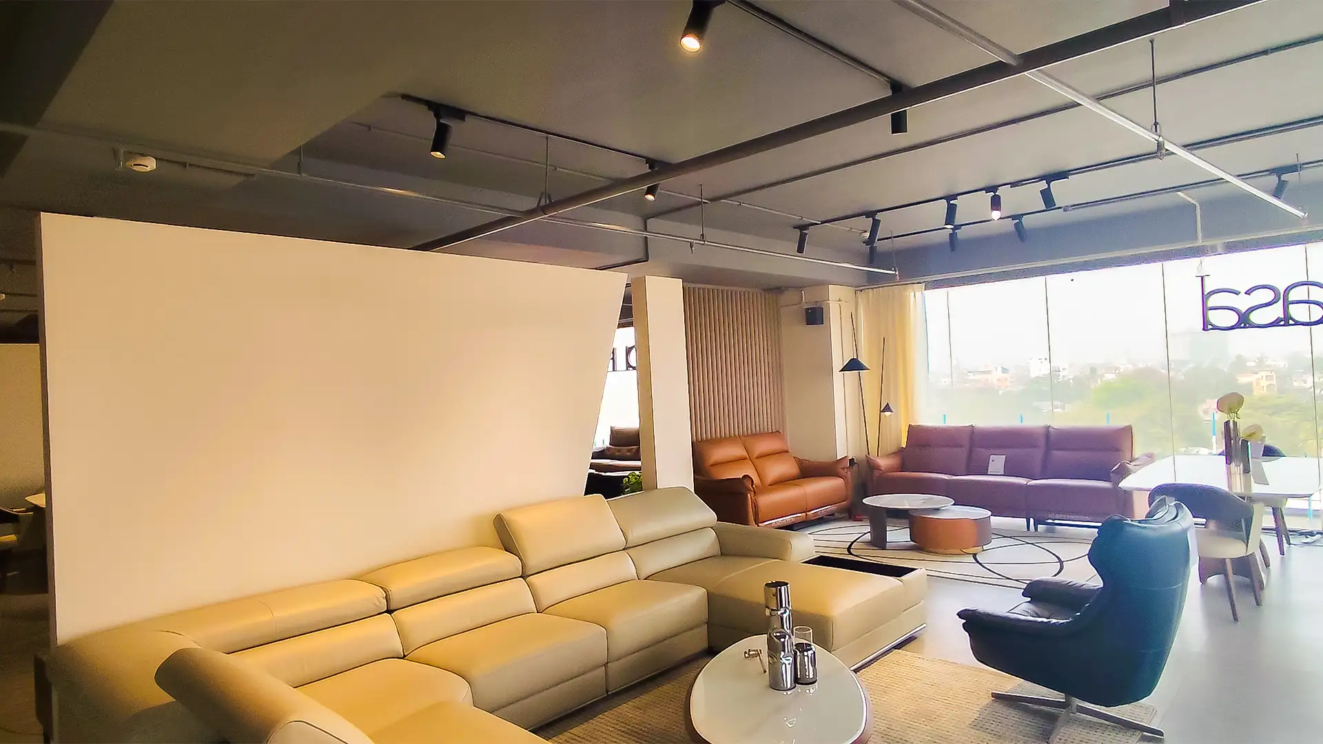 This showroom reimagines luxury living with an artful interplay of comfort and design. Curved, plush furniture pieces exude sophistication, while sleek wooden partitions add depth and intrigue. A serene desert-inspired backdrop enhances the calming ambiance, complemented by soft lighting and thoughtfully placed decor. Every element harmonizes to create an immersive experience that celebrates timeless elegance and innovative craftsmanship.