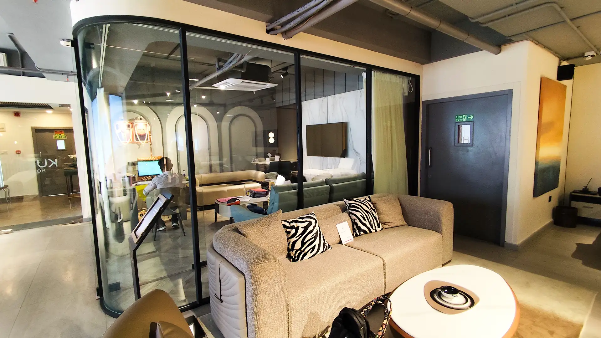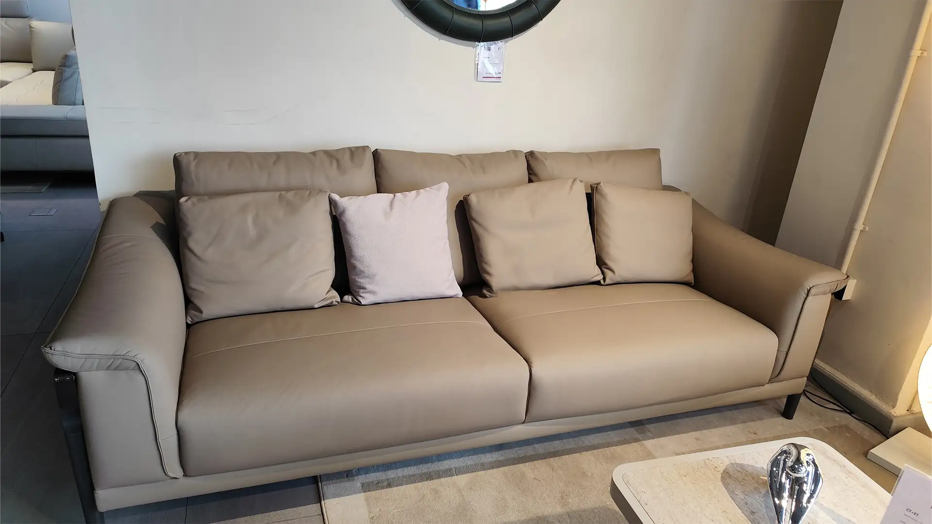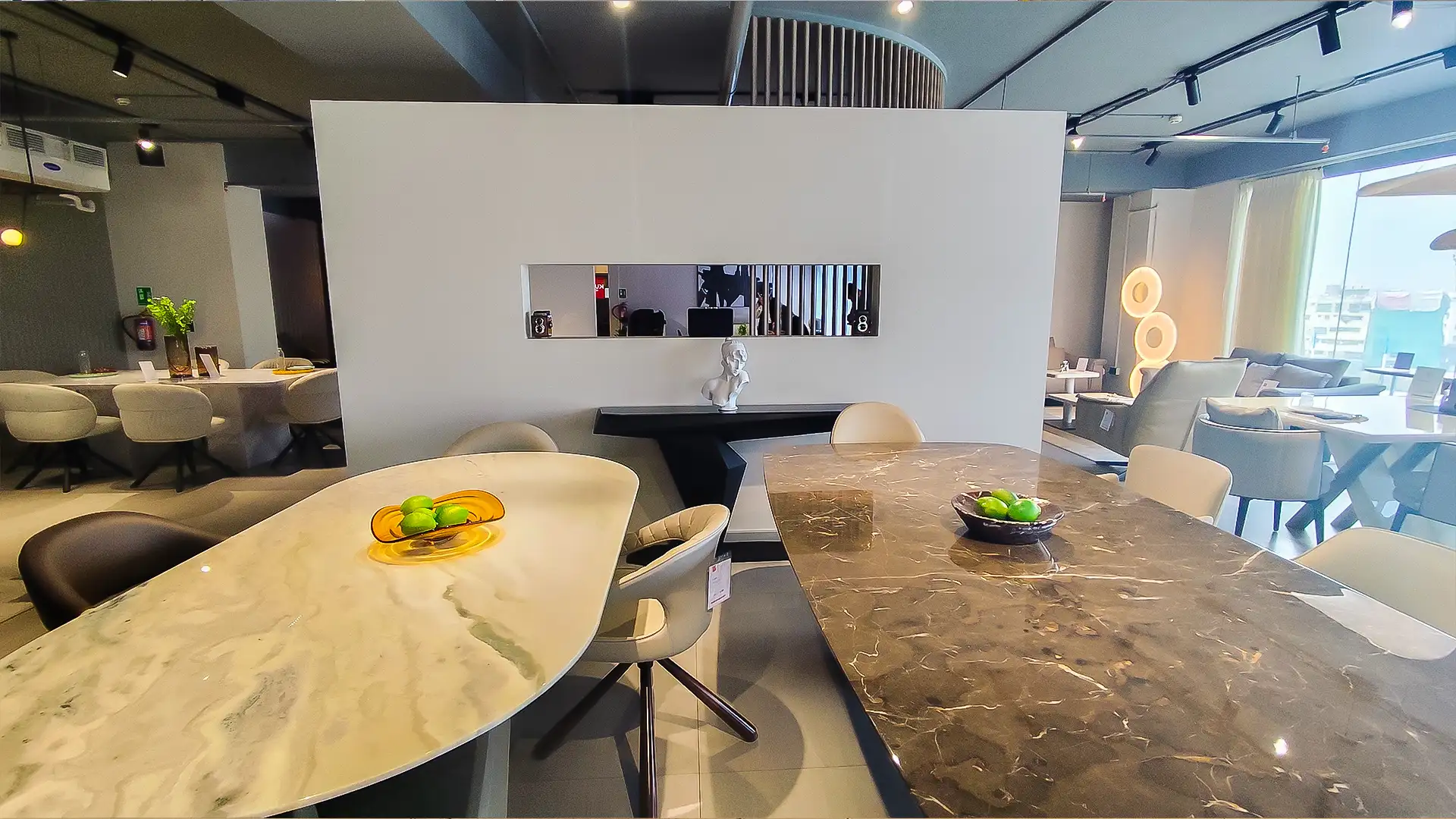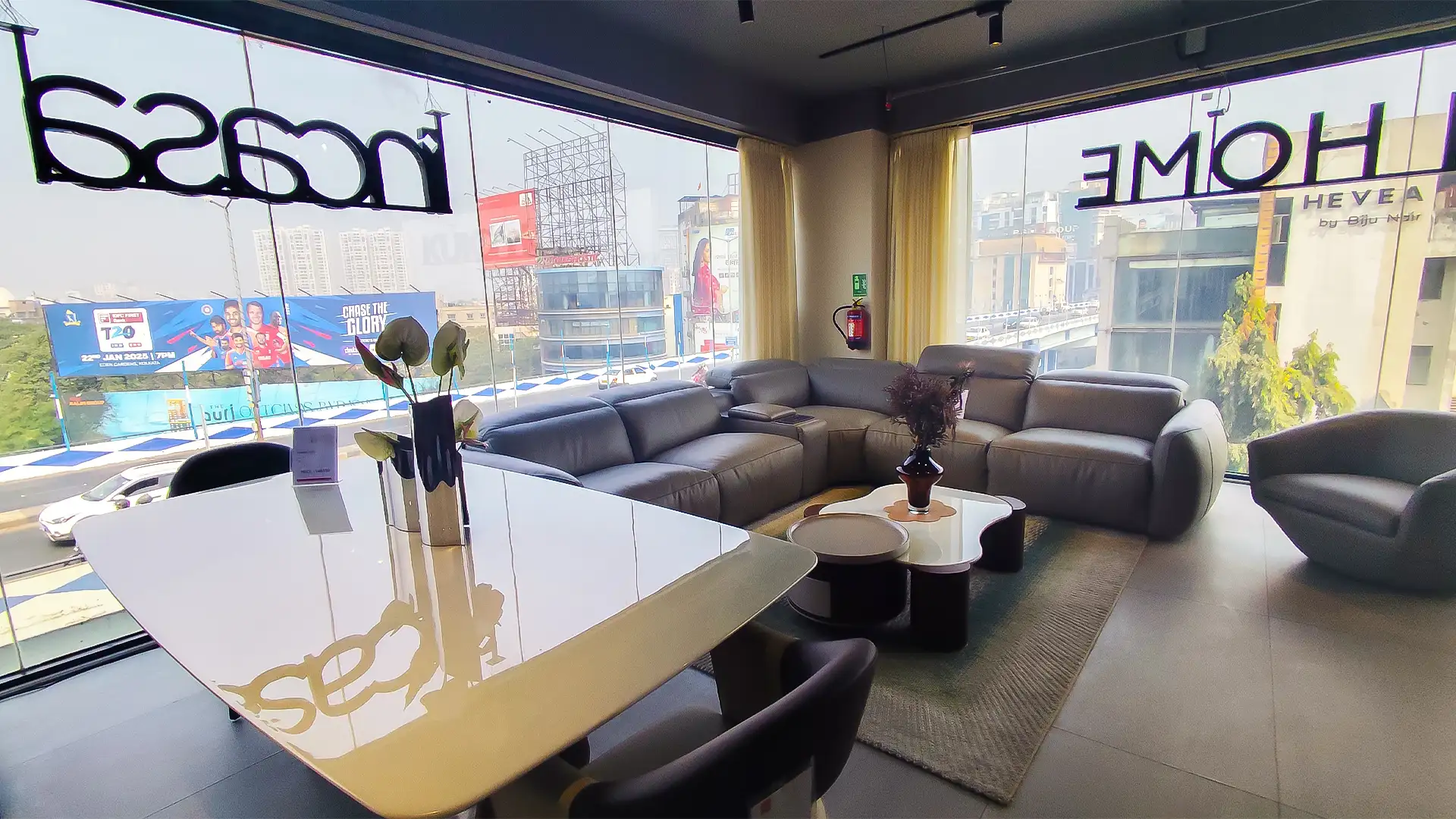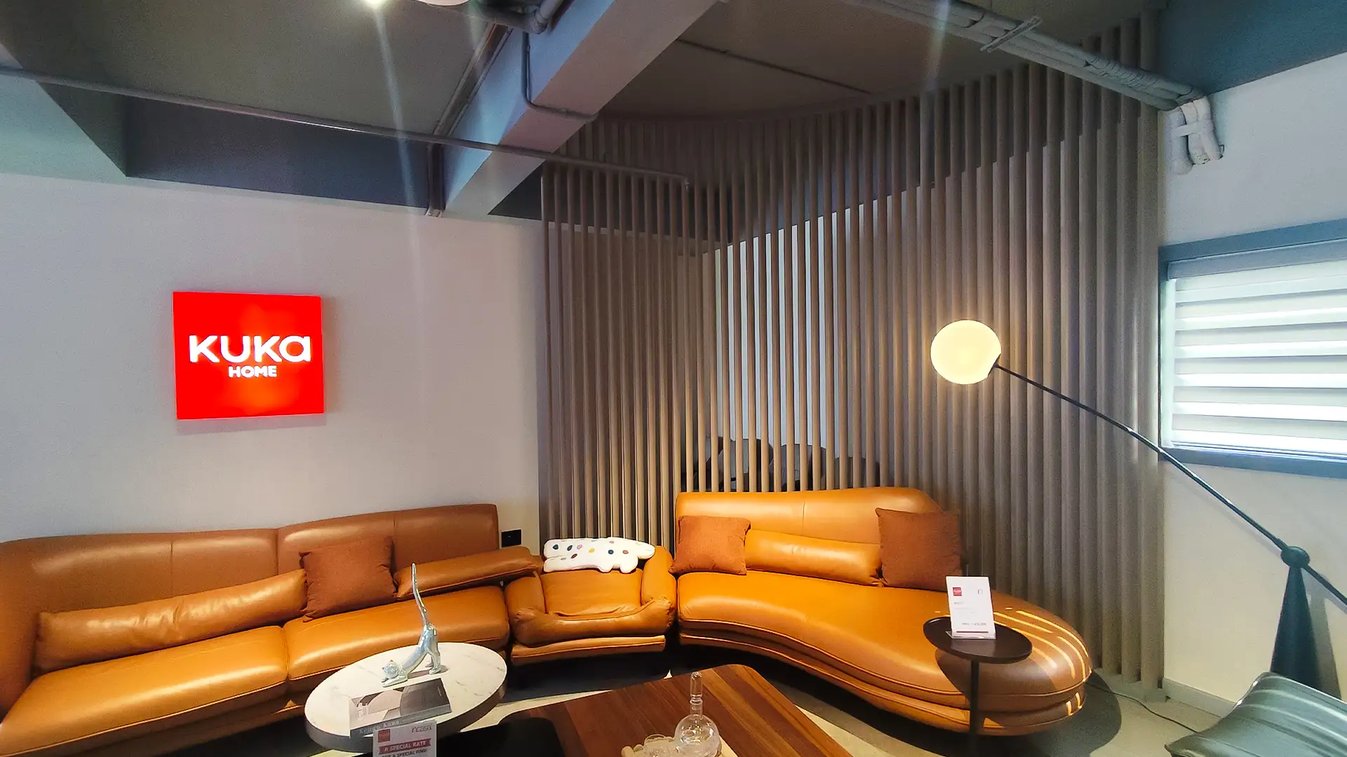 This showroom reimagines luxury living with an artful interplay of comfort and design. Curved, plush furniture pieces exude sophistication, while sleek wooden partitions add depth and intrigue. A serene desert-inspired backdrop enhances the calming ambiance, complemented by soft lighting and thoughtfully placed decor. Every element harmonizes to create an immersive experience that celebrates timeless elegance and innovative craftsmanship.