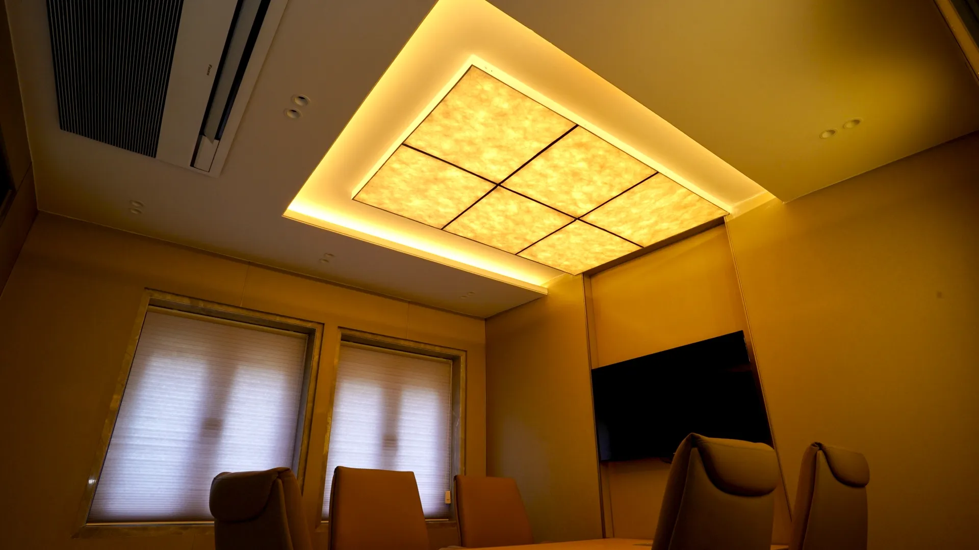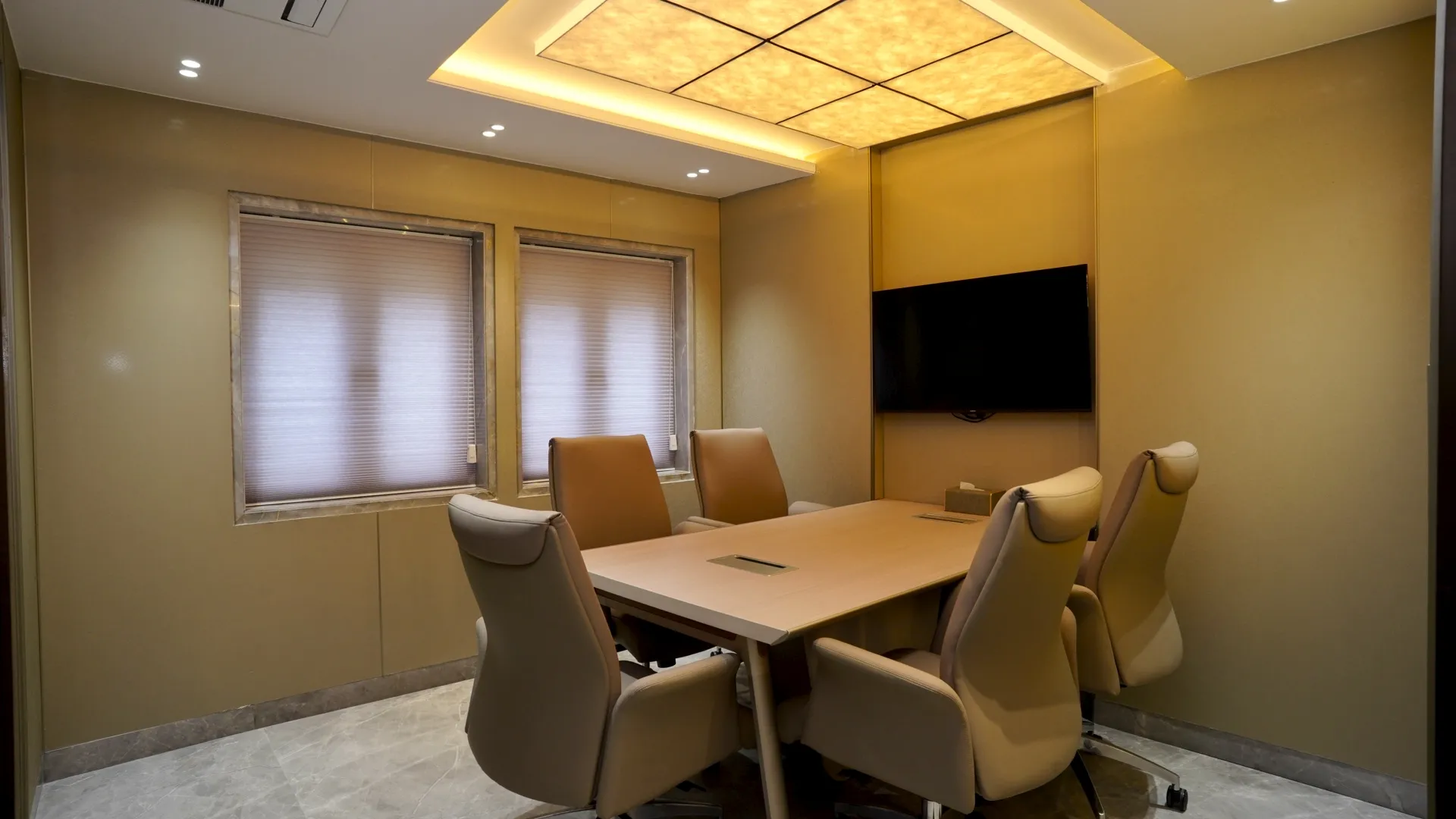The room’s walls incorporate decorative shelving with artistic elements and plants, creating a vibrant, eco-friendly ambiance. The ceiling showcases geometric light panels, complementing the contemporary decor. The design combines functionality with aesthetic appeal, perfect for professional meetings.