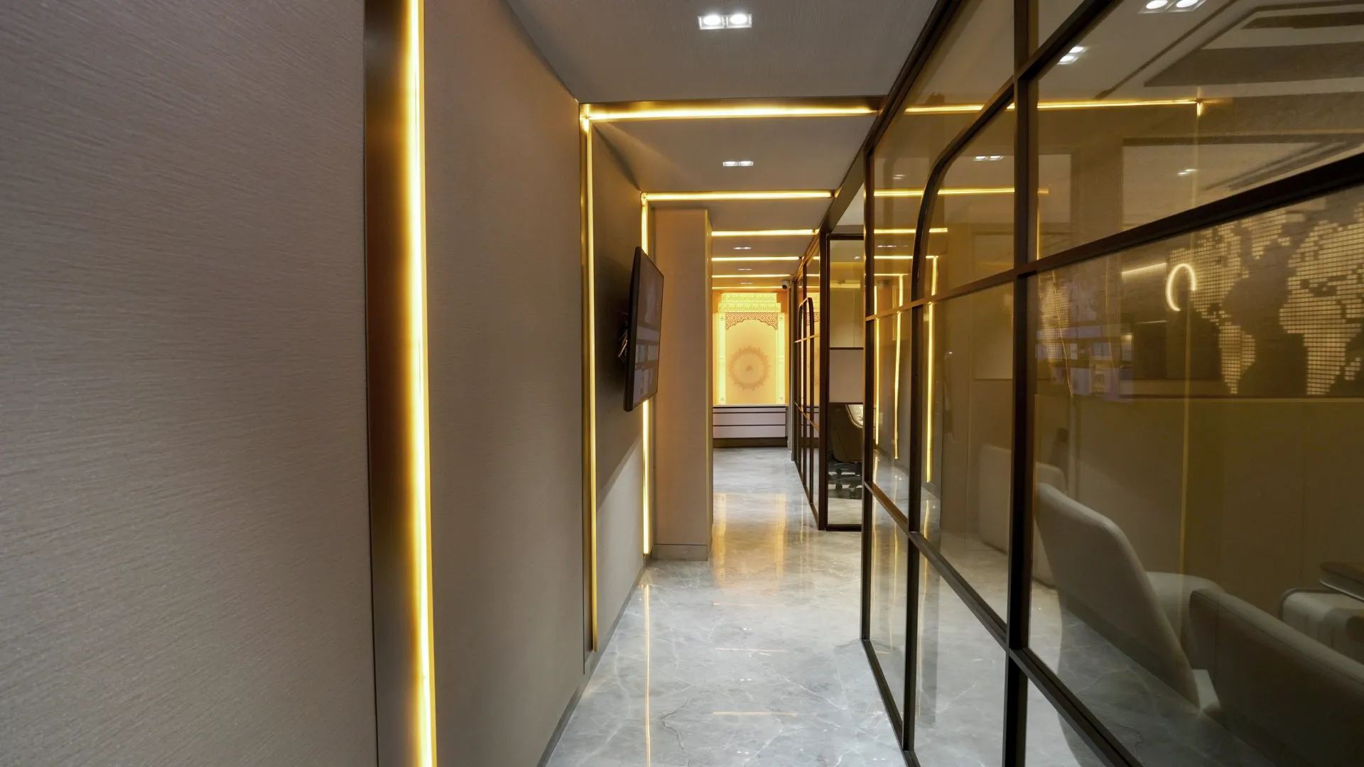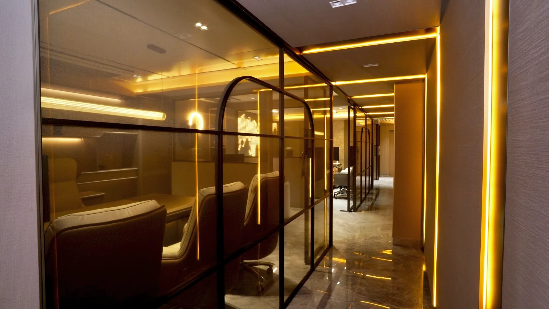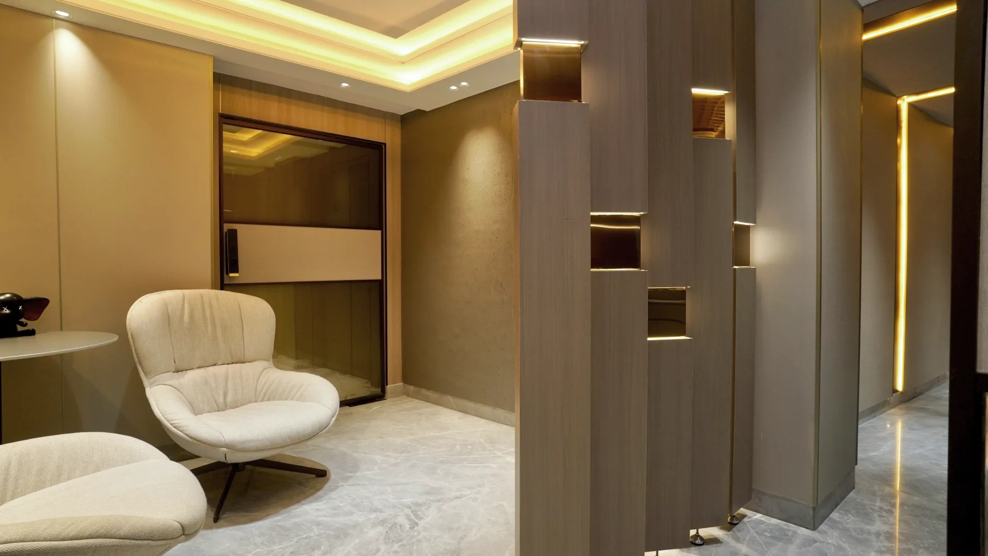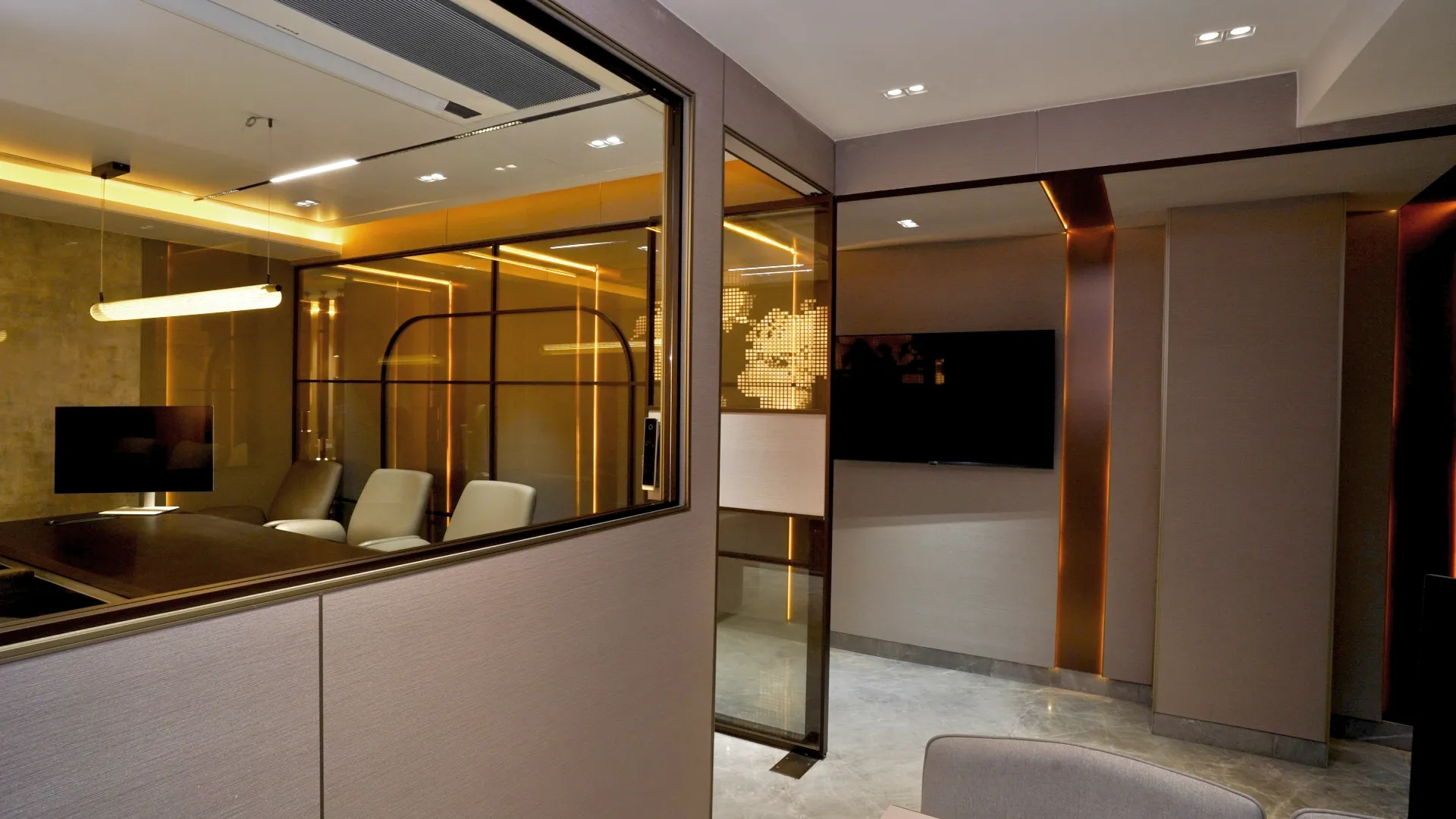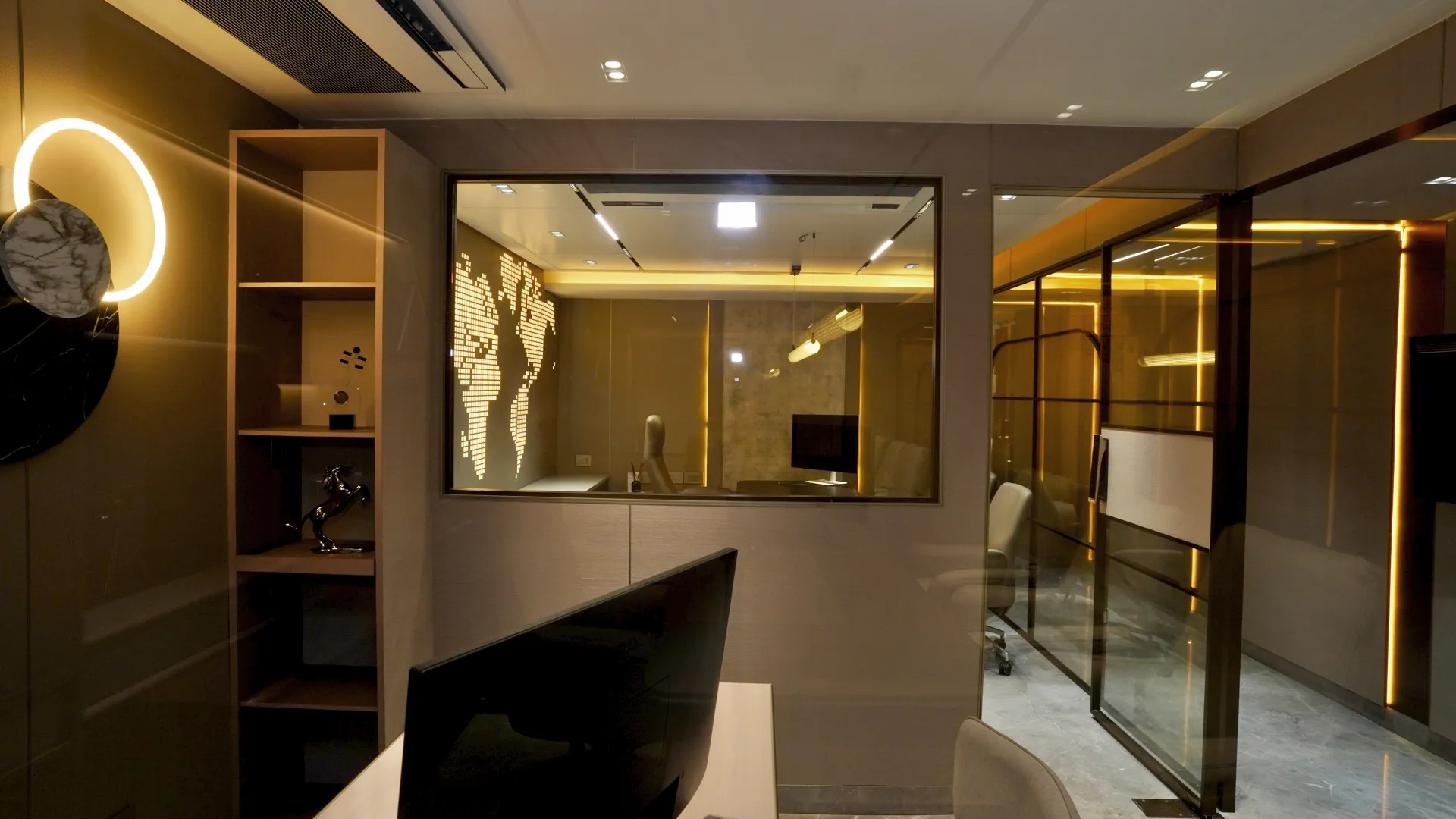 This modern workspace features a sophisticated lounge area with sleek furniture and artistic decor. Adjacent glass-walled meeting rooms add a professional vibe, enhanced by contemporary lighting fixtures. The design emphasizes openness and functionality, with luxurious finishes, geometric patterns, and neutral tones that exude elegance and comfort, ideal for collaborative and private workspaces.