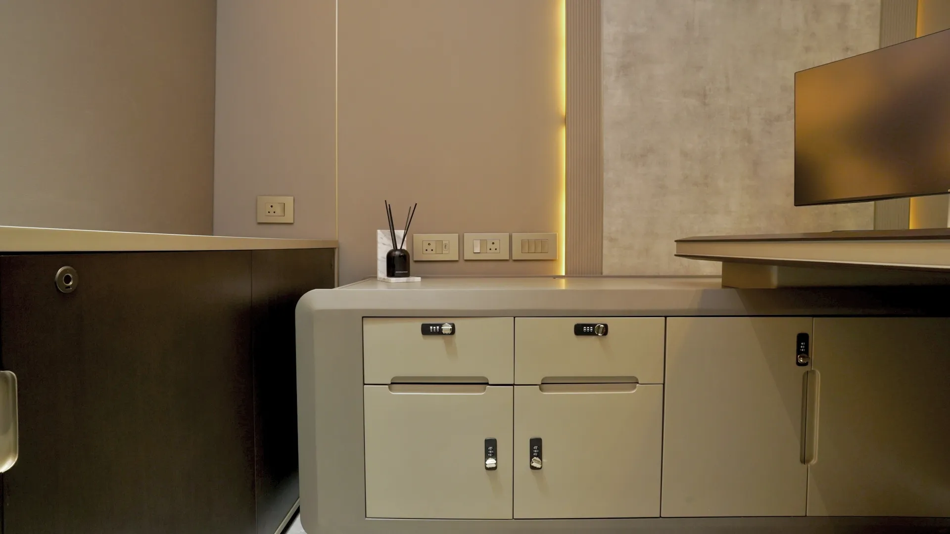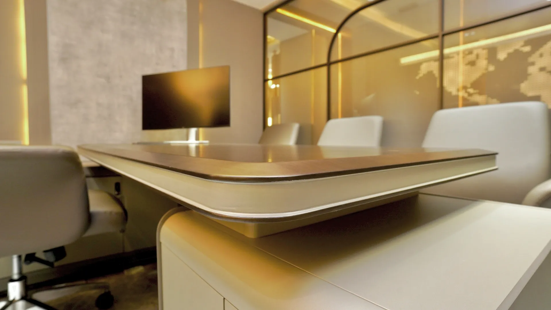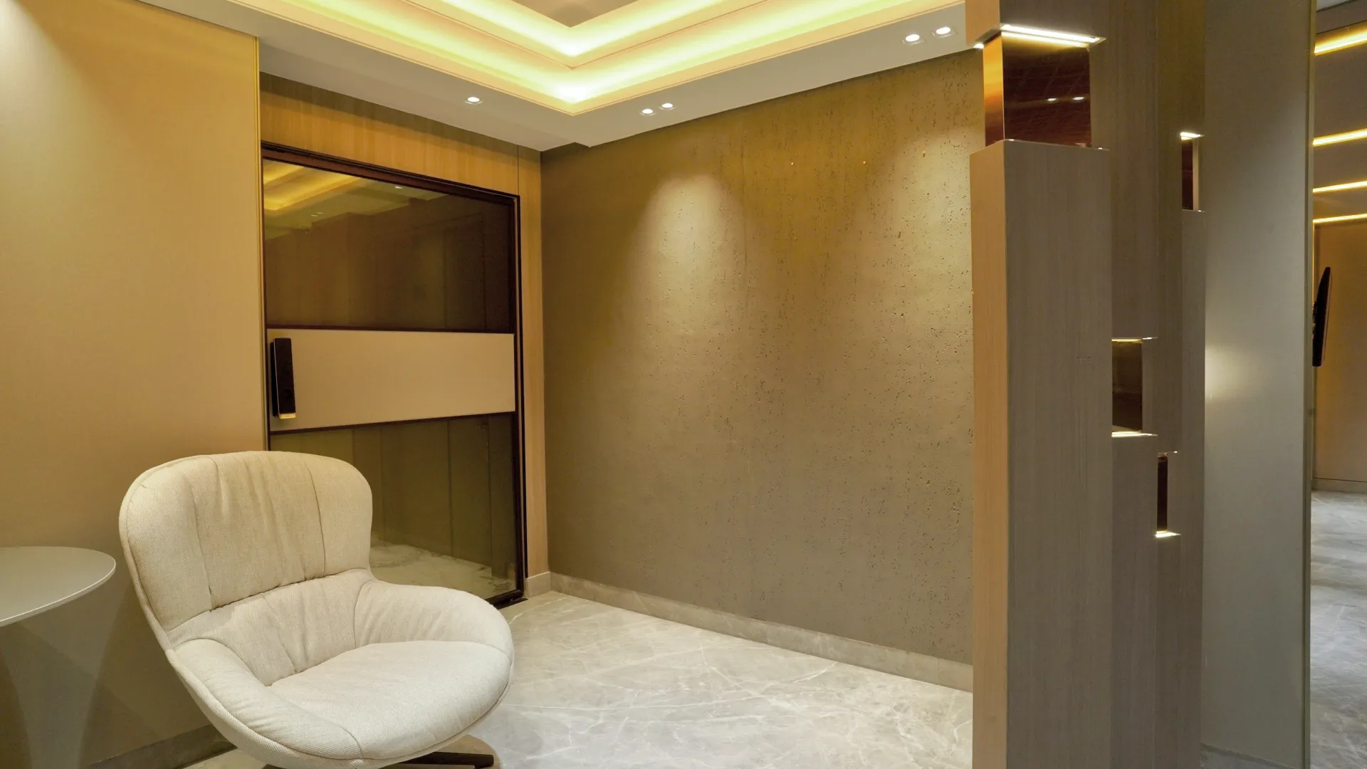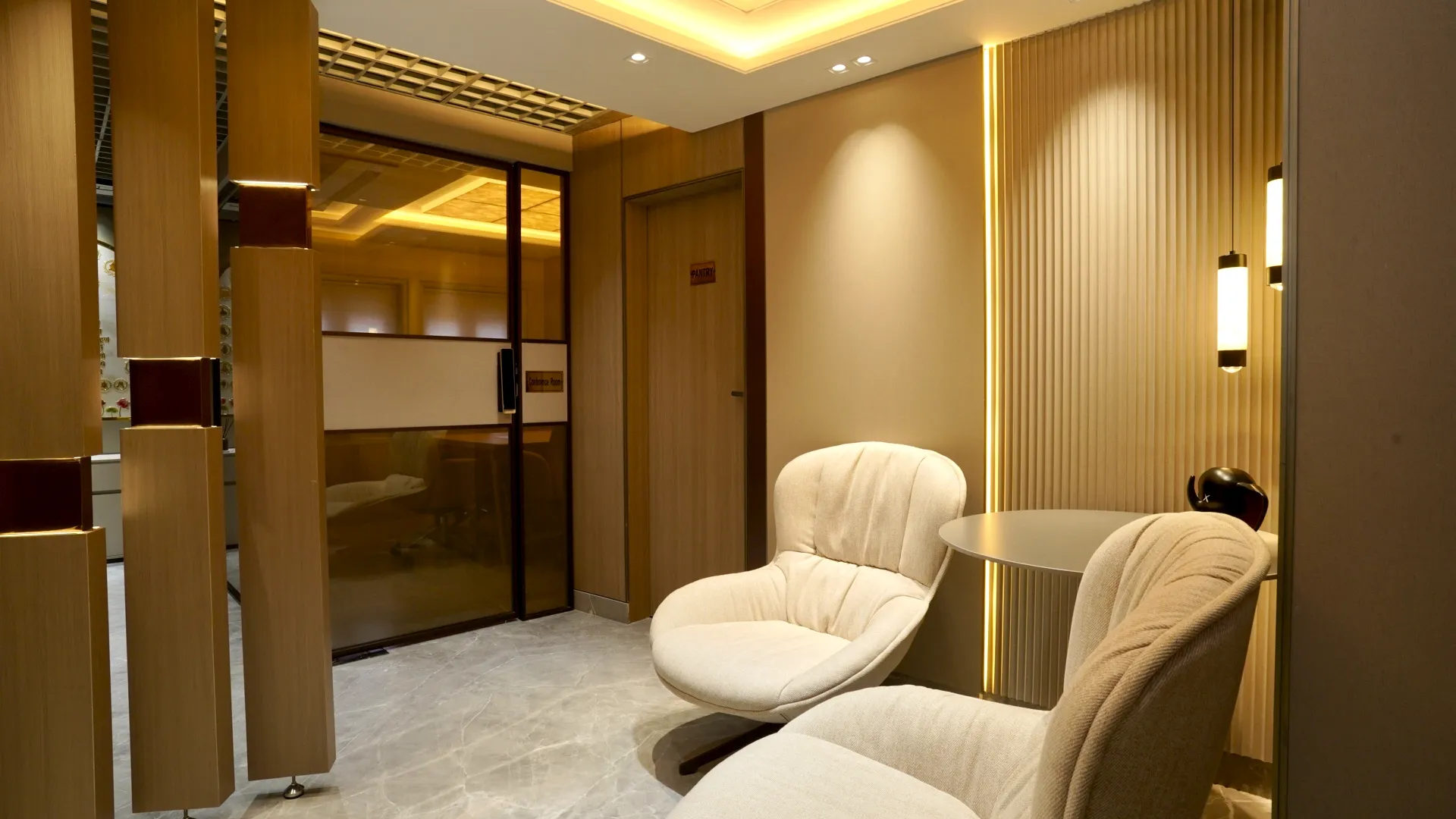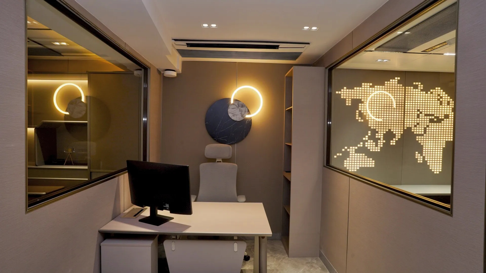 This modern workspace features a sophisticated lounge area with sleek furniture and artistic decor. Adjacent glass-walled meeting rooms add a professional vibe, enhanced by contemporary lighting fixtures. The design emphasizes openness and functionality, with luxurious finishes, geometric patterns, and neutral tones that exude elegance and comfort, ideal for collaborative and private workspaces.