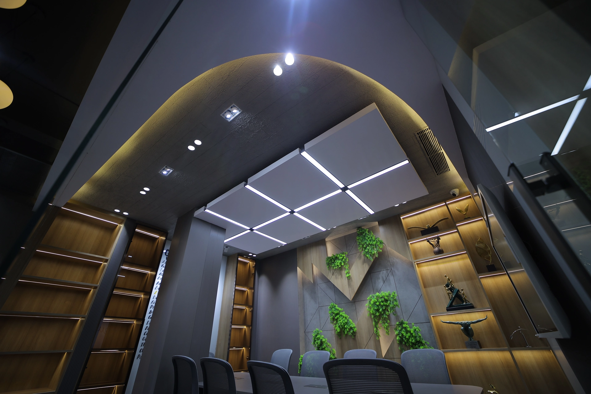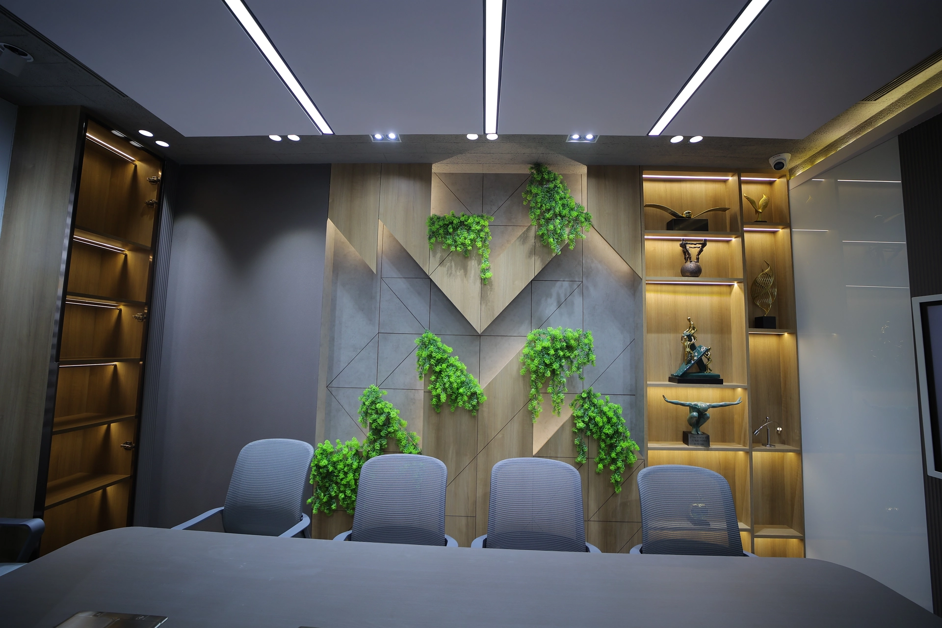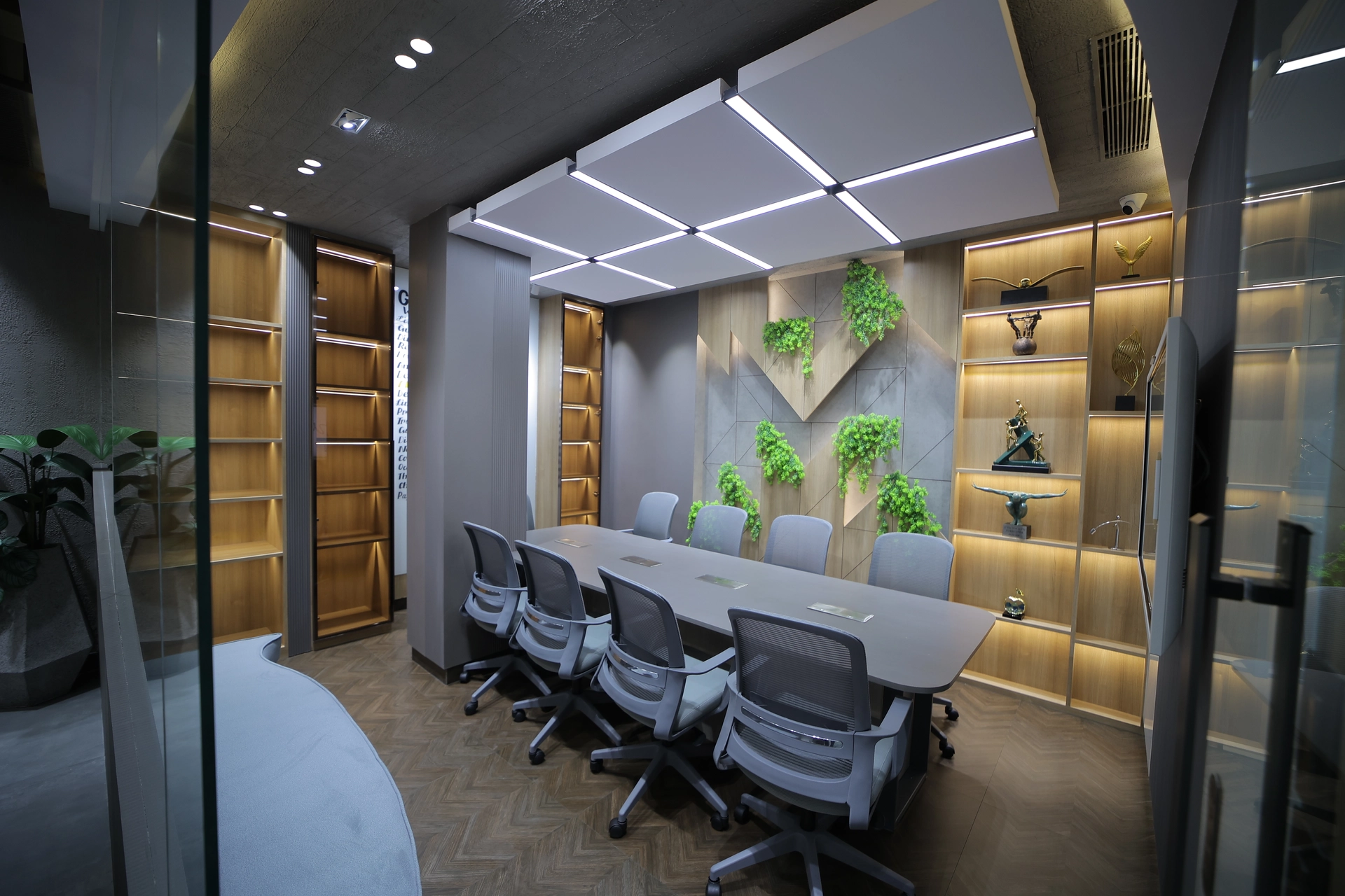 The room’s walls incorporate decorative shelving with artistic elements and plants, creating a vibrant, eco-friendly ambiance. The ceiling showcases geometric light panels, complementing the contemporary decor. The design combines functionality with aesthetic appeal, perfect for professional meetings.