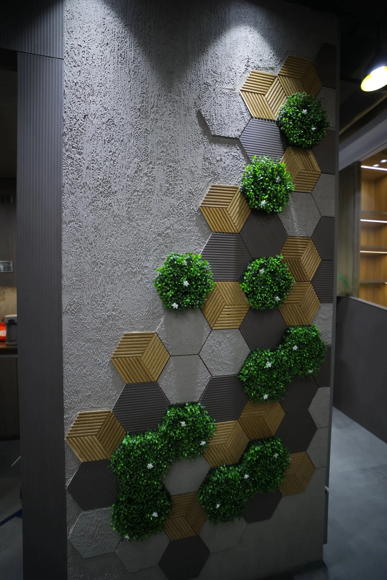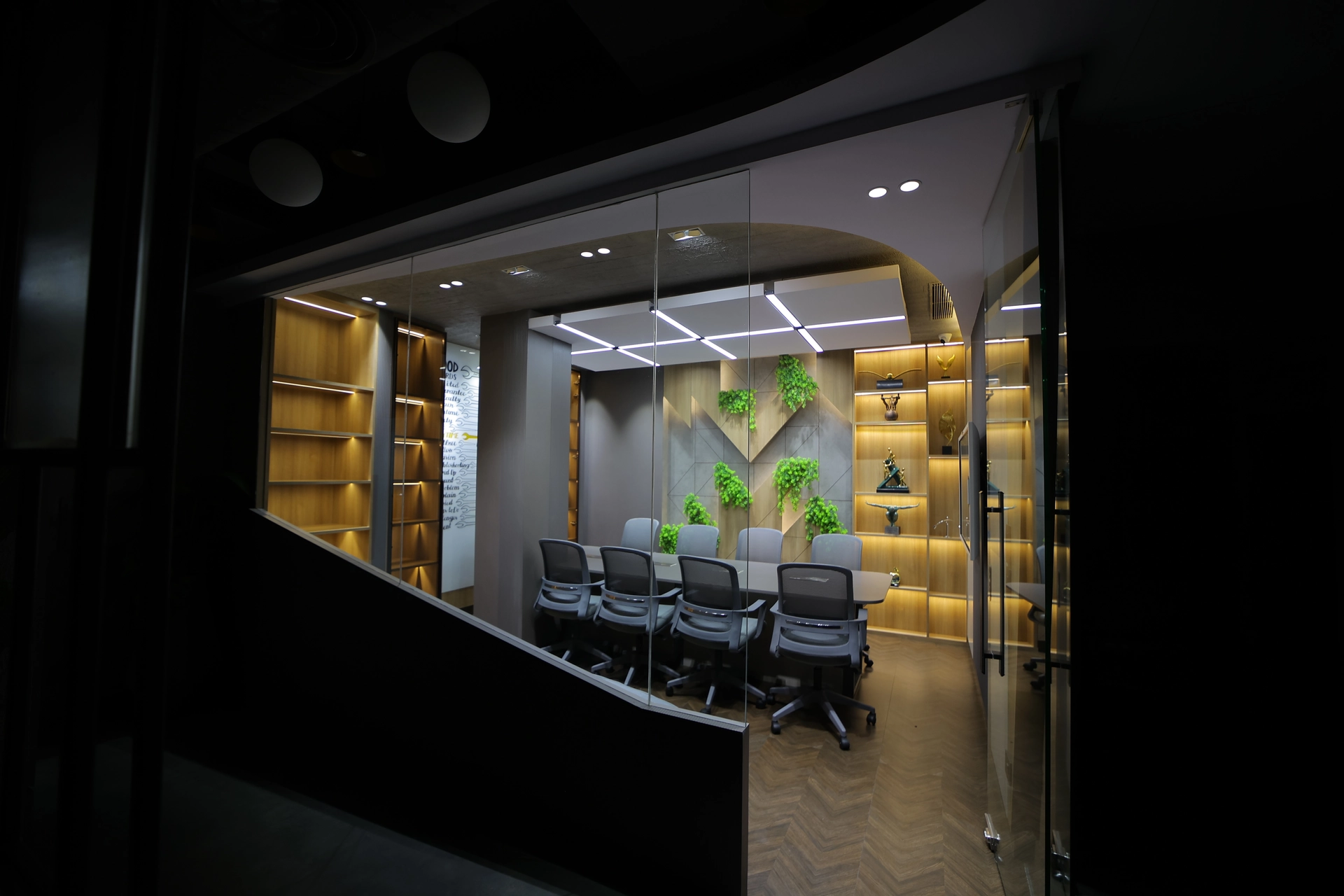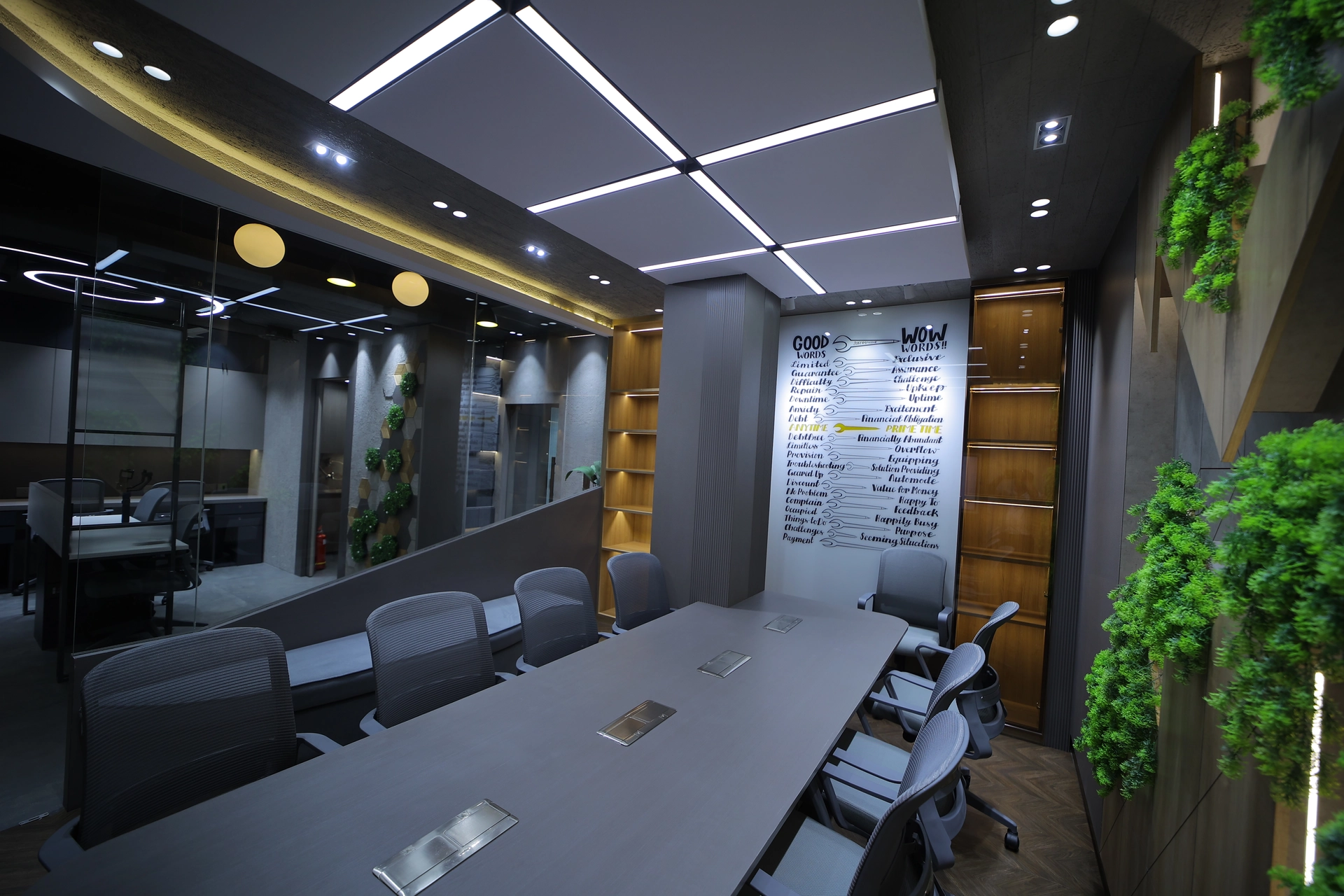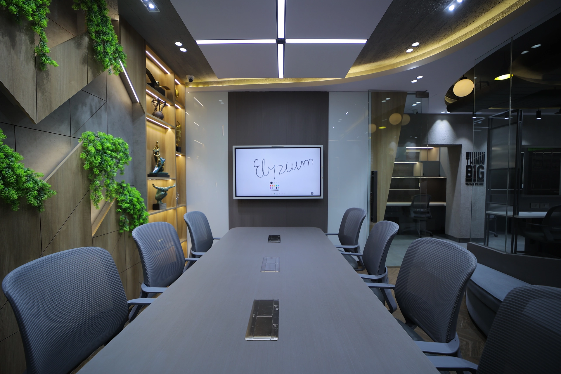 The room’s walls incorporate decorative shelving with artistic elements and plants, creating a vibrant, eco-friendly ambiance. The ceiling showcases geometric light panels, complementing the contemporary decor. The design combines functionality with aesthetic appeal, perfect for professional meetings.