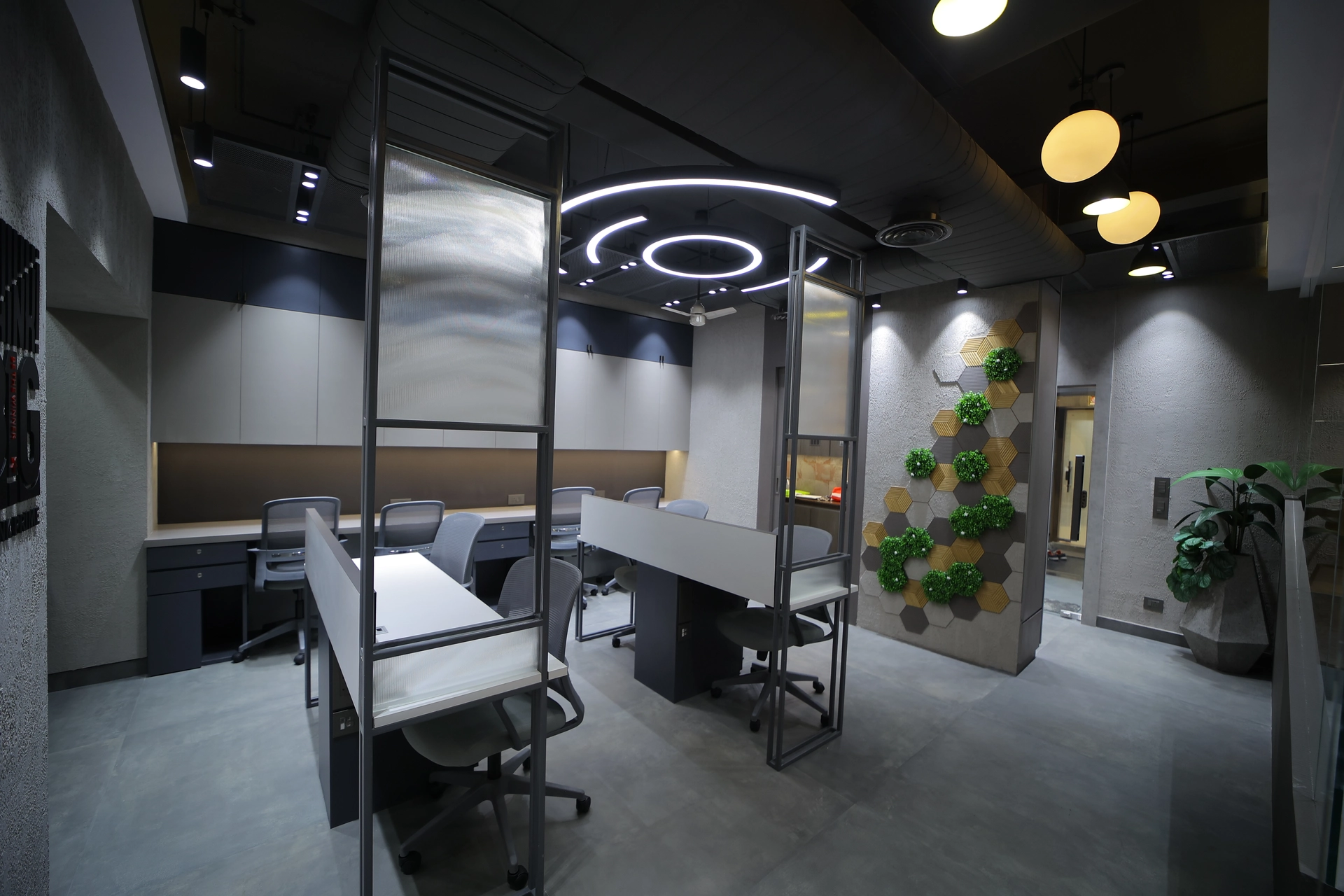 This cutting-edge workspace redefines modern office design with its seamless blend of innovation and elegance. The bold statement wall inspires ambition, while ergonomic desks and sleek partitions ensure optimal comfort and focus. Illuminated shelving showcases creativity, complemented by lush greenery that breathes life into the space. It’s a dynamic haven where functionality meets inspiration, igniting collaboration and excellence.