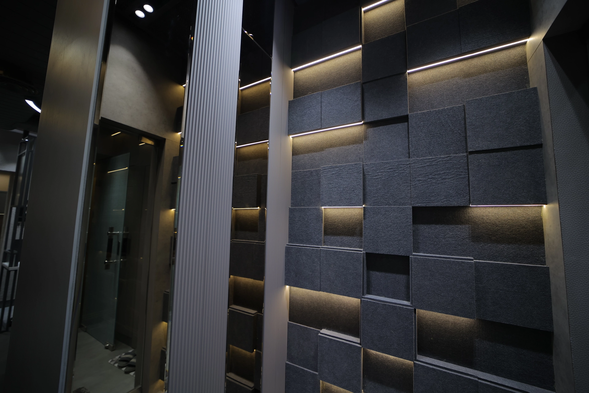 This contemporary interior project features a vibrant, patterned red carpet paired with warm recessed ceiling lighting, creating a luxurious atmosphere. Decorative wall panels, mirrors on structural columns, and golden accents add sophistication. The use of geometric elements and a mix of textures highlights a modern aesthetic, ideal for multipurpose event spaces like banquet halls.