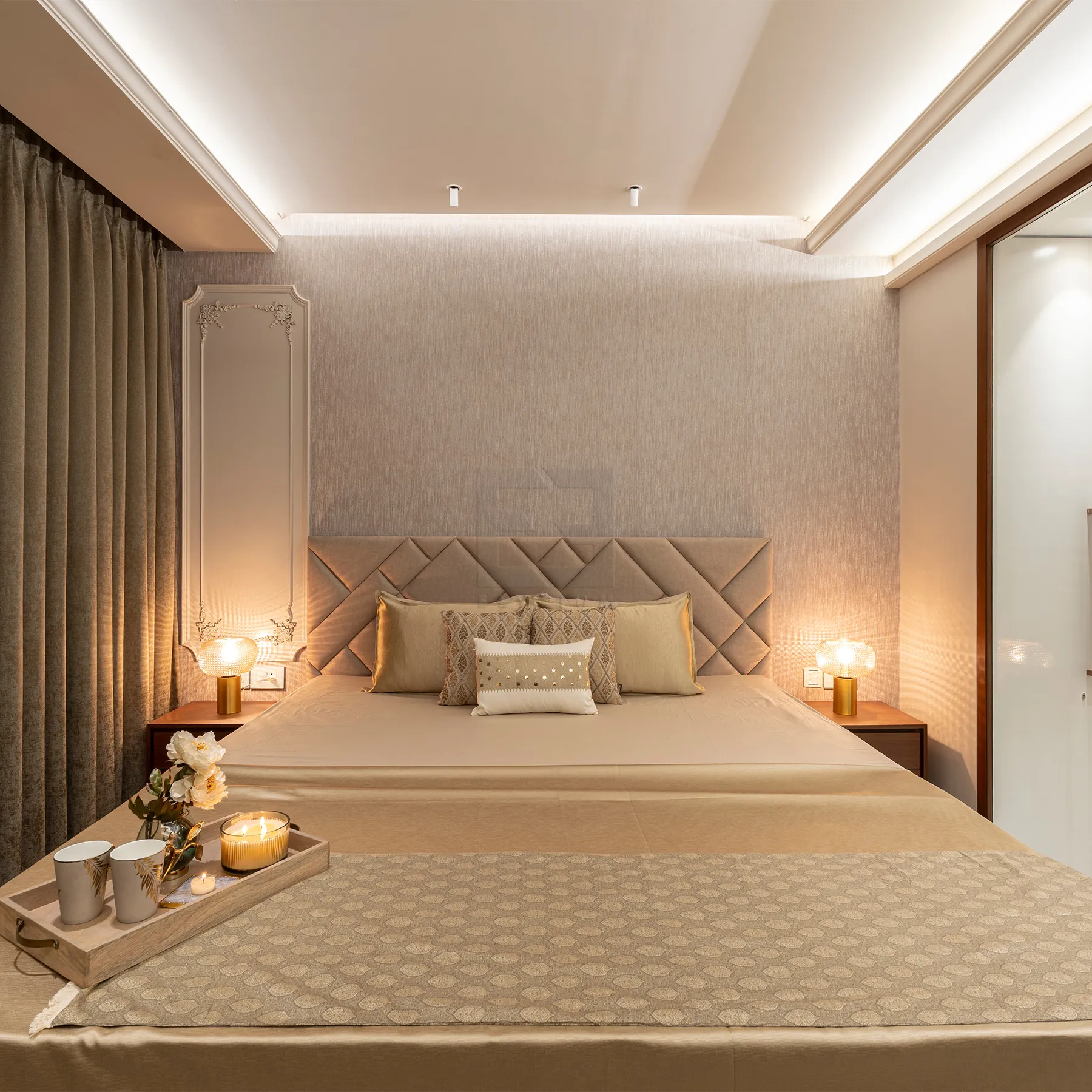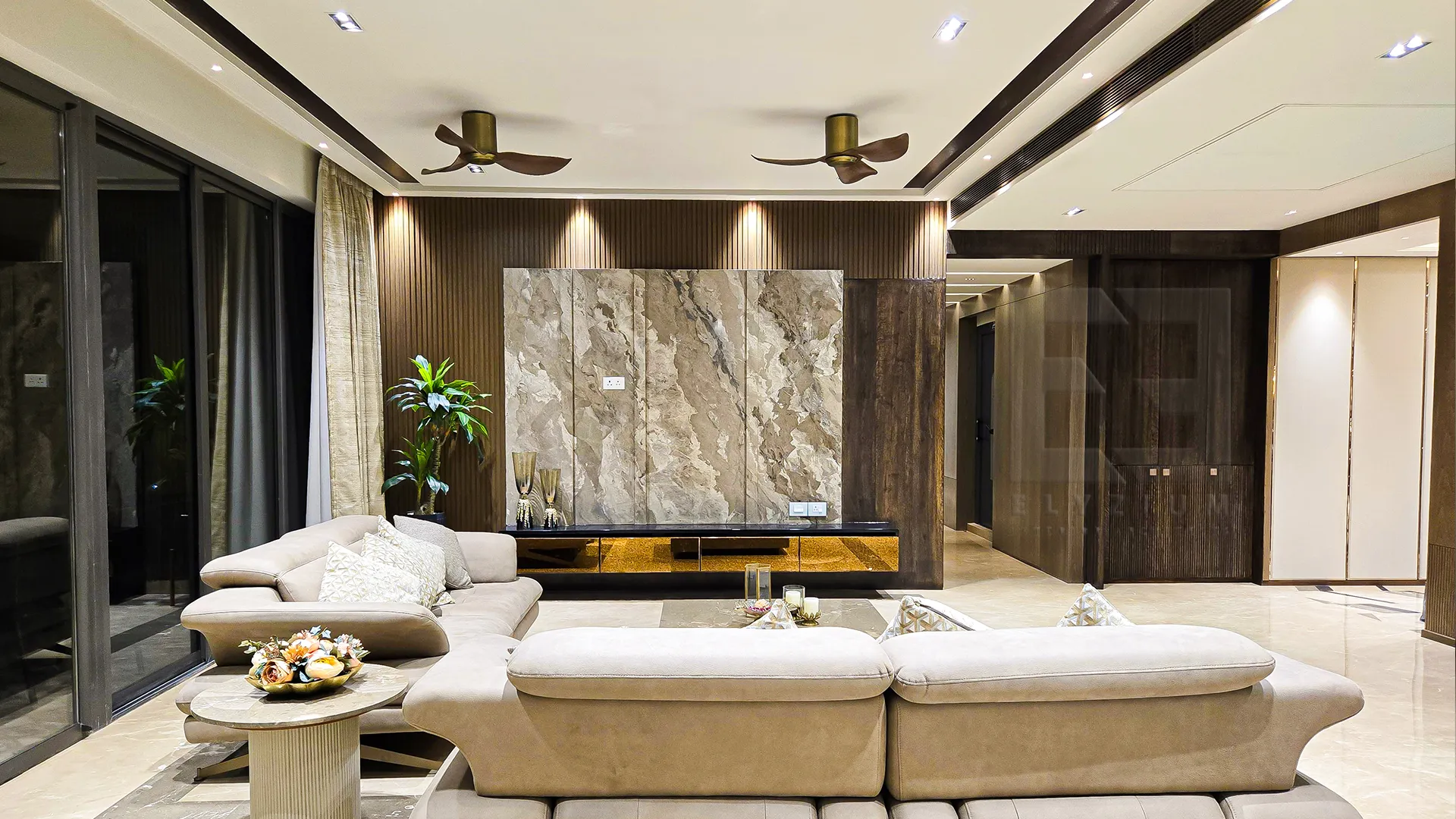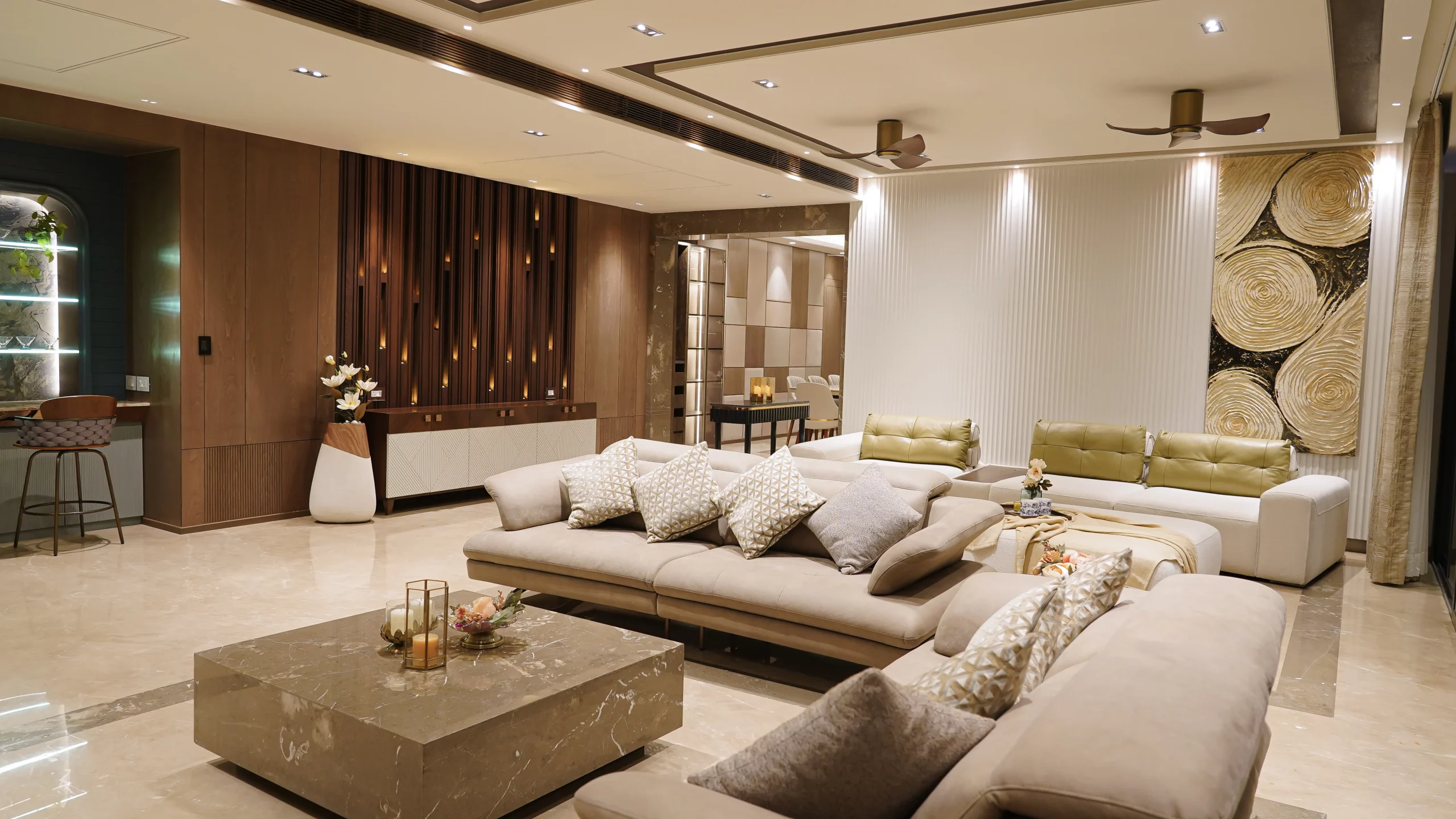 This sophisticated living room showcases a harmonious blend of neutral tones and modern aesthetics. Designed for comfort and elegance, it features plush modular seating, textured curtains, and warm ambient lighting. The ceiling design, natural stone center table, and accent wall with wood-cut art elements add a luxurious touch, creating a serene yet contemporary space ideal for both relaxation and entertaining.