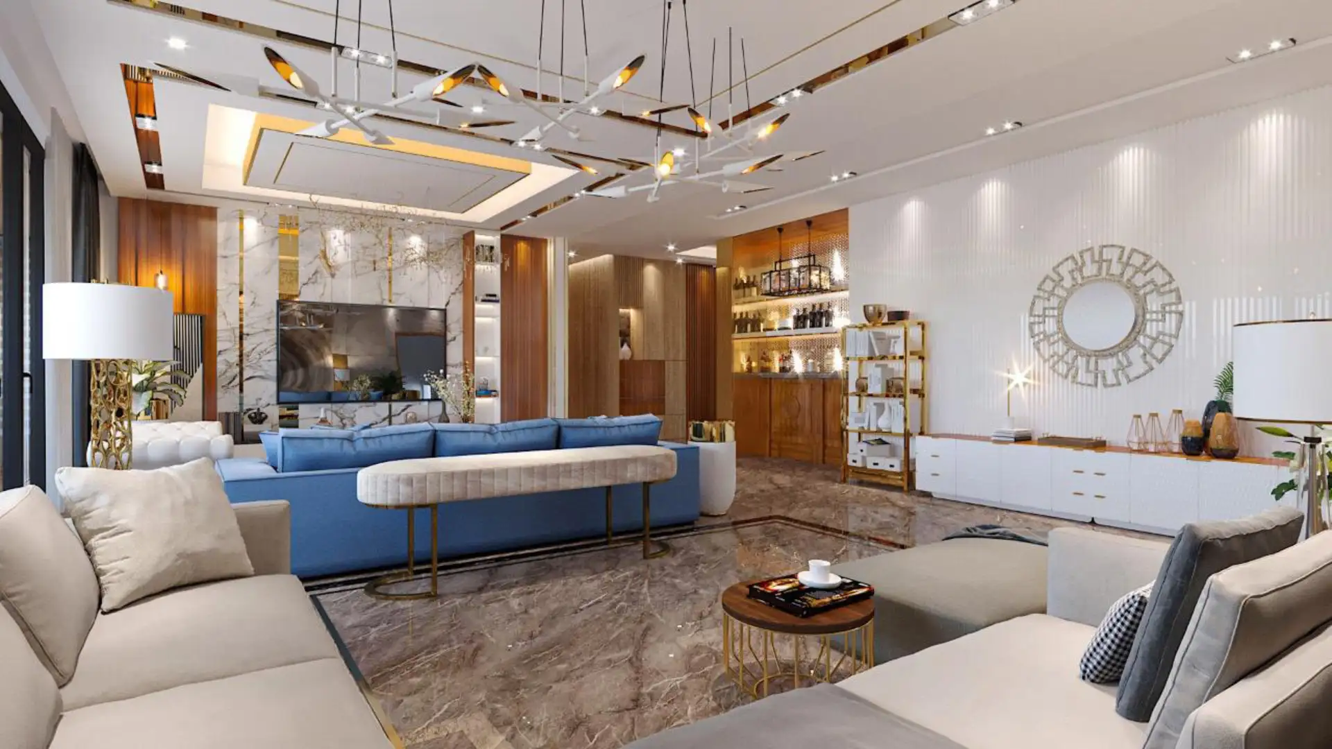 This sophisticated living room showcases a harmonious blend of neutral tones and modern aesthetics. Designed for comfort and elegance, it features plush modular seating, textured curtains, and warm ambient lighting. The ceiling design, natural stone center table, and accent wall with wood-cut art elements add a luxurious touch, creating a serene yet contemporary space ideal for both relaxation and entertaining.